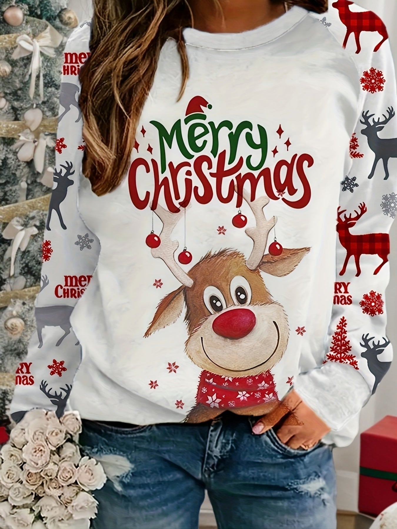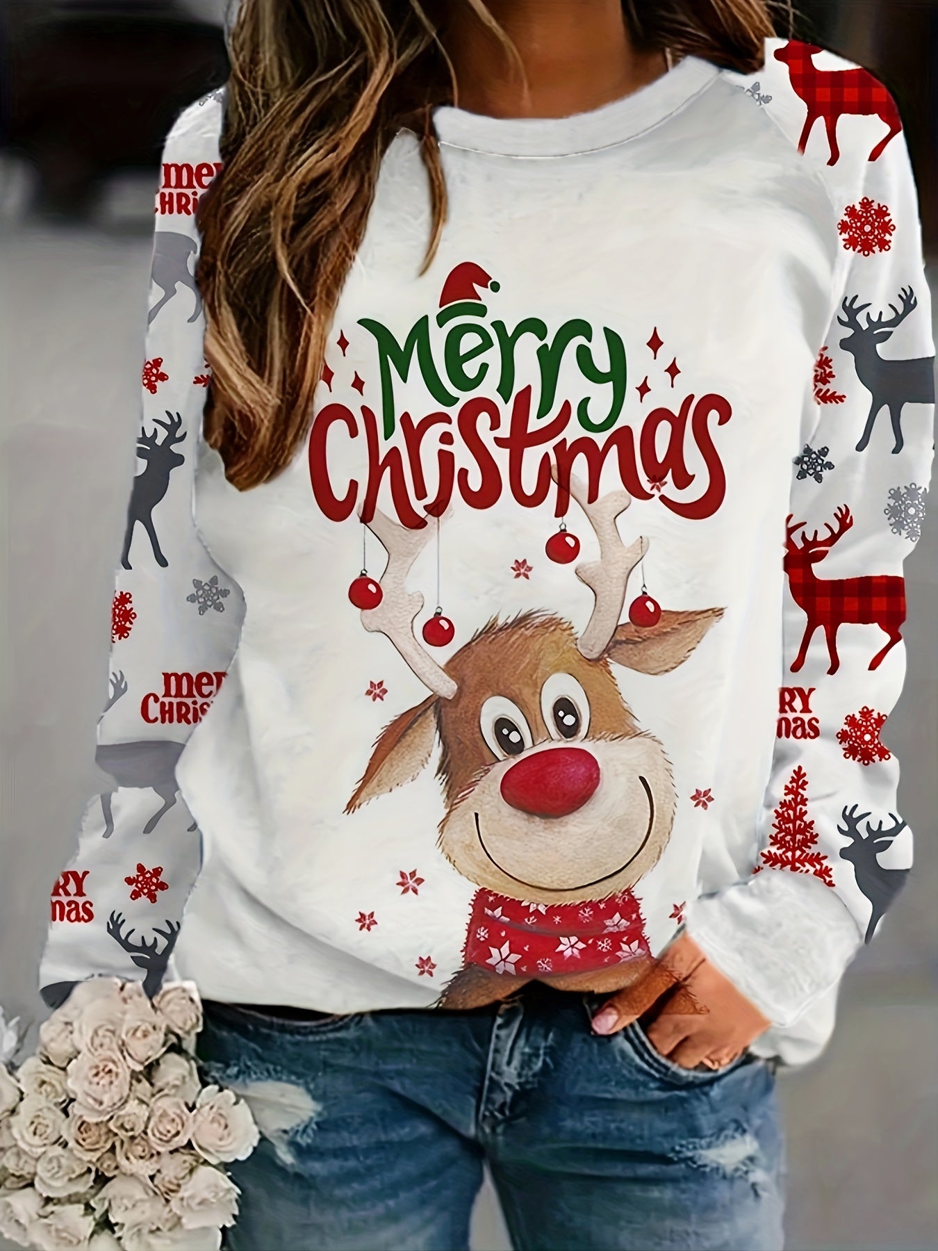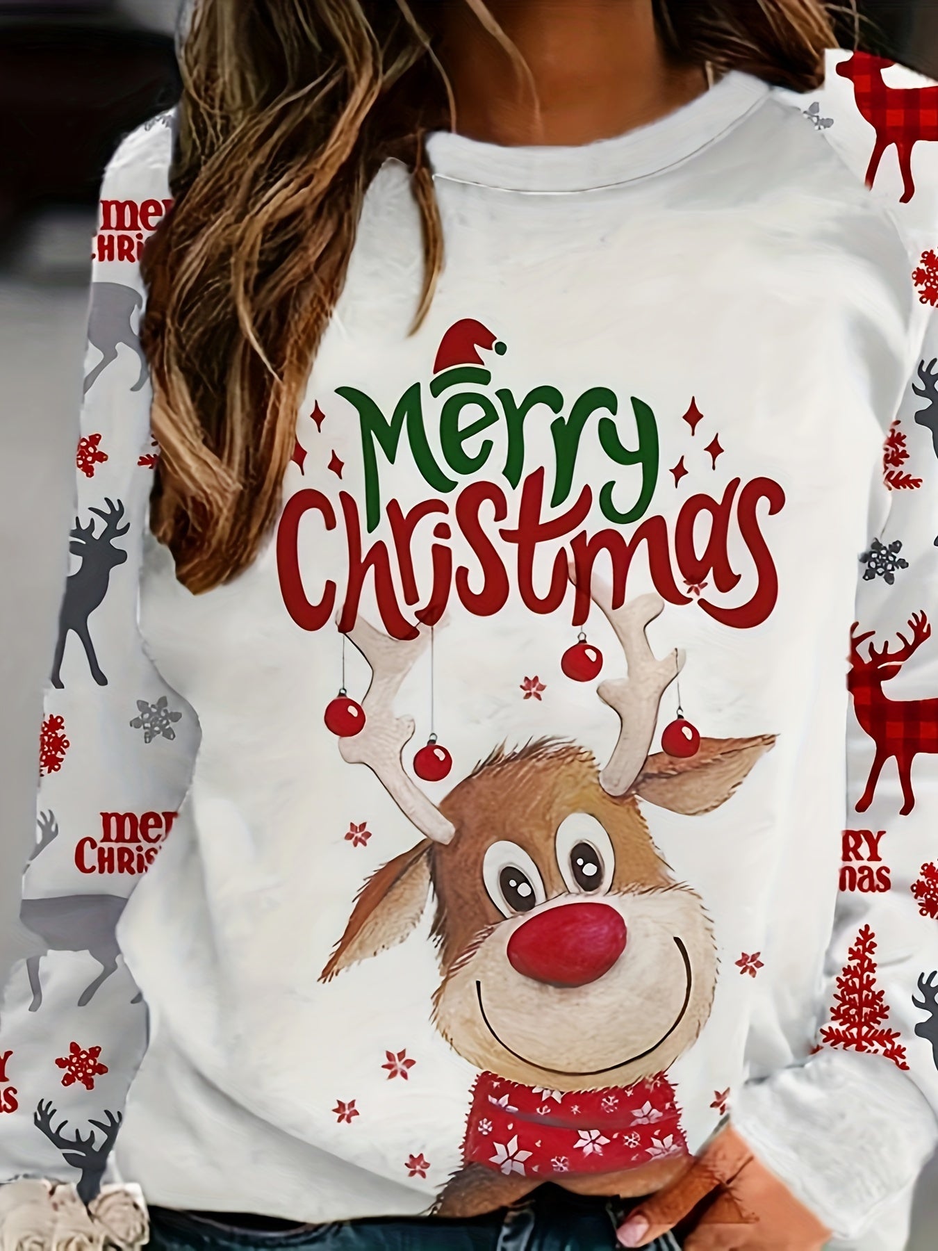 Merry Christmas Reindeer Print Casual Crew Neck Sweatshirt - 100% Polyester, Raglan Long Sleeve, Knit Fabric, Slight Stretch, Regular Fit Pullover for Spring/Fall