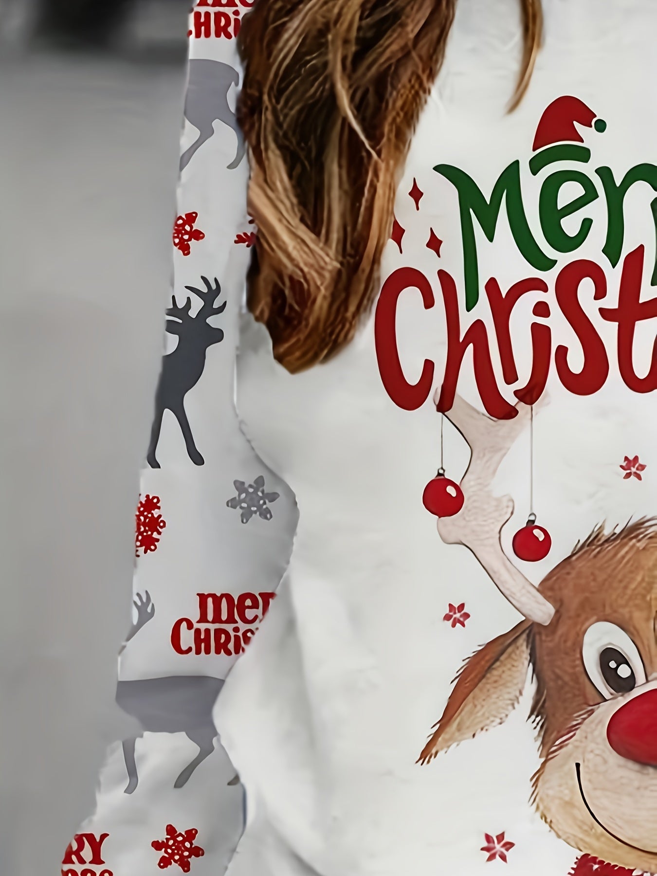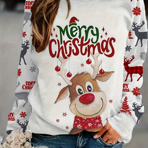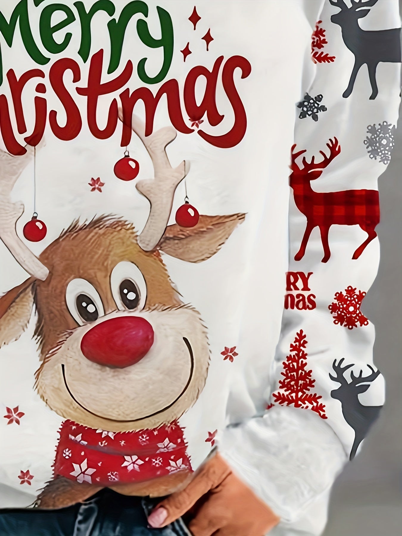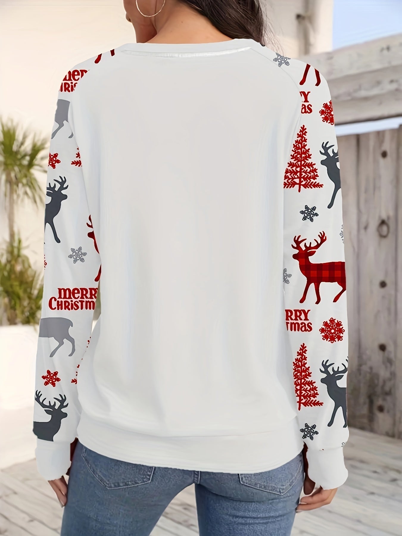 Merry Christmas Reindeer Print Casual Crew Neck Sweatshirt - 100% Polyester, Raglan Long Sleeve, Knit Fabric, Slight Stretch, Regular Fit Pullover for Spring/Fall
