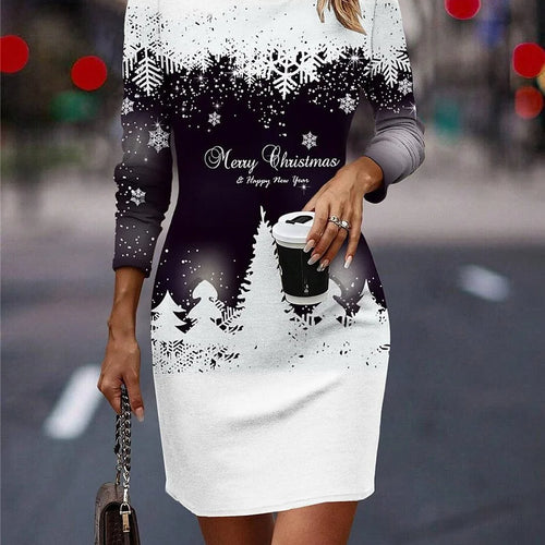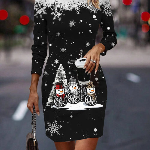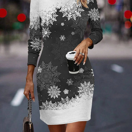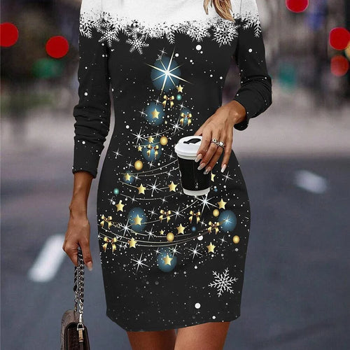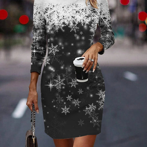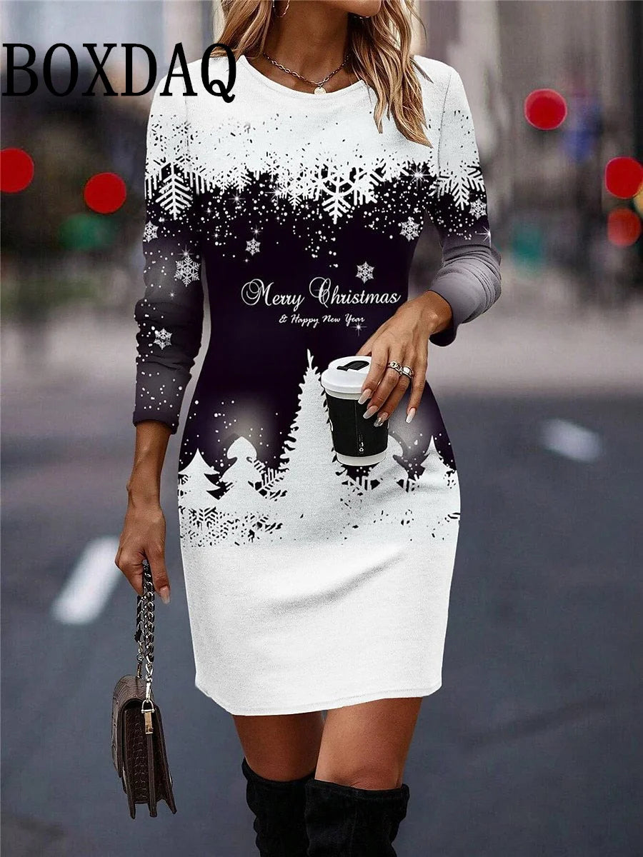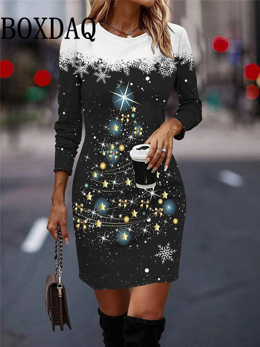 Round Neck Long-Sleeved Women's Party Dress Christmas Tree Snowflake Print A-Line Dress Winter Fashion Casual Loose Mini Dresses