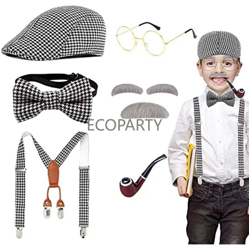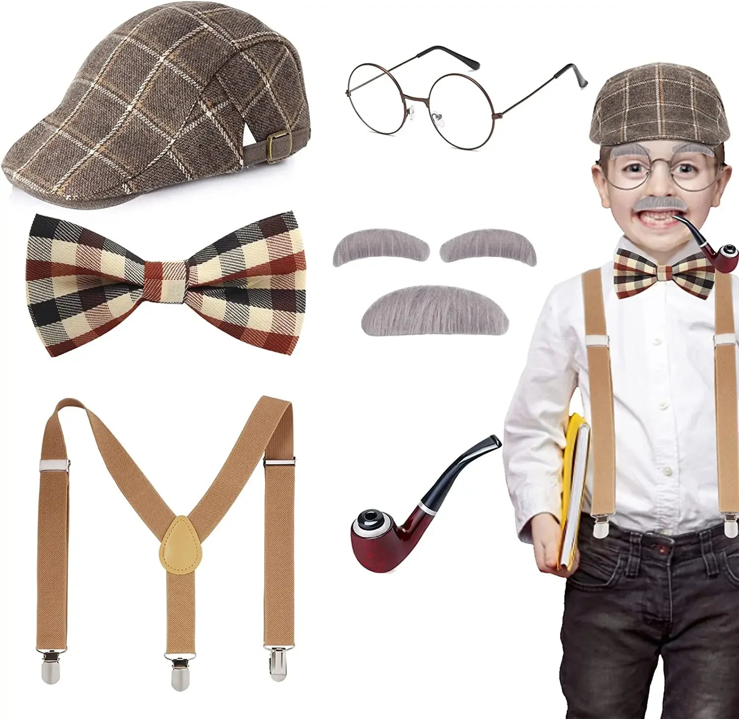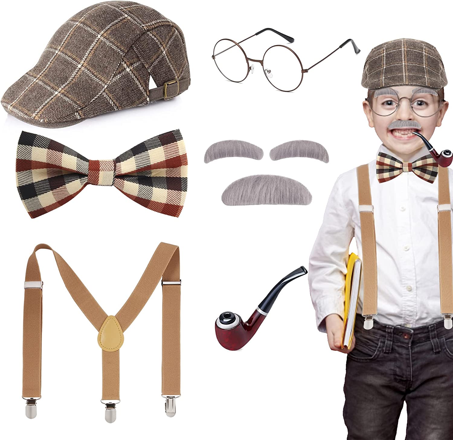 Old Man Costume for Kids100th Day of School Grandpa Costume Accessories Including Beret Hat Suspender Bowtie Beard Gangster