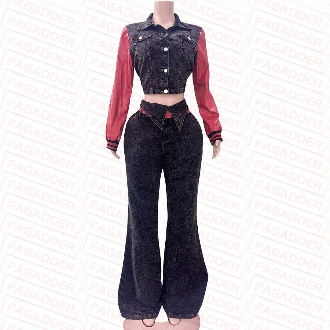FAGADOER Retro Quality Denim Women 2 Piece Set Outfit Trendy Leather Denim Patchwork Crop Jacket And High Waist Jeans Suits New