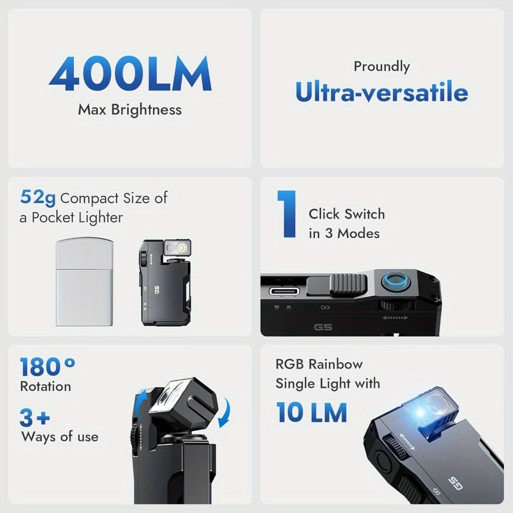G5 Rechargeable EDC Flashlight, 400 Lumens Dual-Source RGB Mini Flashlight, Portable Pocket Flashlight for Outdoor and Home Use with Magnetic Keychain - Black, Emergency Light, Sleek Design, Textured Grip, Camping Gear, Compa