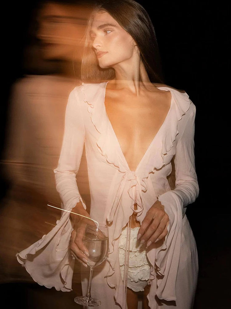 OIINAA Ruffle Bikini Cover-Ups Women Beach Cover Up Elegant Long Sleeve Lace Up Summer Solid Fashion Female Holiday Beachwear