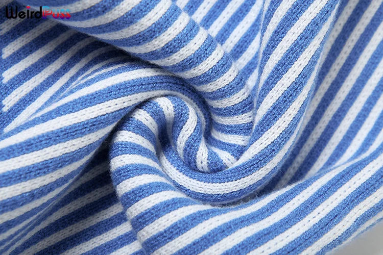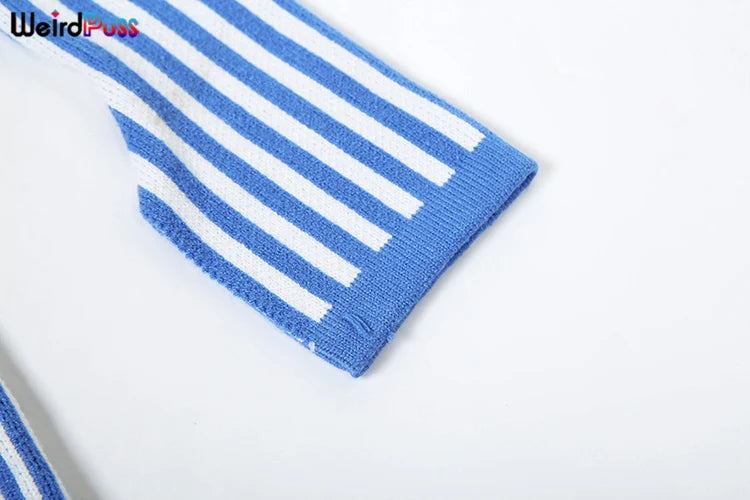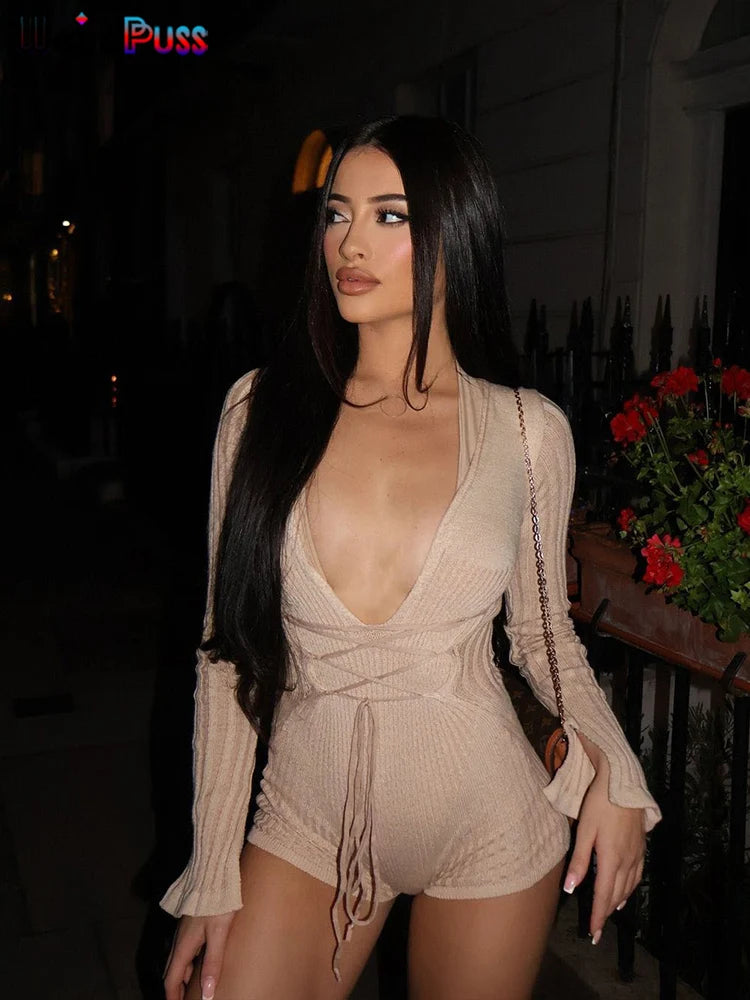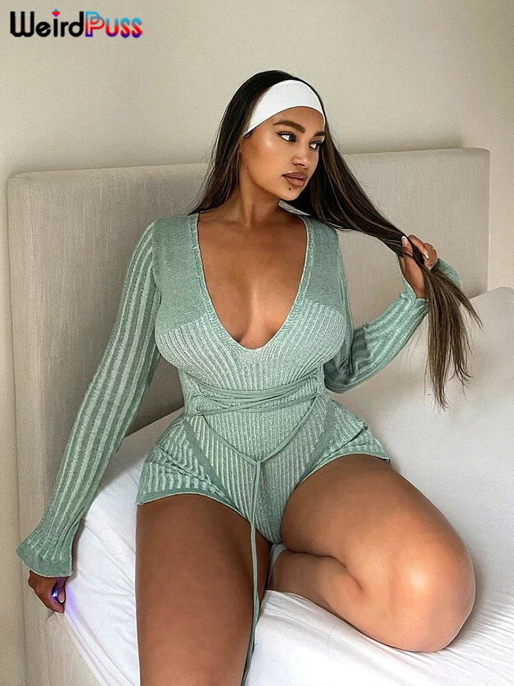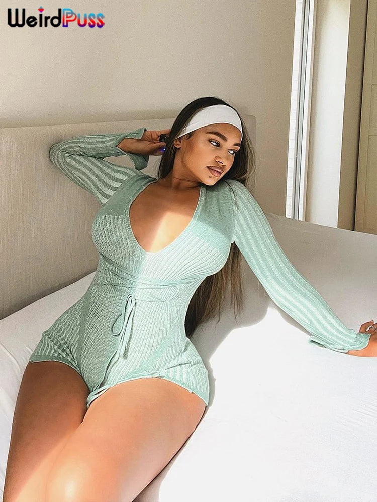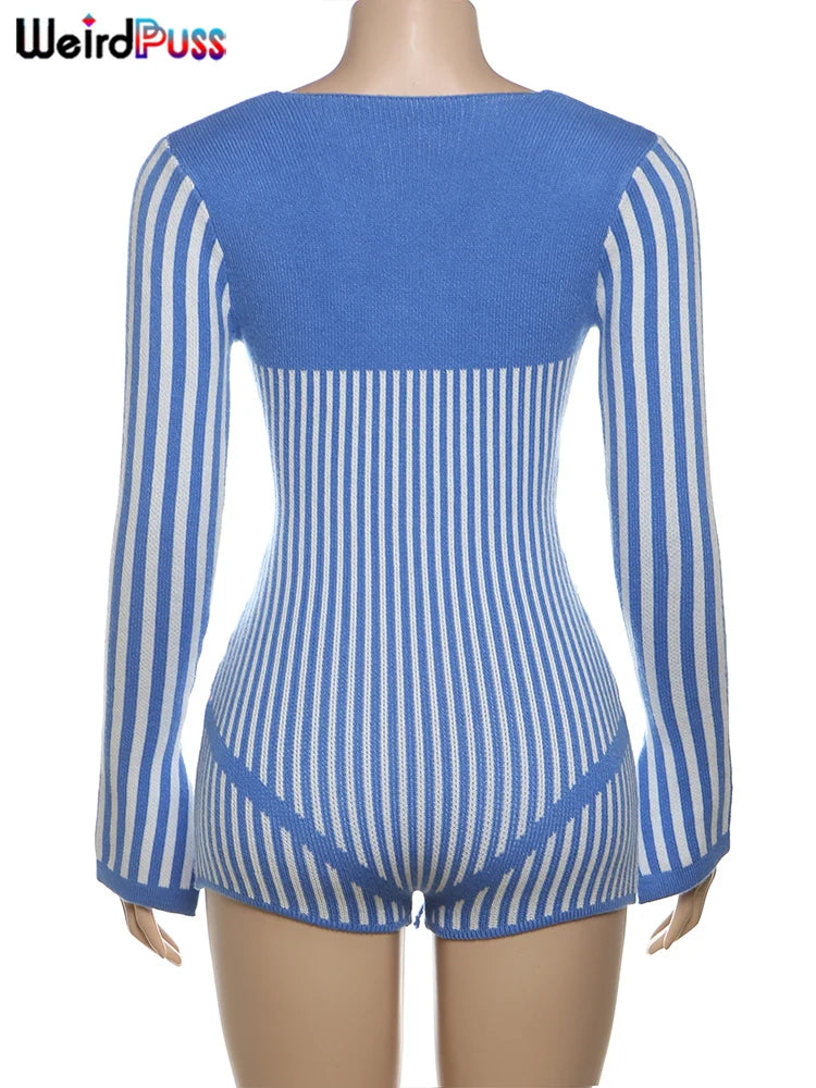 Weird Puss Crochet Bandage Playsuits Women Low-Neck Contrast Striped Patchwork Long Sleeve Autumn Trend Vacation Skinny Romper