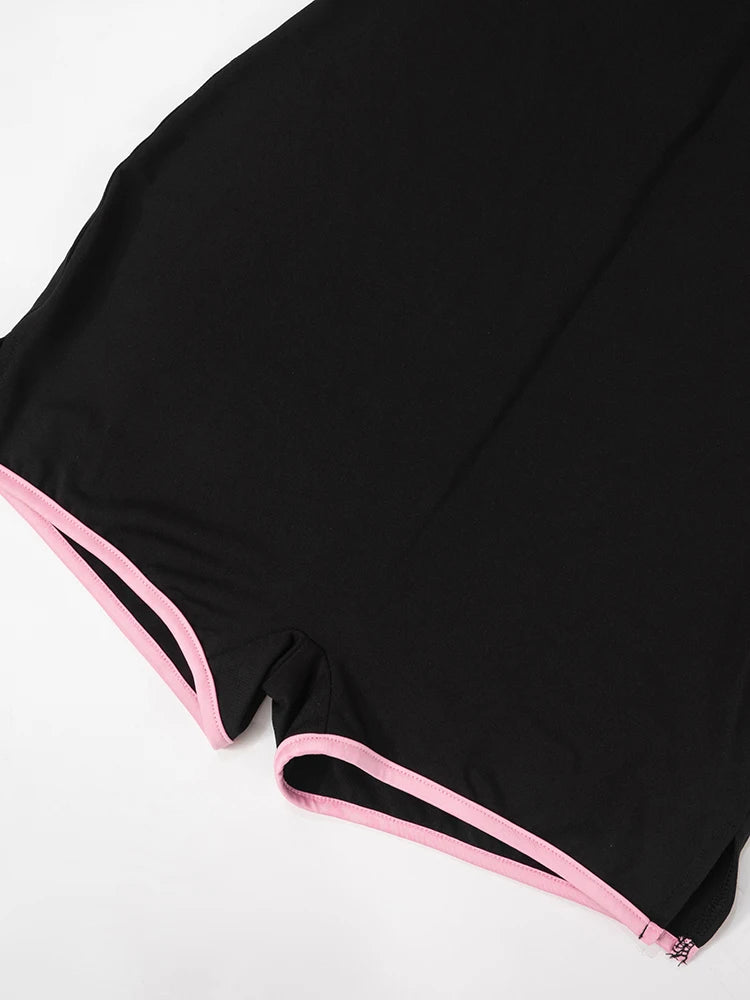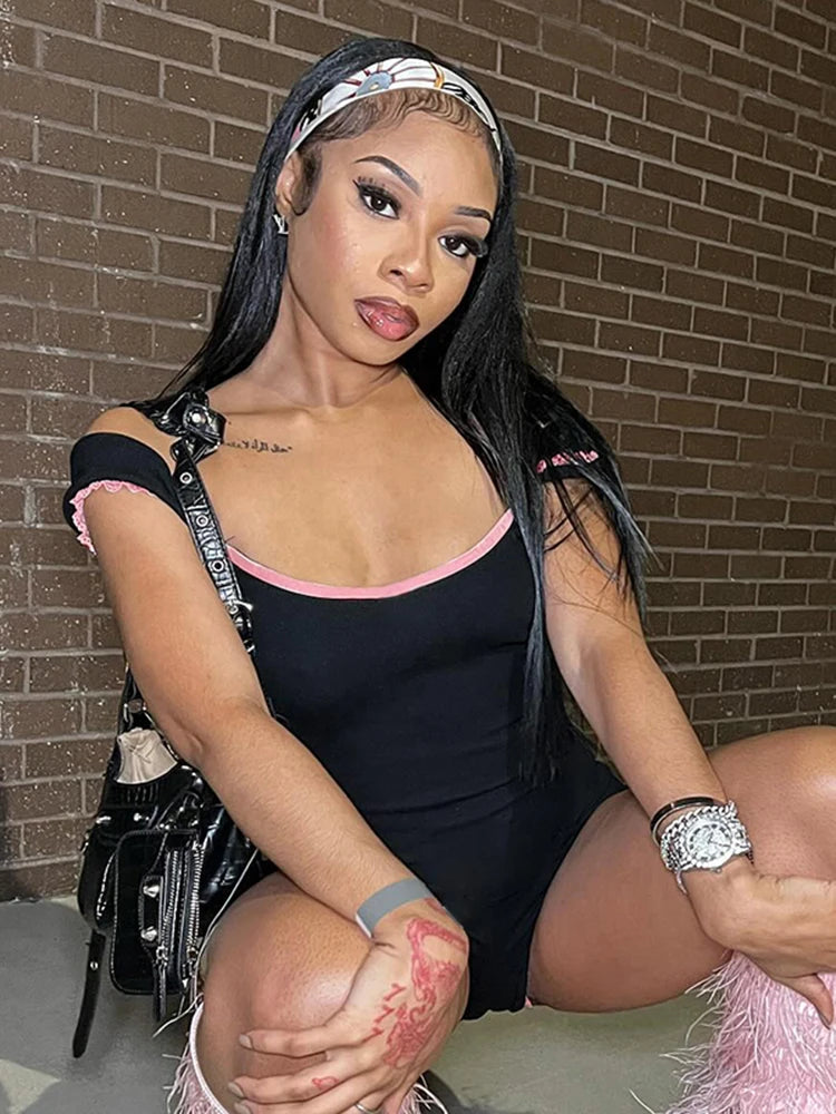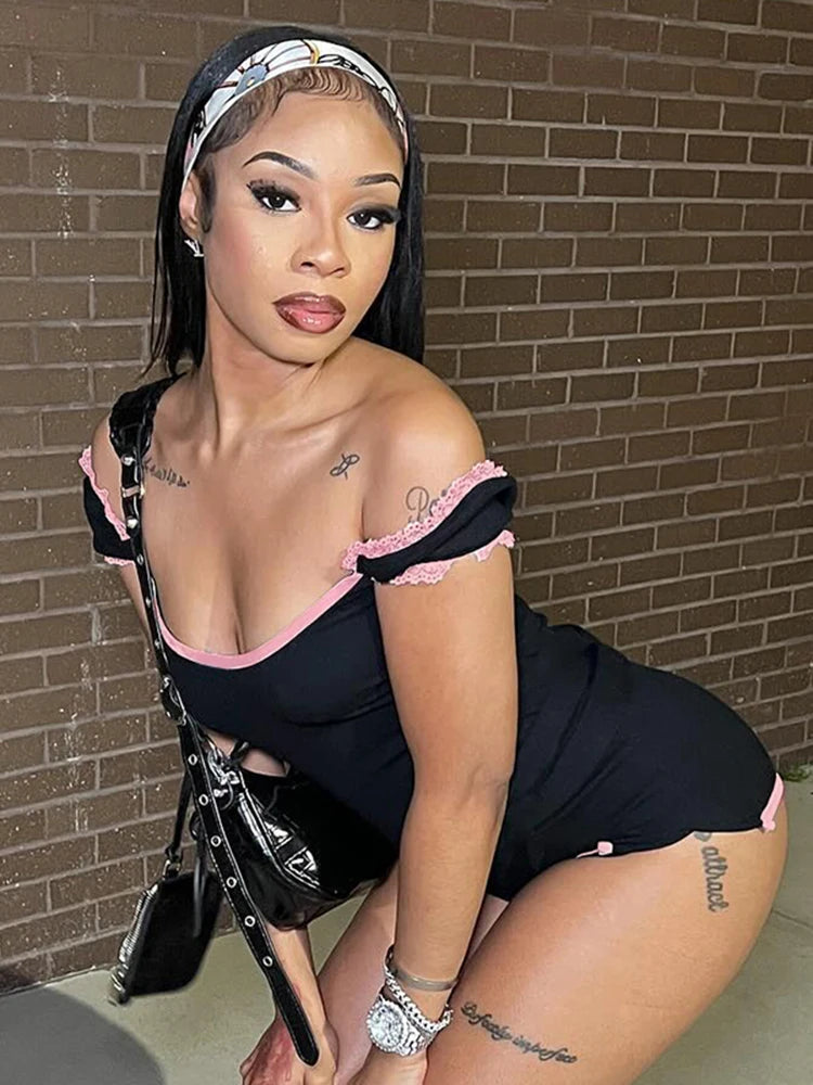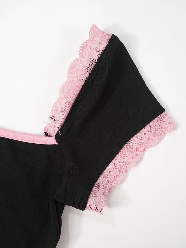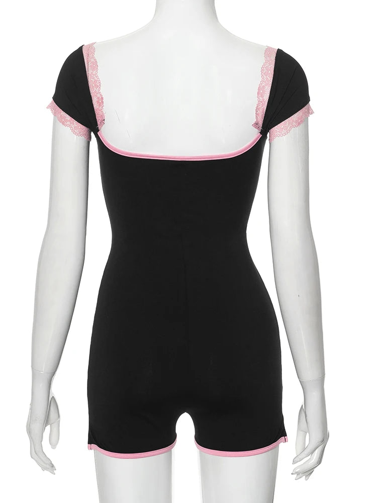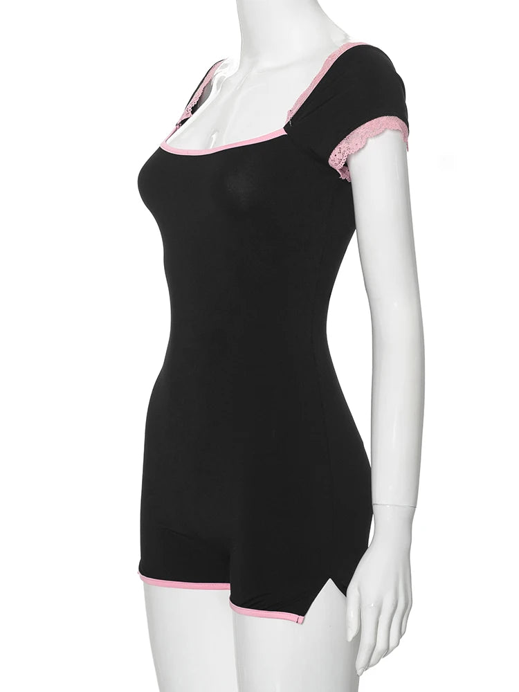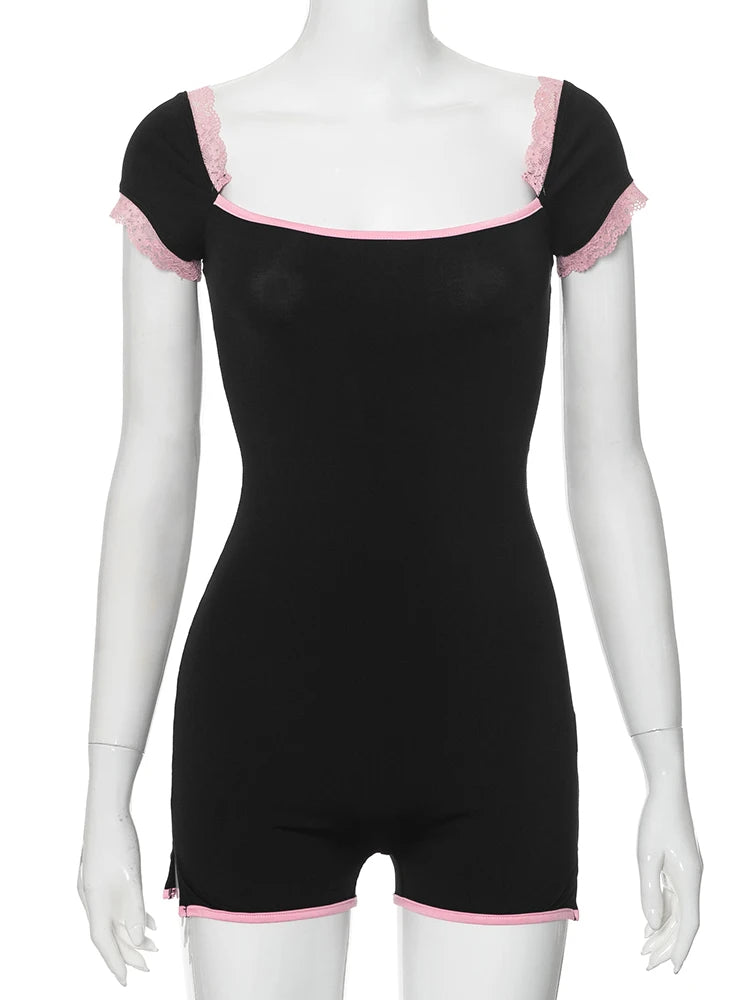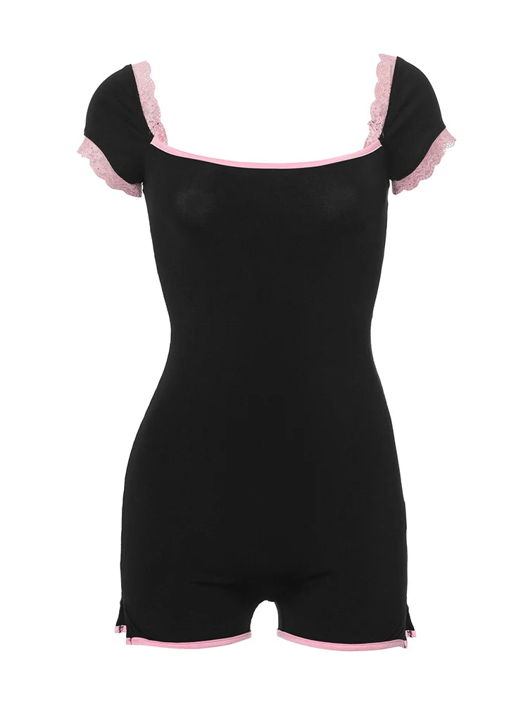 kliou Classic Patchwork Women Playsuits Casual Fashion Lace Trim Square Neck Short Sleeve Stretch Rompers Girls Daily Streetwear