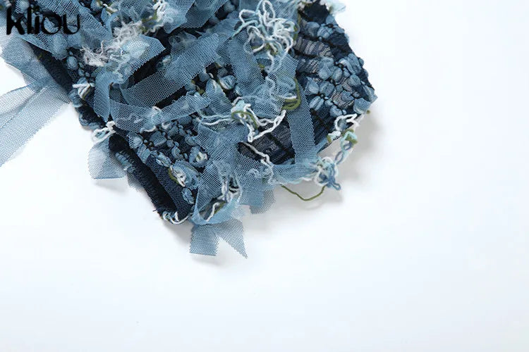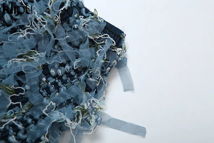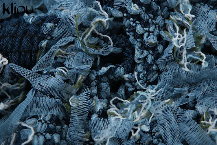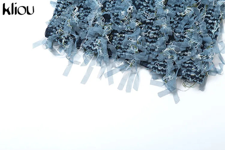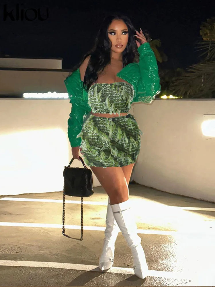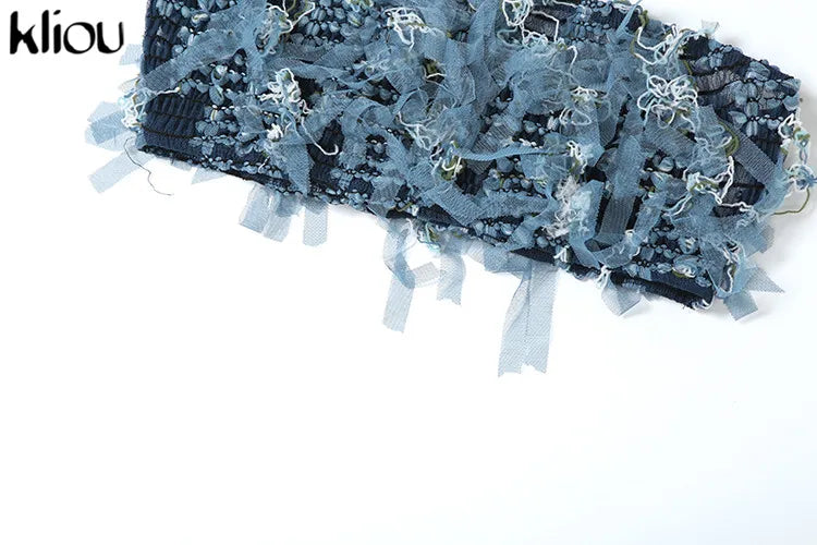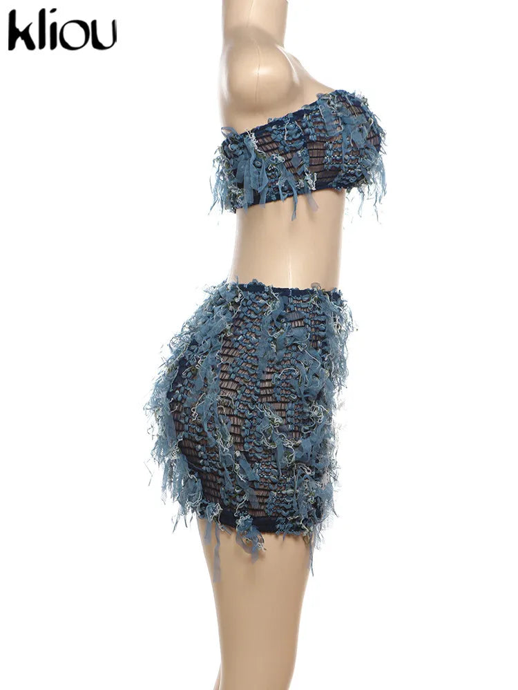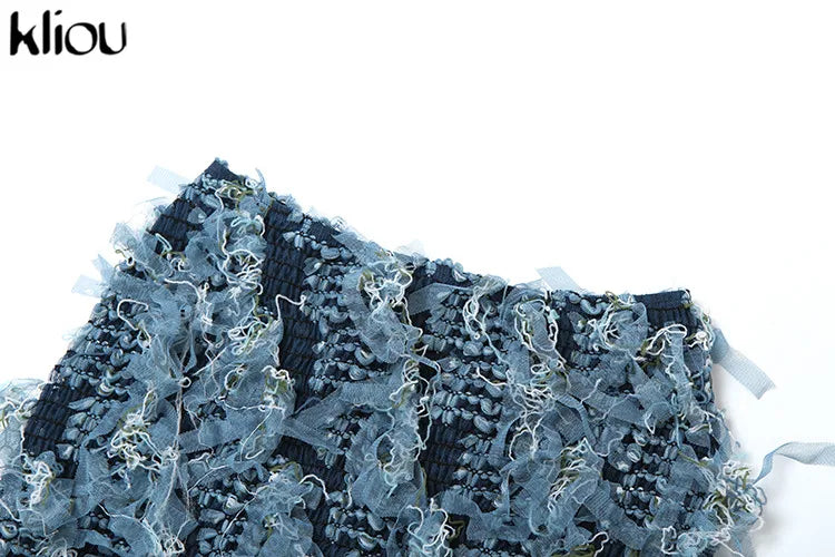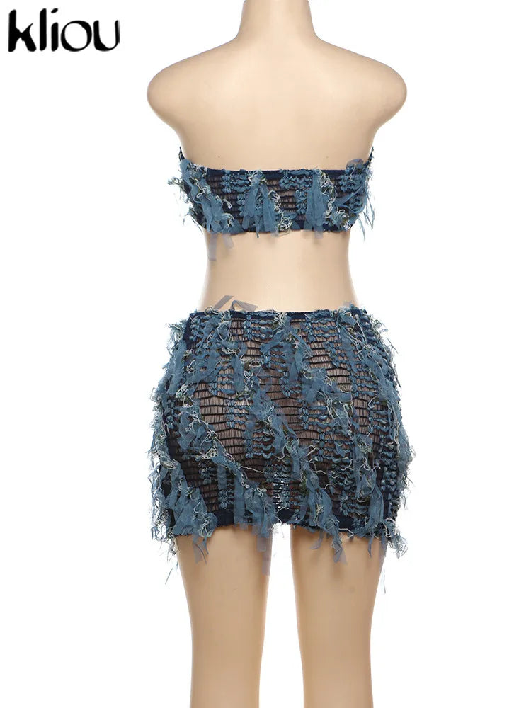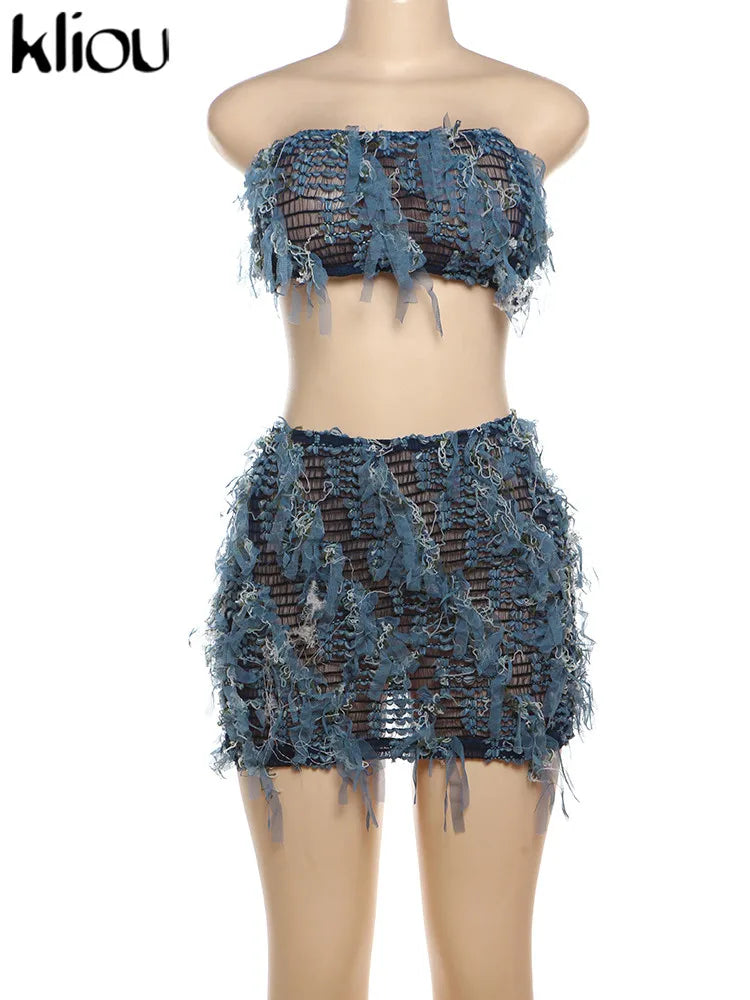 kliou Stacked Crochet 2 Piece Set Women Panelled Patchwork Wrapped Chest Crop Tanks+Sheer Slim Mini Skirts Female Street Outfits