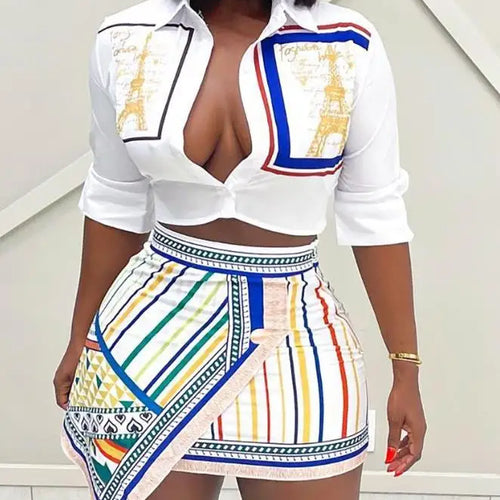 Two Piece Set Women Outfit 2024 Summer Fashion Graphic Print Buttoned Turn-Down Collar Shirt & Striped Asymmetrical Skirt Set
