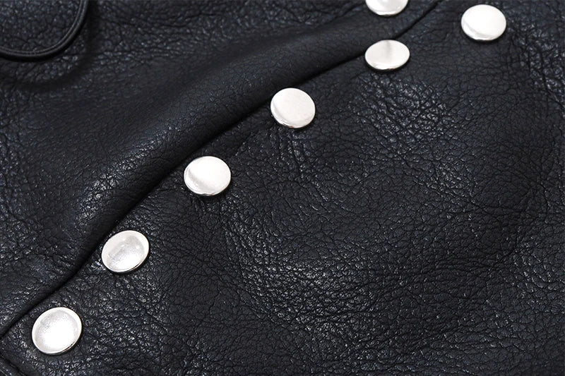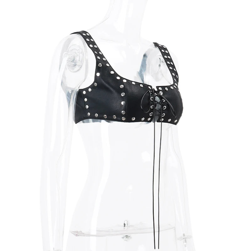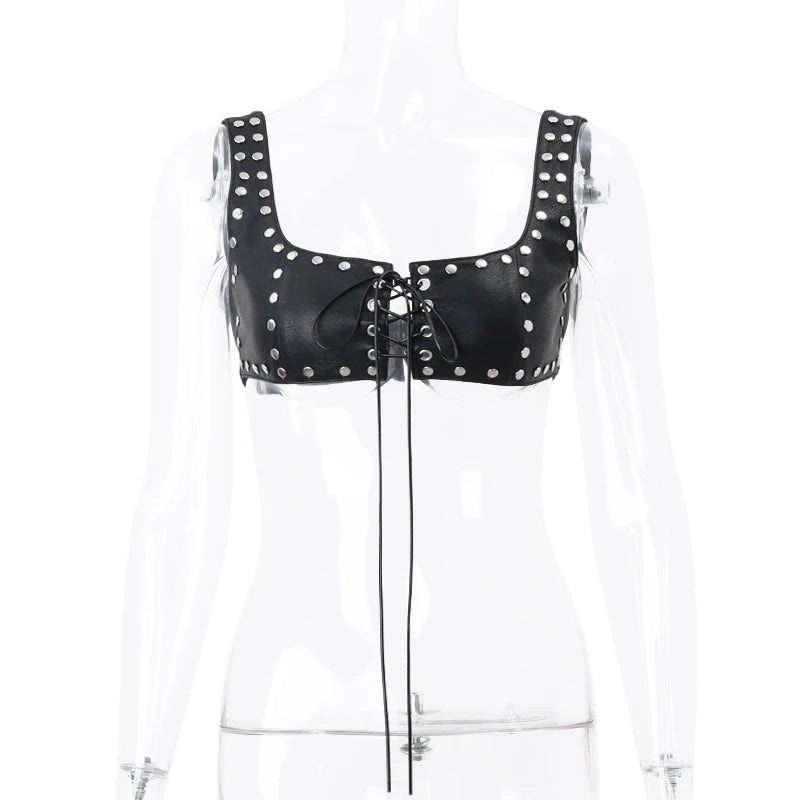 WhereMery Gothic PU Leather Bandage Tank Top Y2K Sexy Multi Rivet Backless Crop Tops 2024 Summer Punk Rock Evening Club Camisole