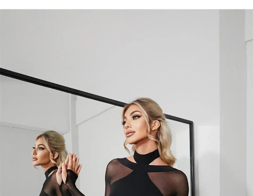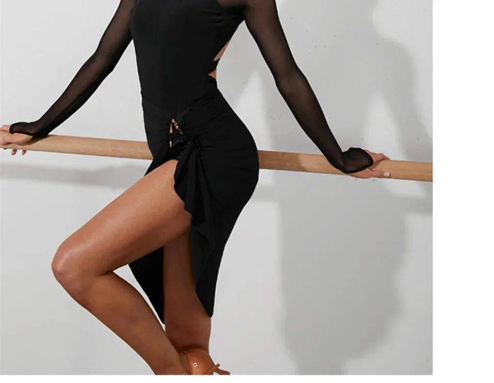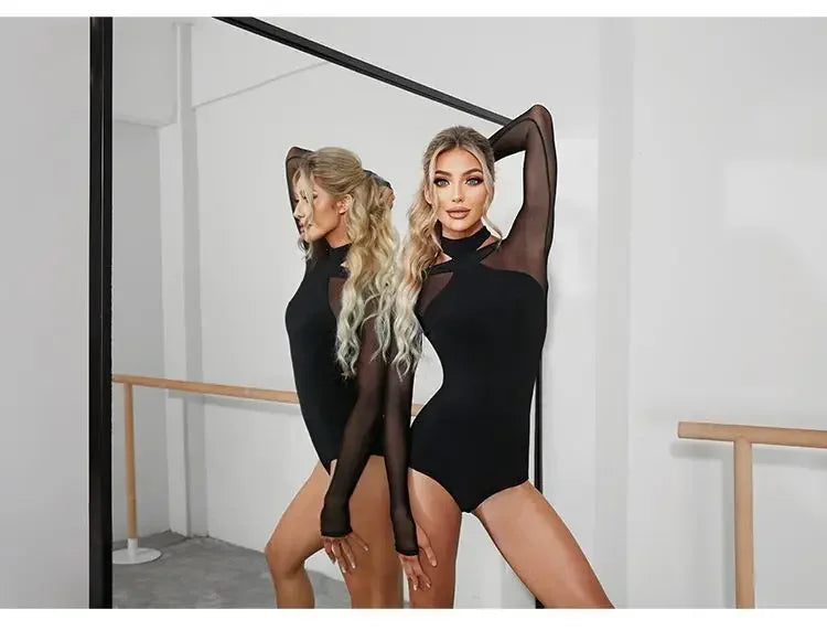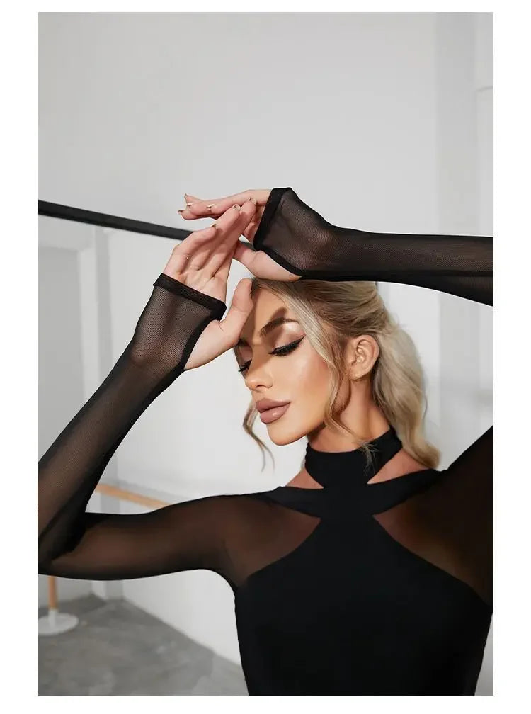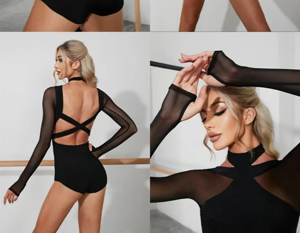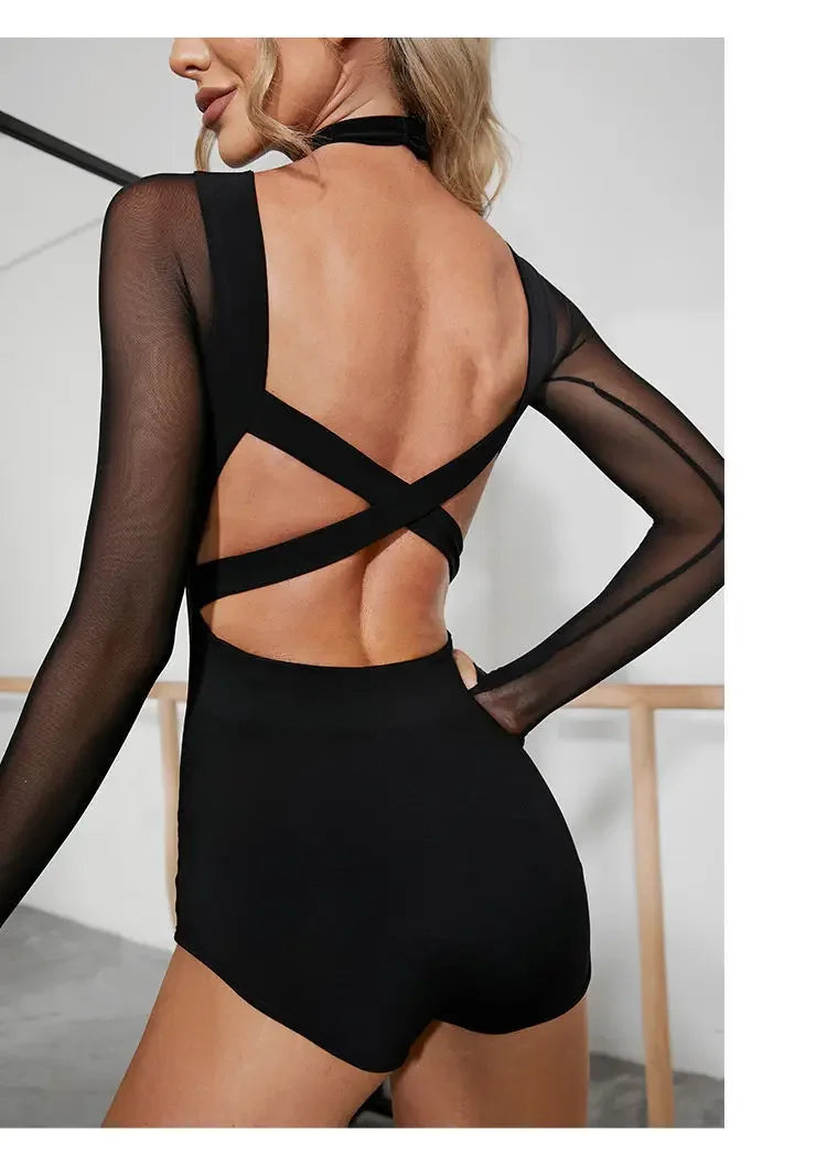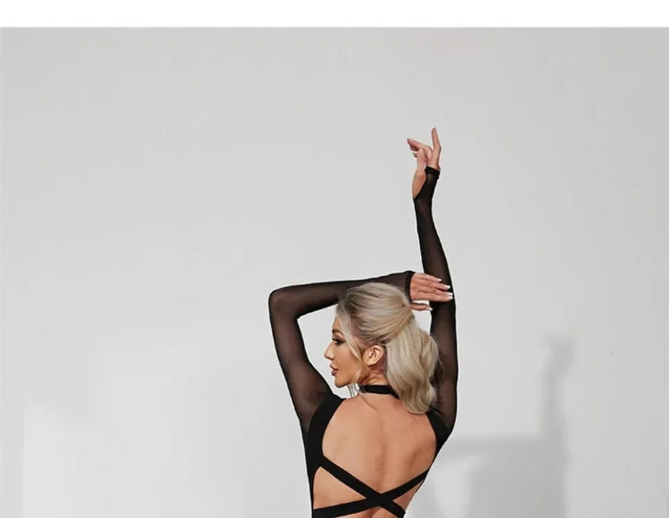 Women Latin Dance Body Top Black Mesh Conjoined Backless Cross Belt Pair It with Dance Dress Lingerie Training Performance