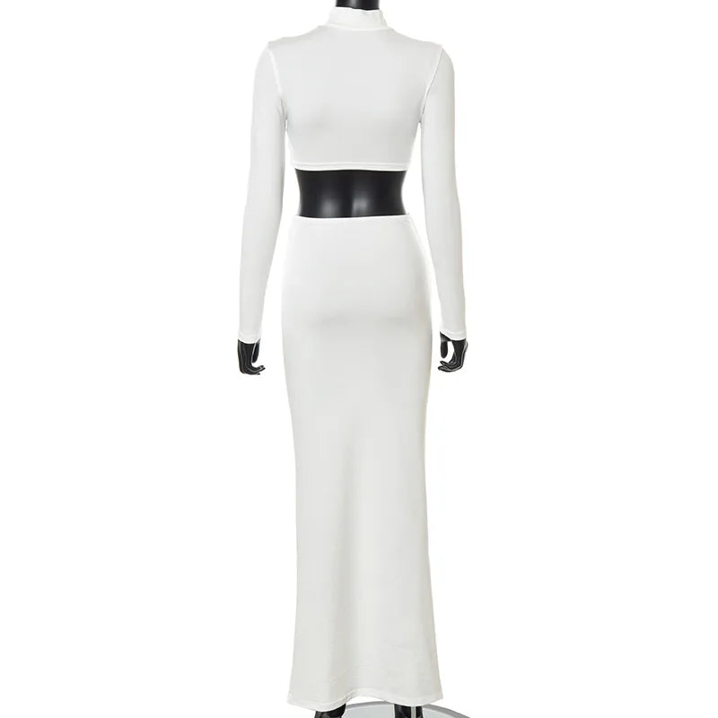 Cryptographic Elegant White Long Sleeve 2 Piece Set Outfits for Women Club Party Top and Dress Sets Long Ruched Matching Sets