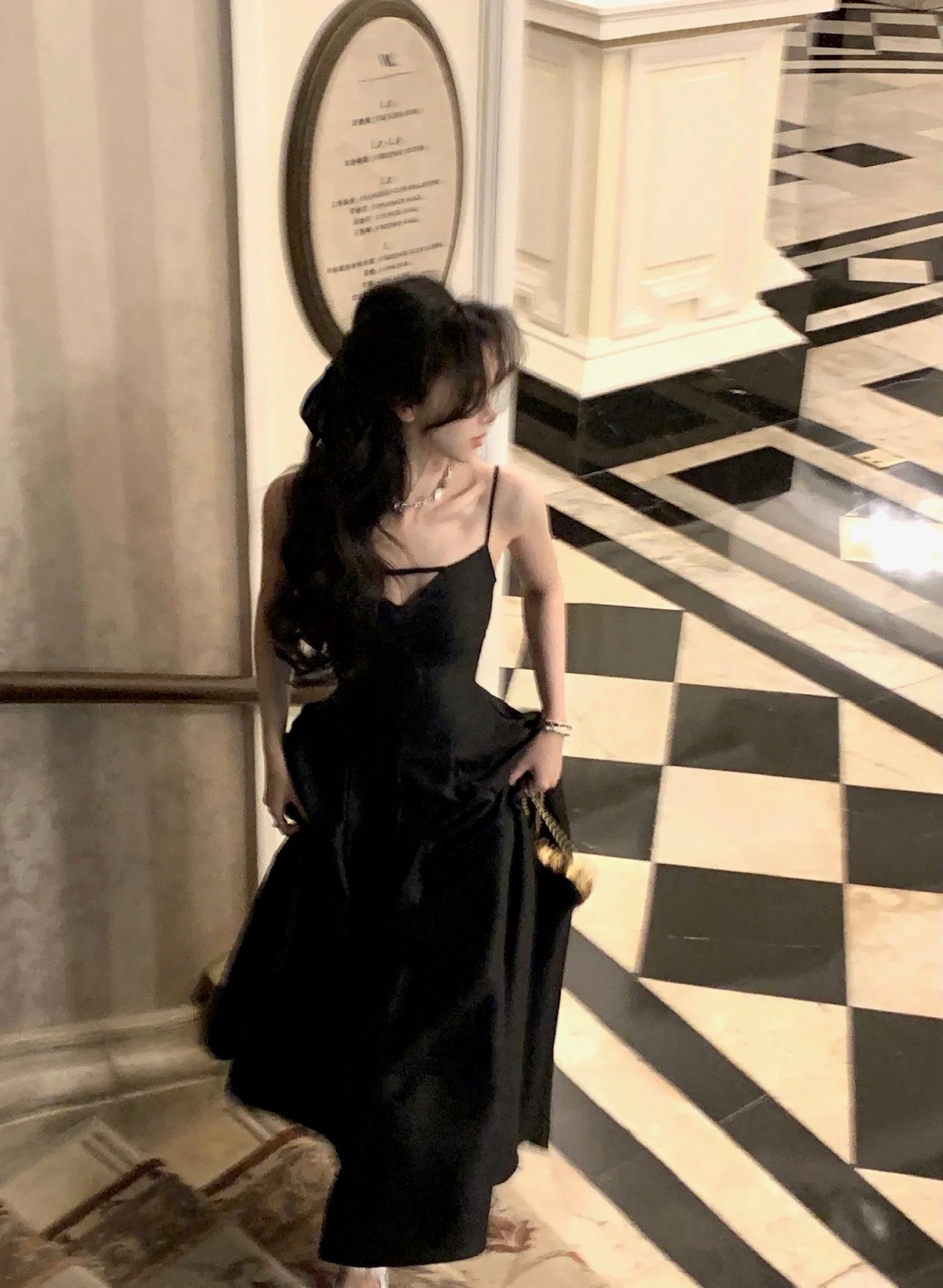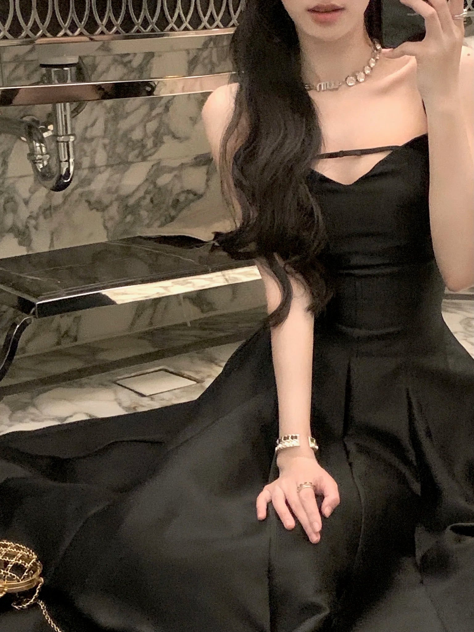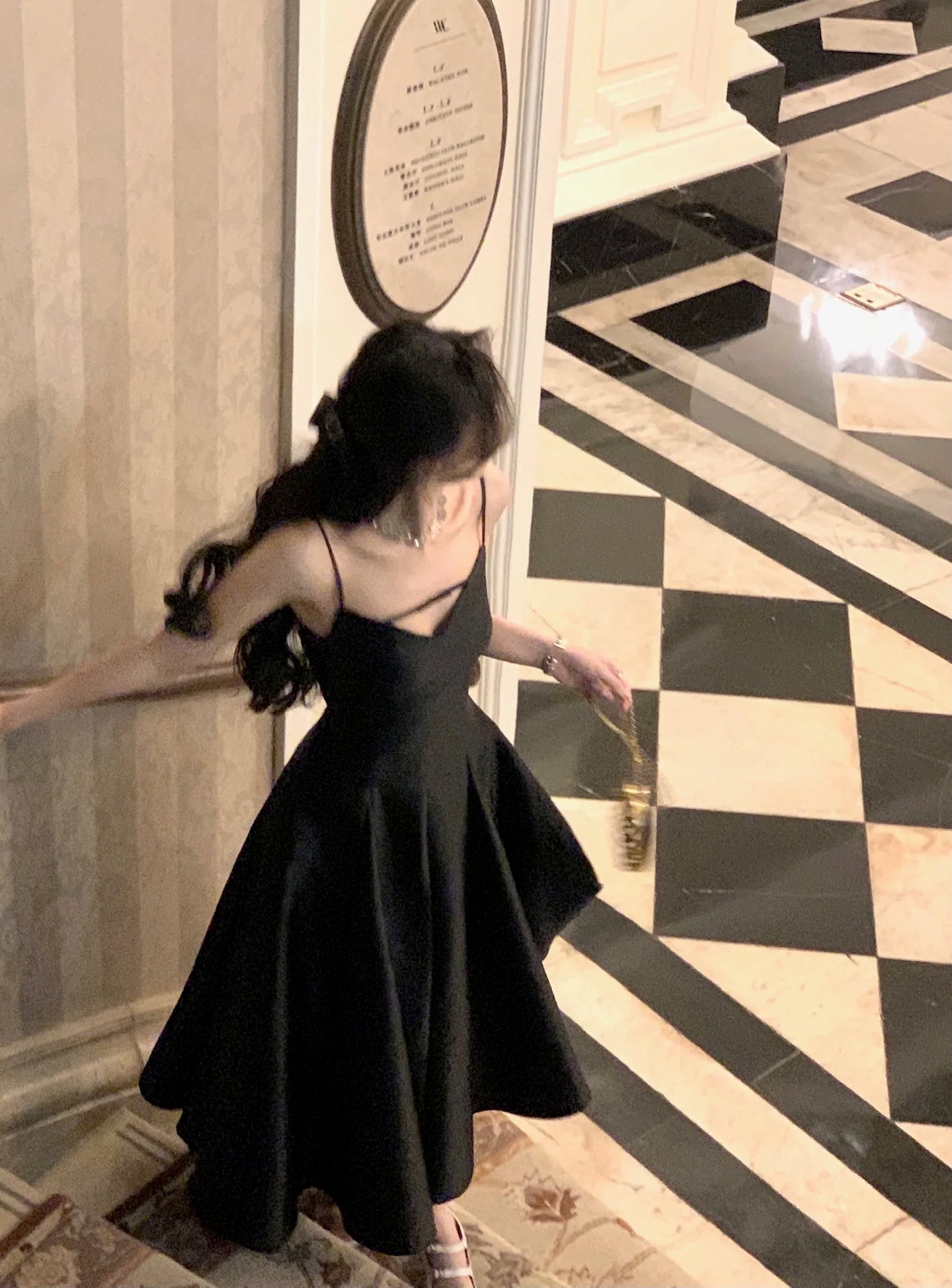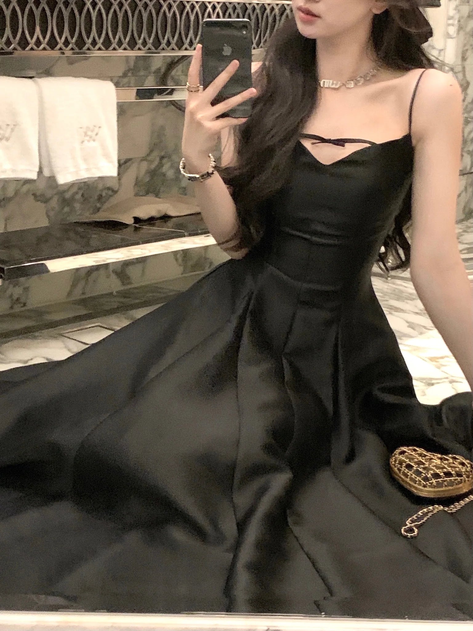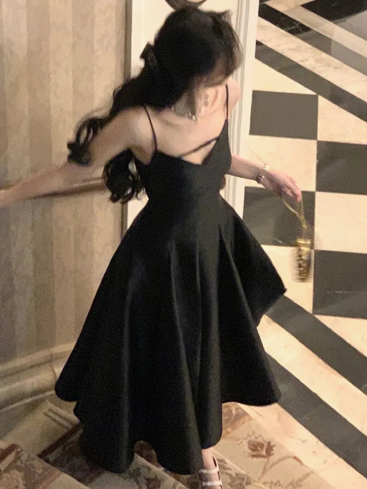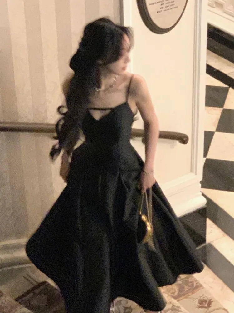 Elegant Solid Princess Evening Party Dress French Romantic Black Big Hem Graduation Dresses Korean Summer Strap Wedding Vestidos