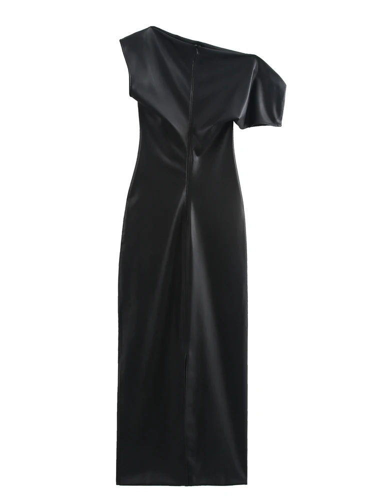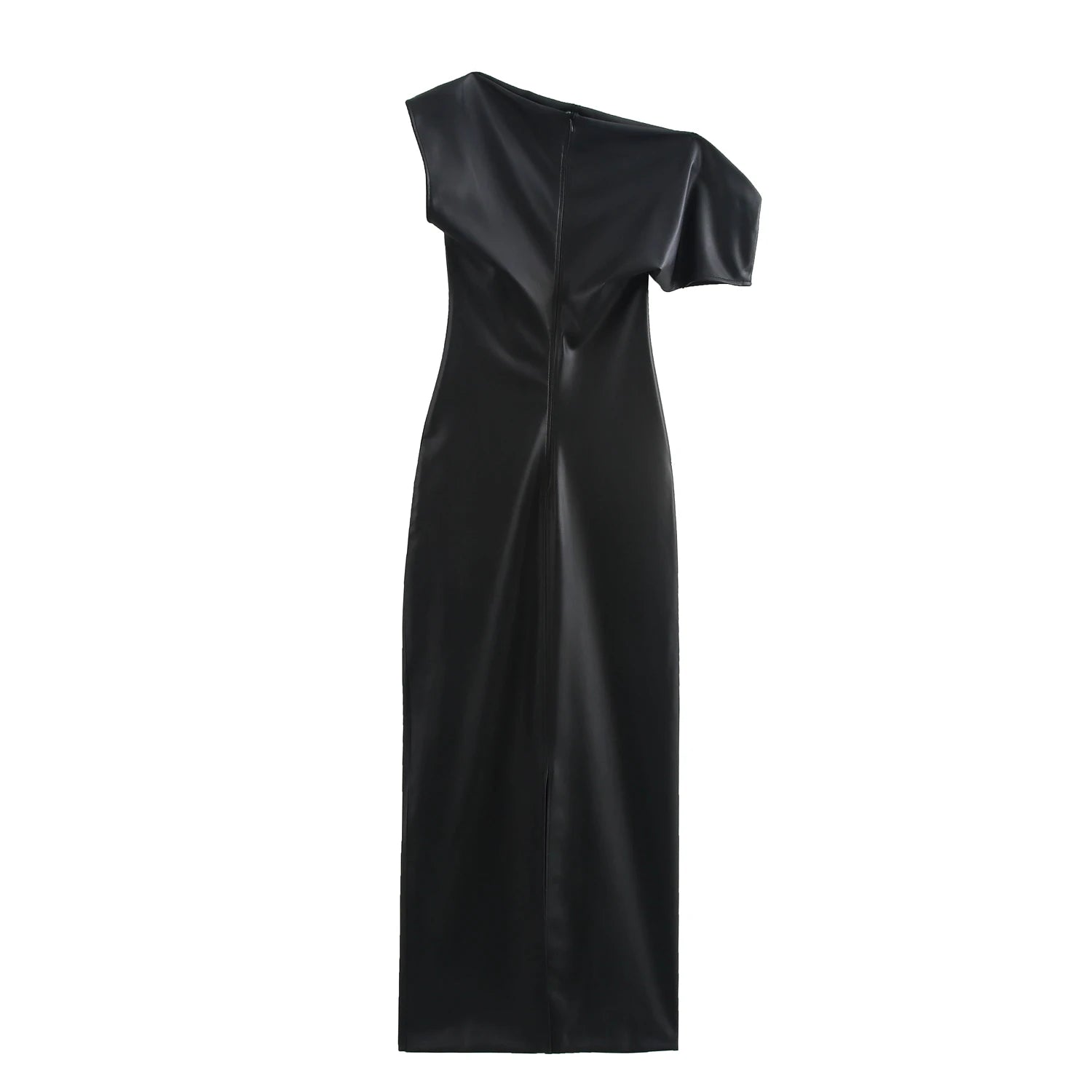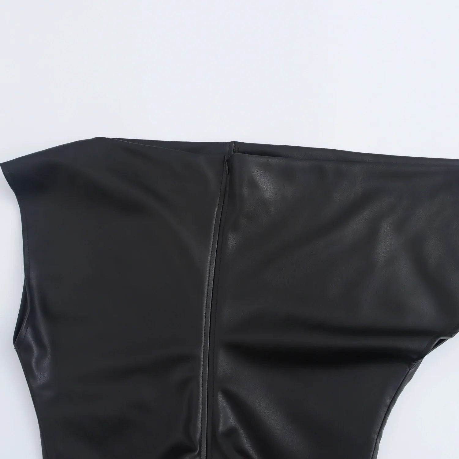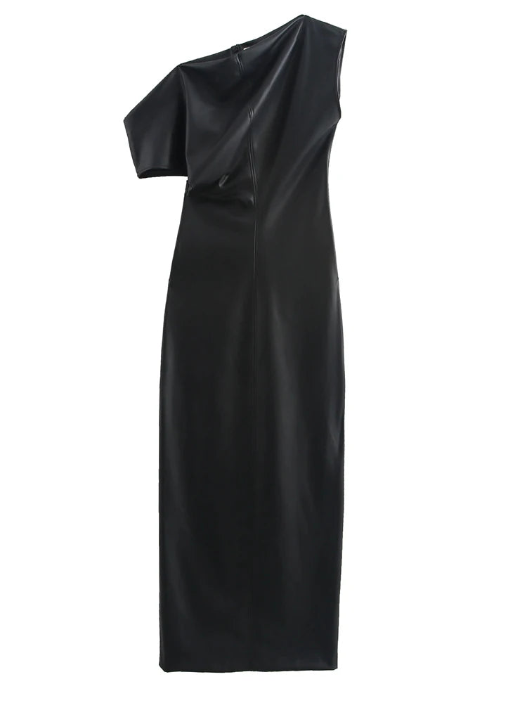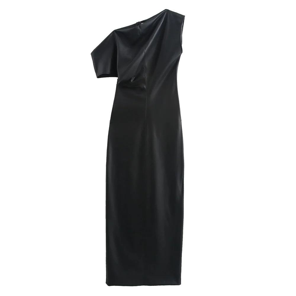 KAOPU ZA Women draped faux leather midi dress vintage flowing neck asymmetric sleeves female dresses mujer