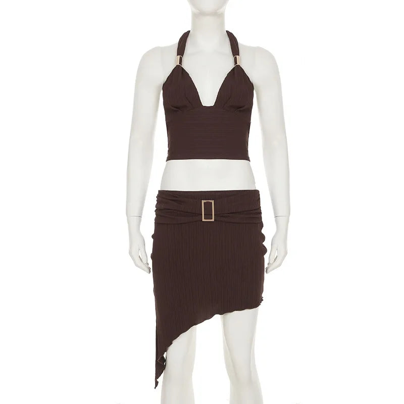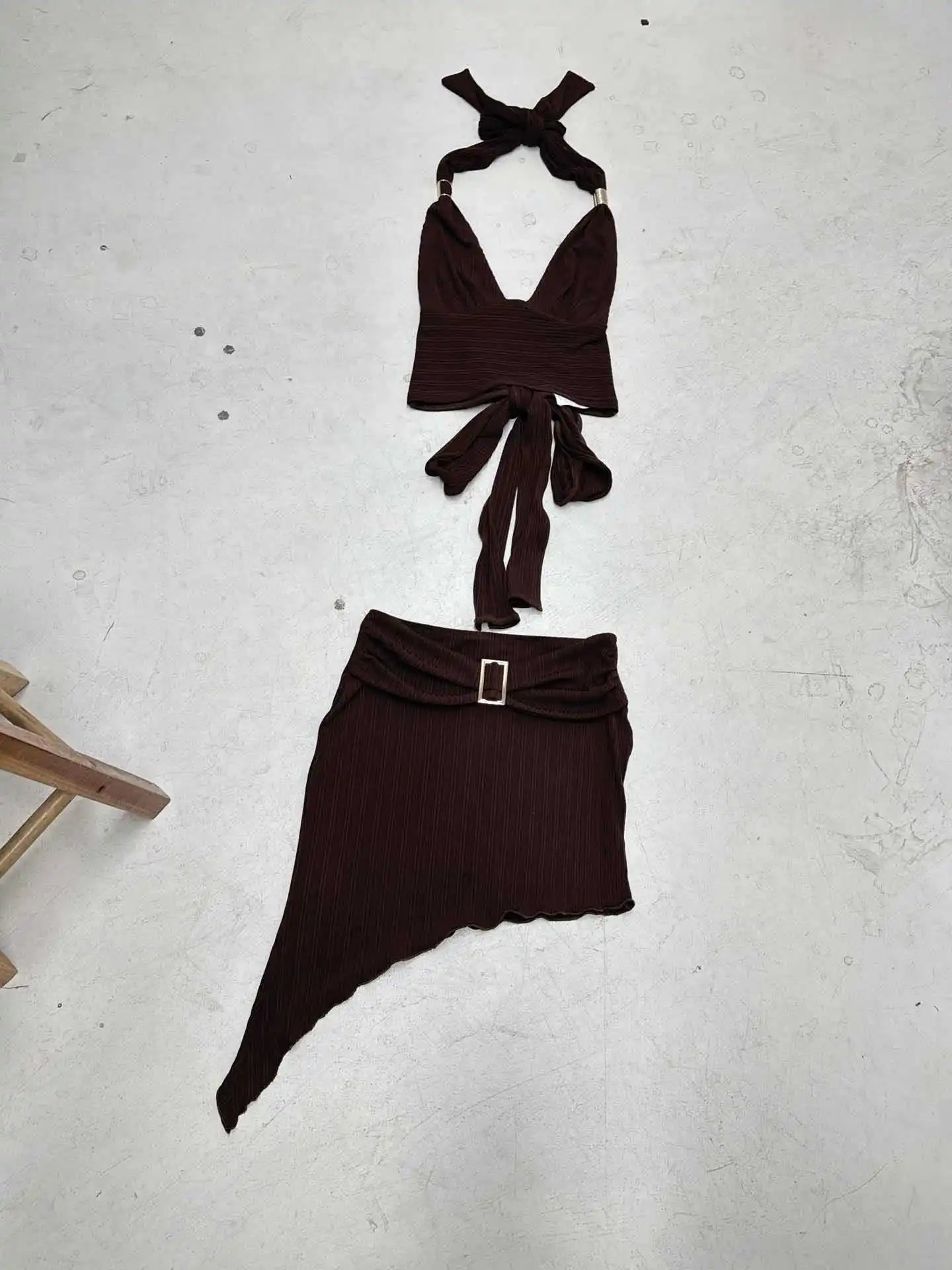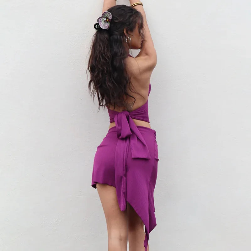 Purple Skirts Two Piece Sets Summer Holidays Party Outfits 2025 New Sexy Halter V-neck Tops and Irregular Mini Skirts Suits
