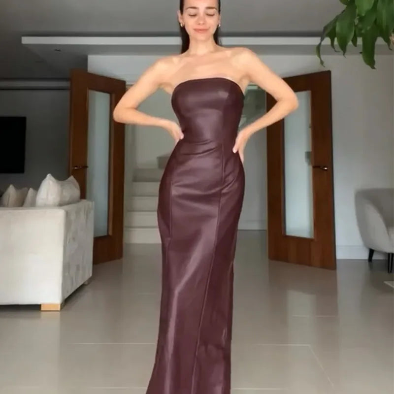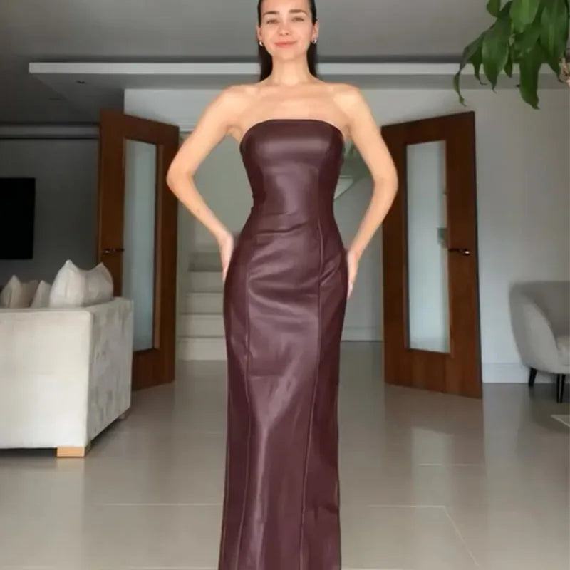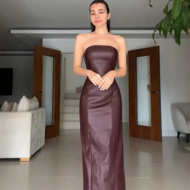 Sleeveless Strapless High Waisted Women's Leather Dress Backless Burgundy Slim Fit Evening Gown New Female Night Club Vestidos