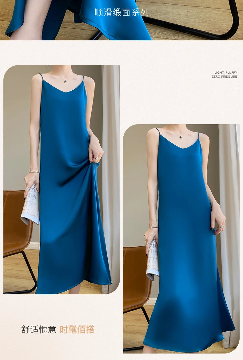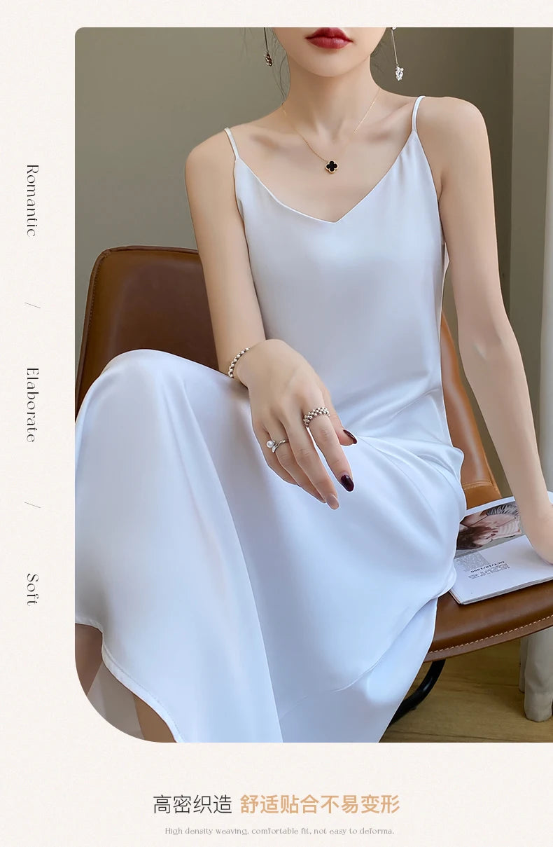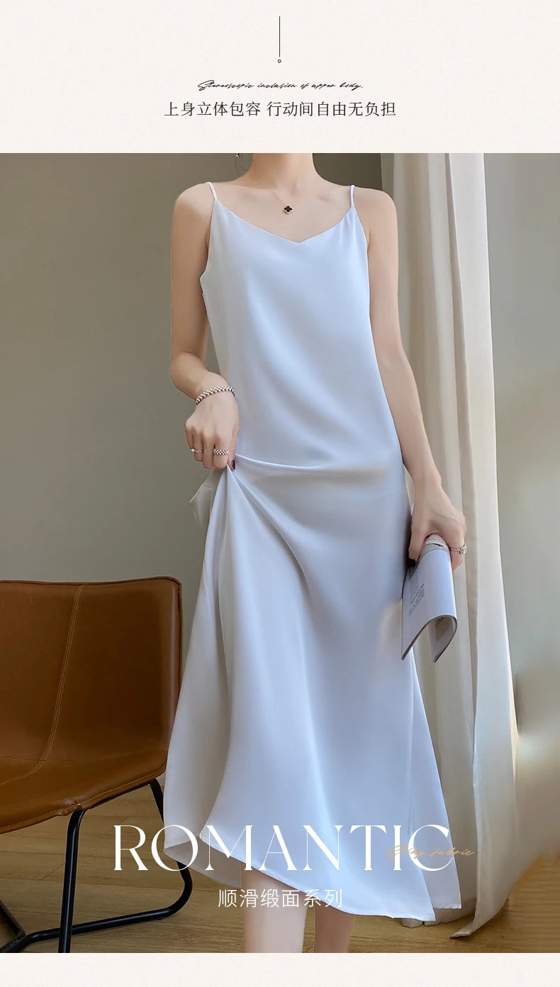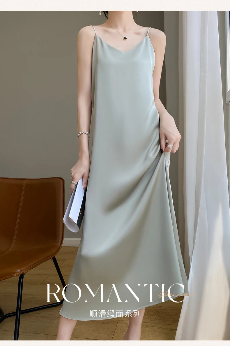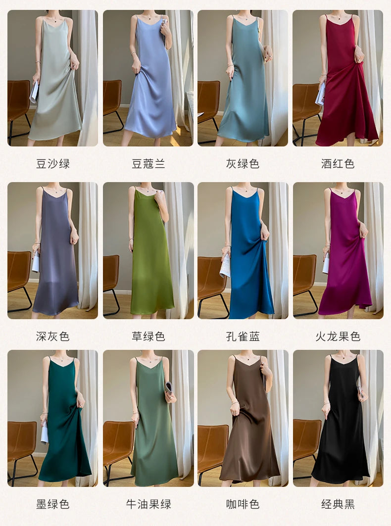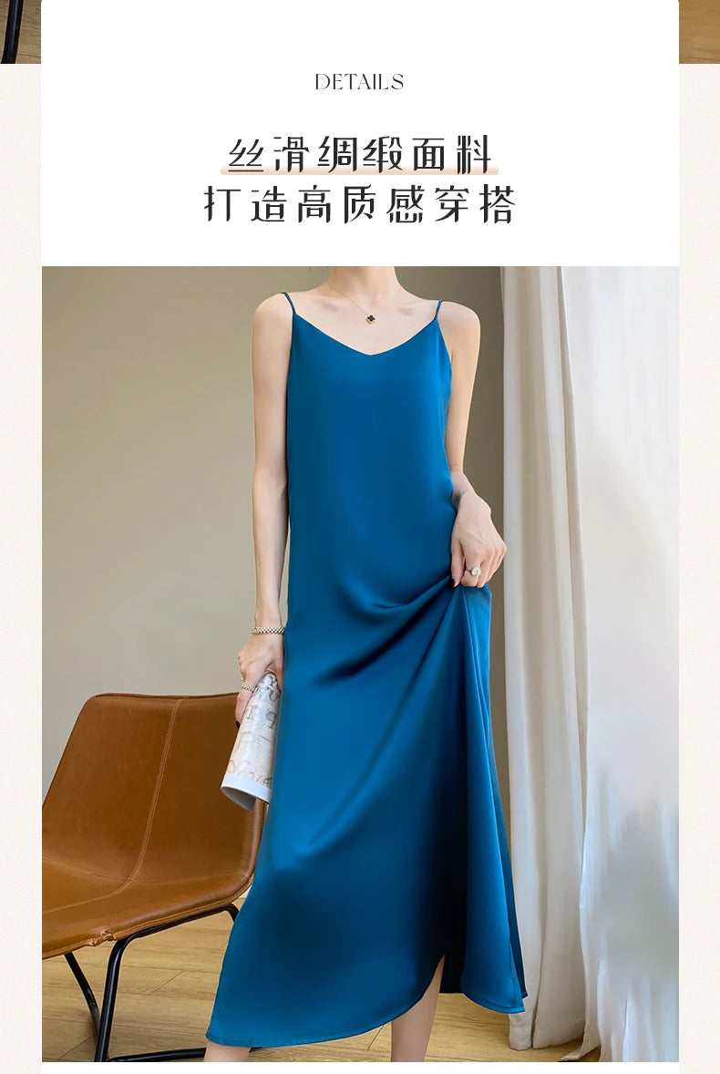 Summer Halter Dress Female Silk Silk Silk High Grade Satin Solid Color Long A-Line Skirt Waist Show Thin Cover Meat RW D13
