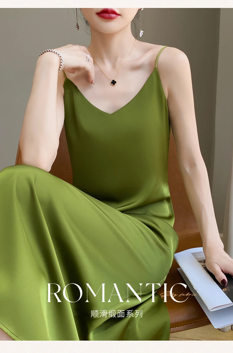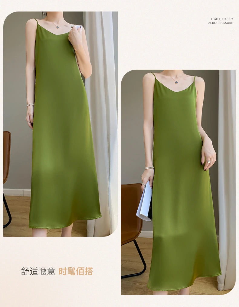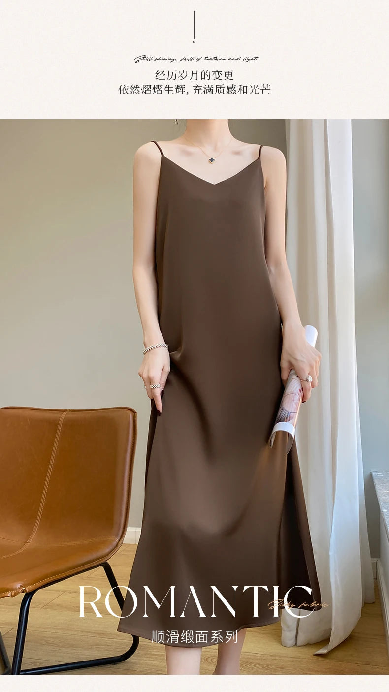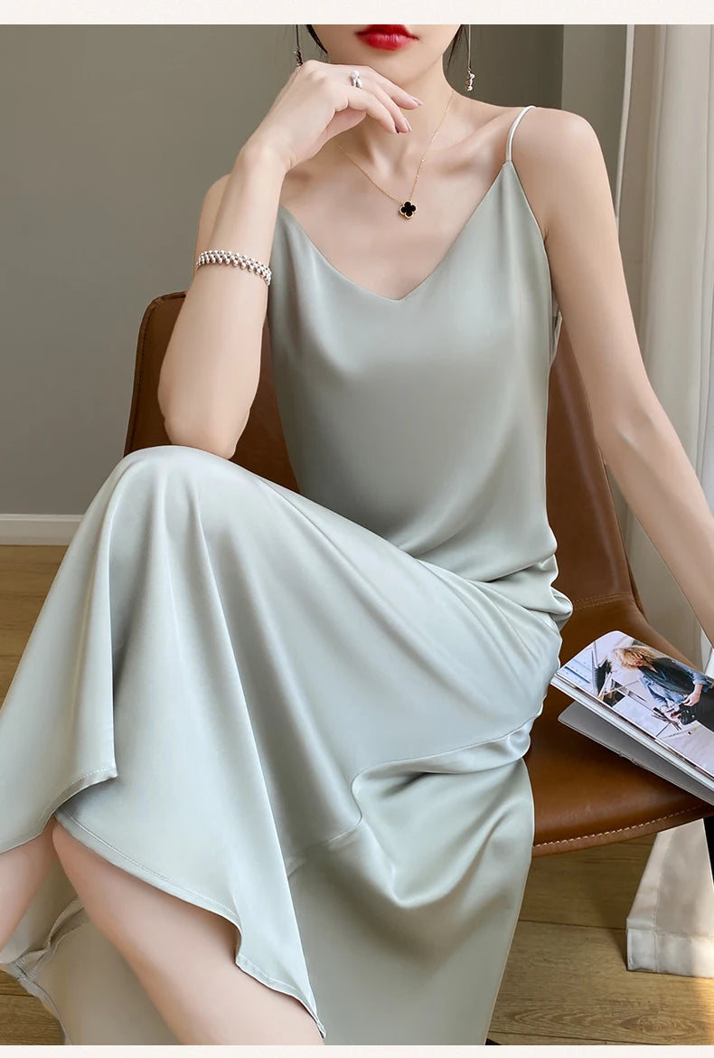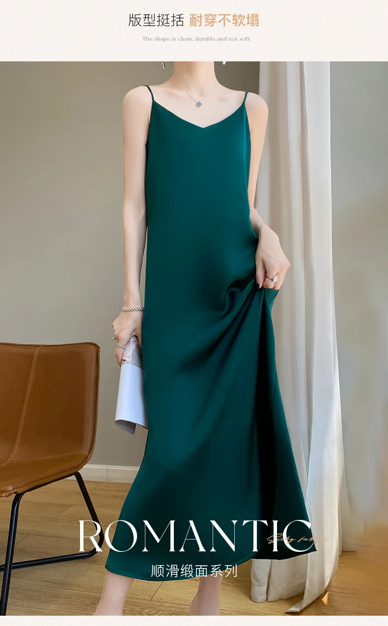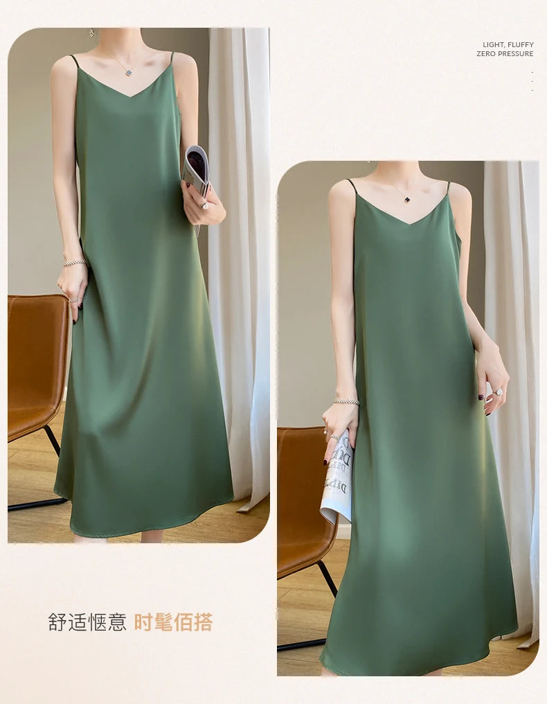 Summer Halter Dress Female Silk Silk Silk High Grade Satin Solid Color Long A-Line Skirt Waist Show Thin Cover Meat RW D13