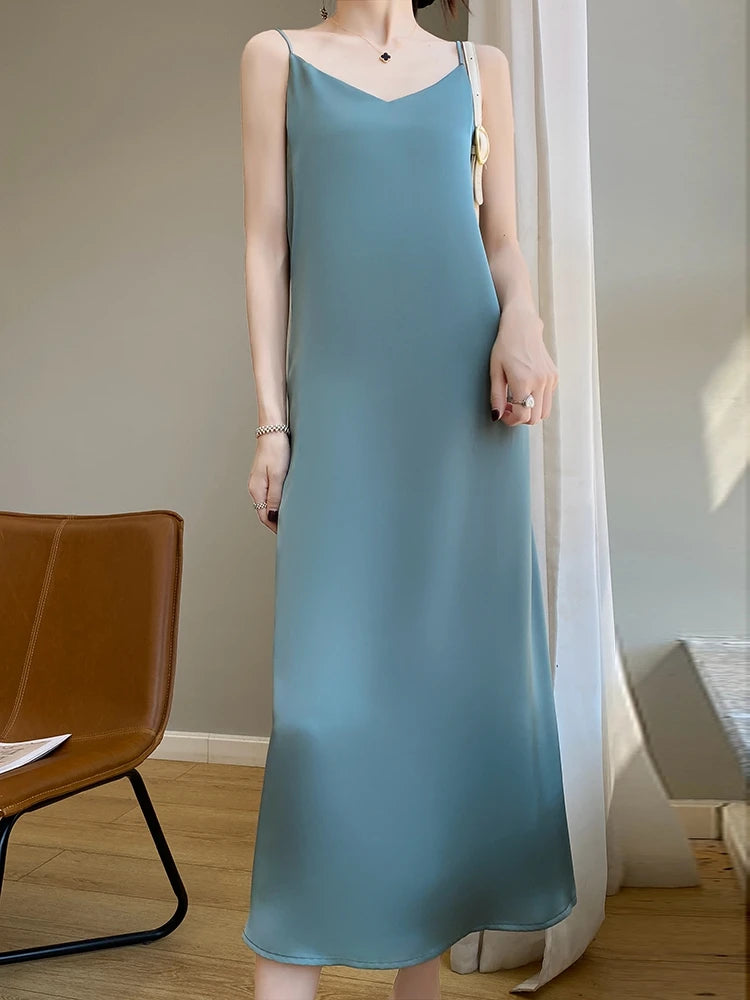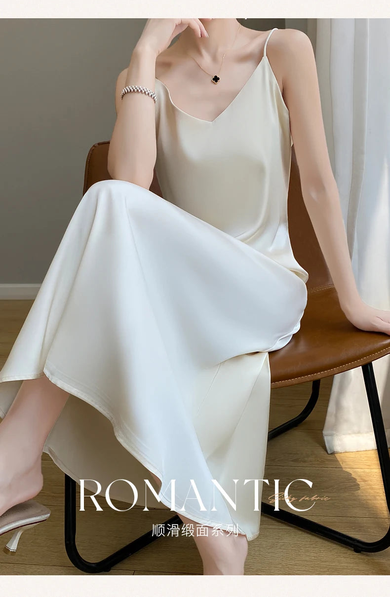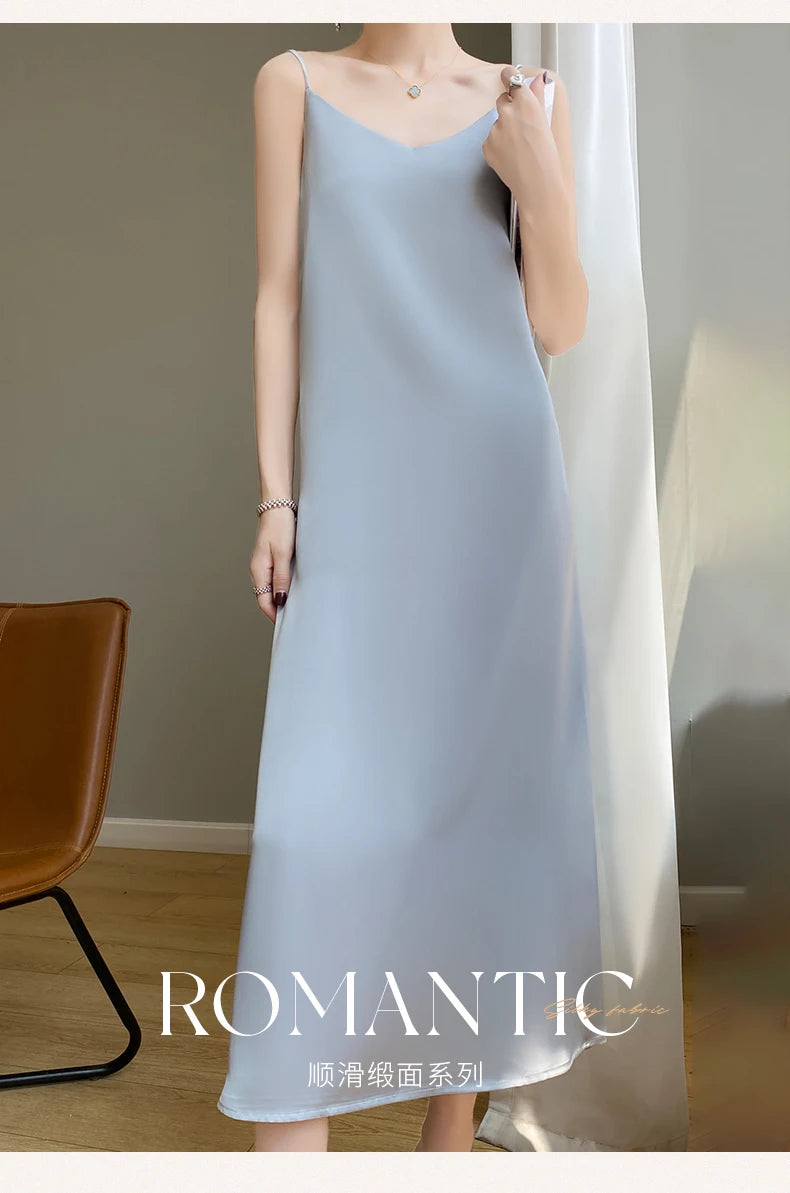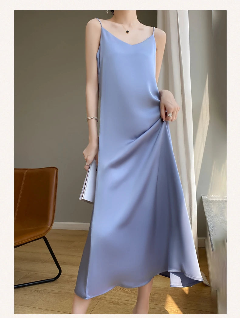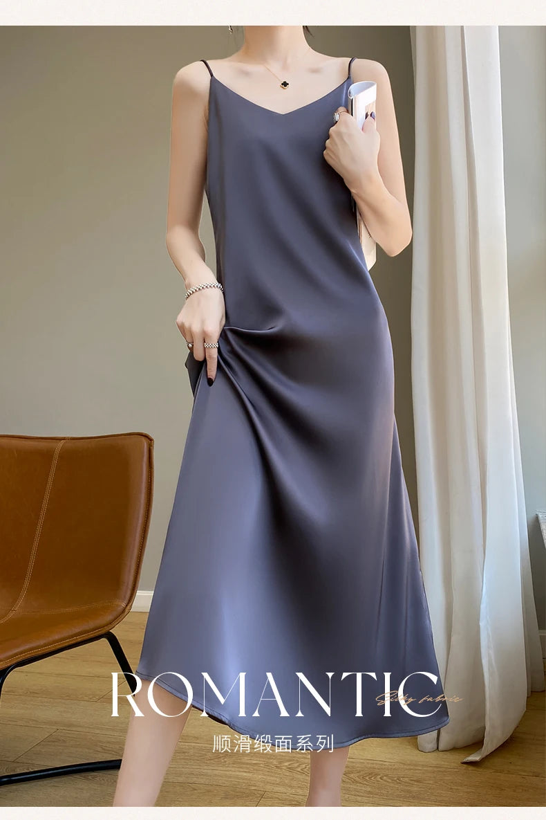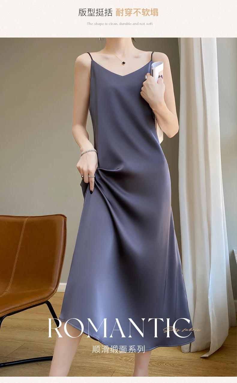 Summer Halter Dress Female Silk Silk Silk High Grade Satin Solid Color Long A-Line Skirt Waist Show Thin Cover Meat RW D13