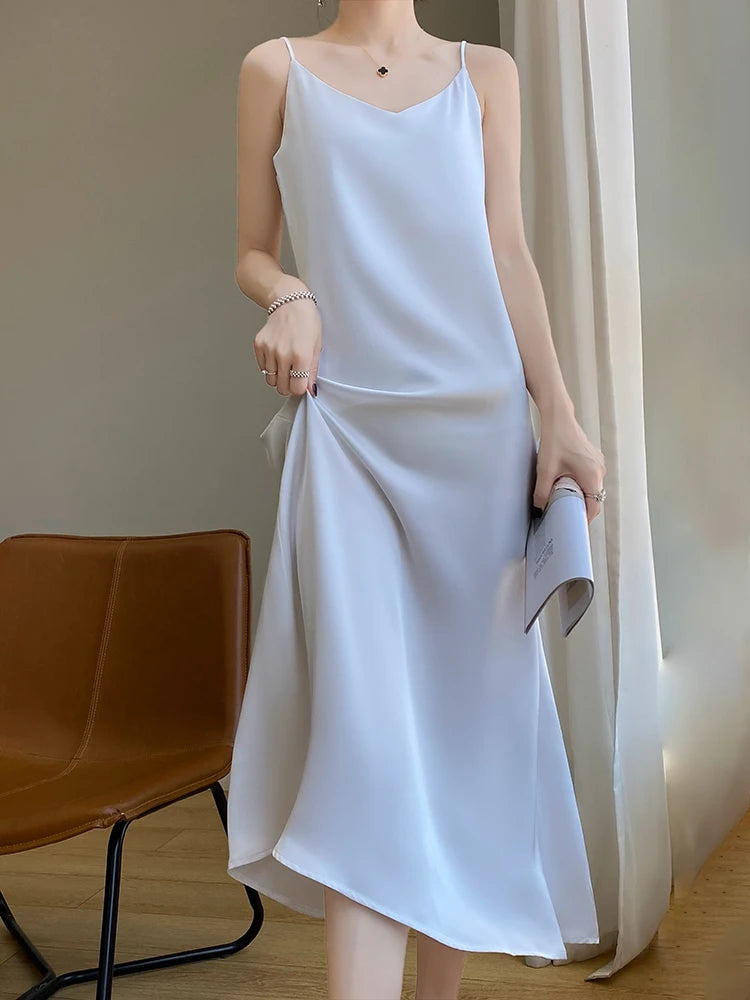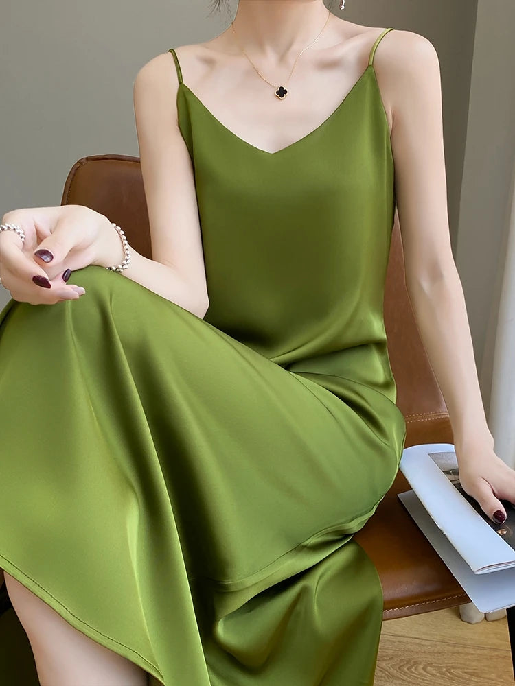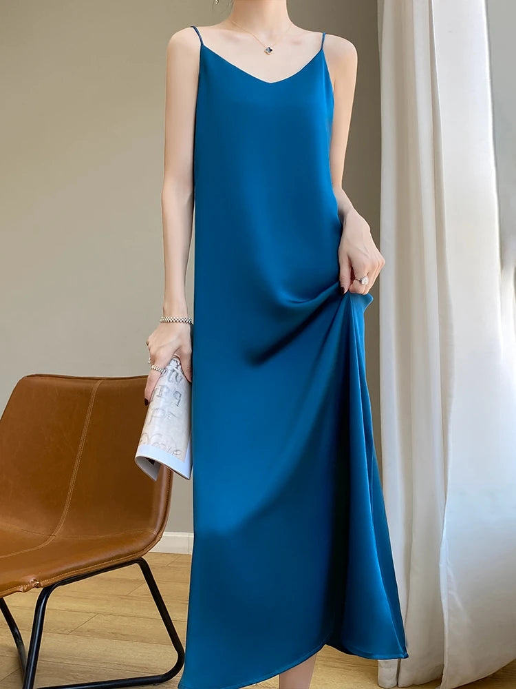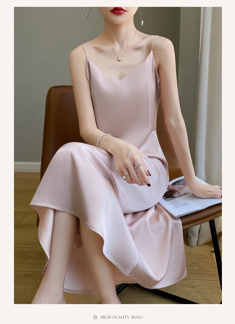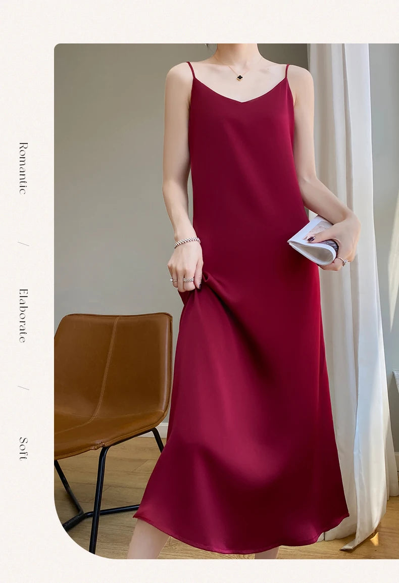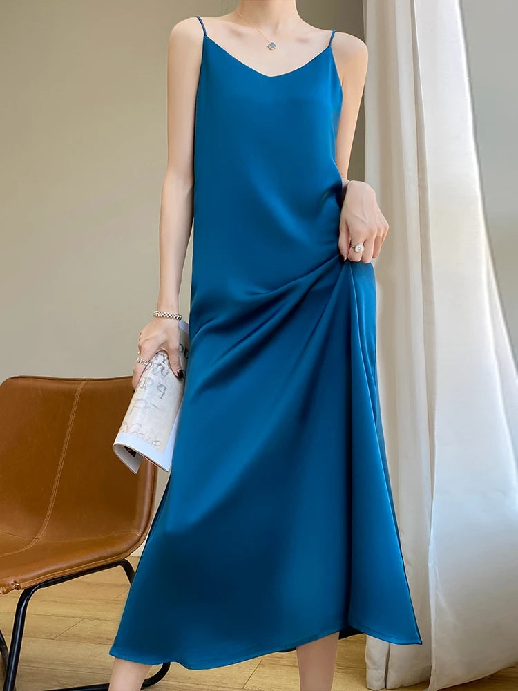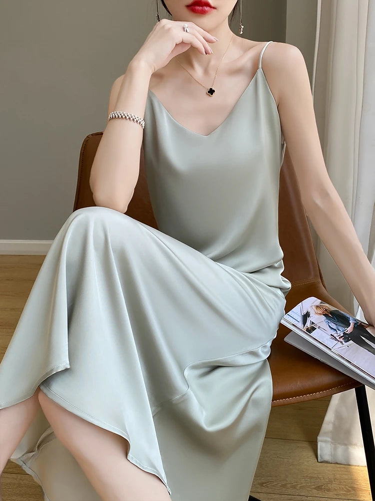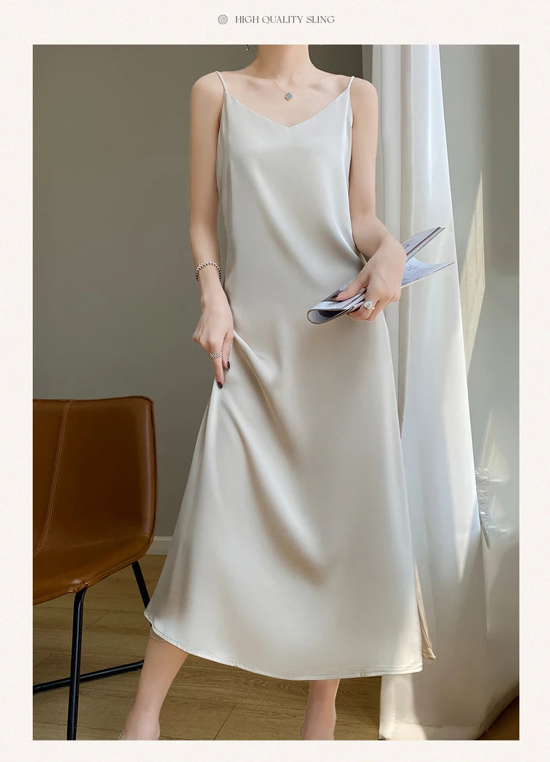 Summer Halter Dress Female Silk Silk Silk High Grade Satin Solid Color Long A-Line Skirt Waist Show Thin Cover Meat RW D13