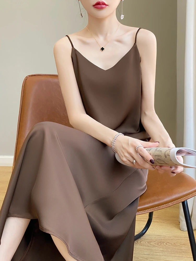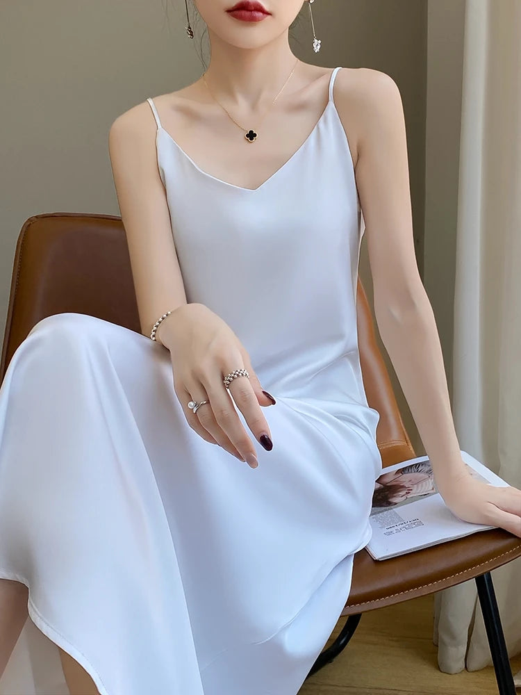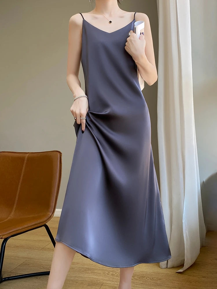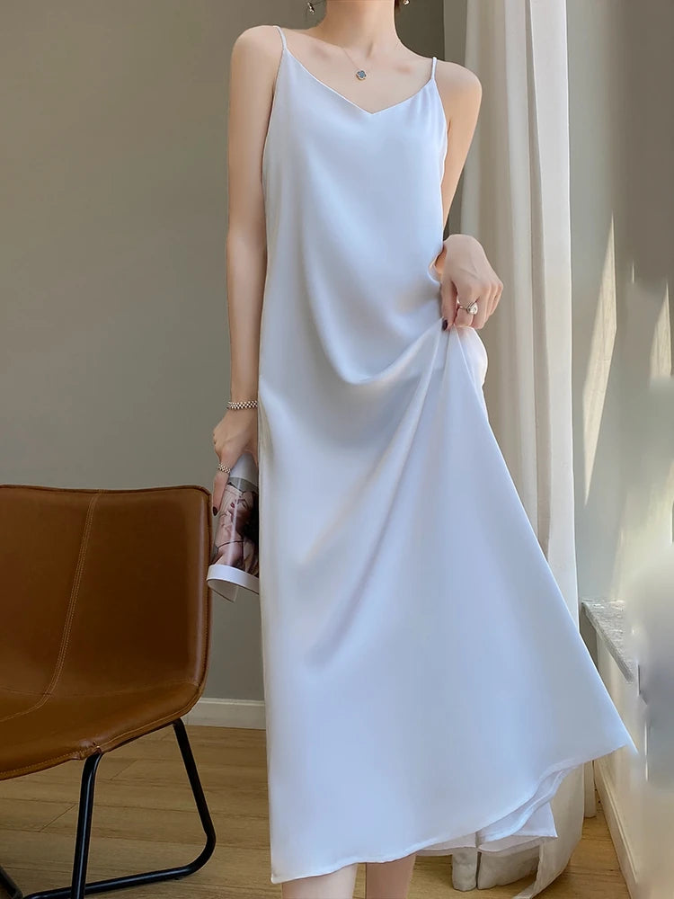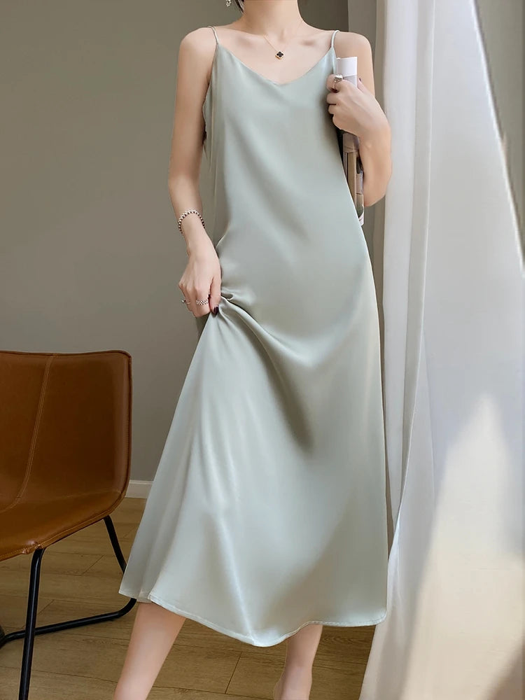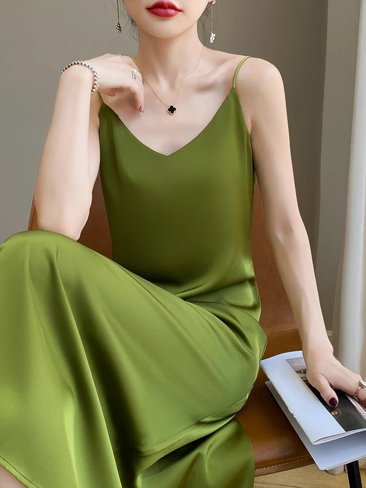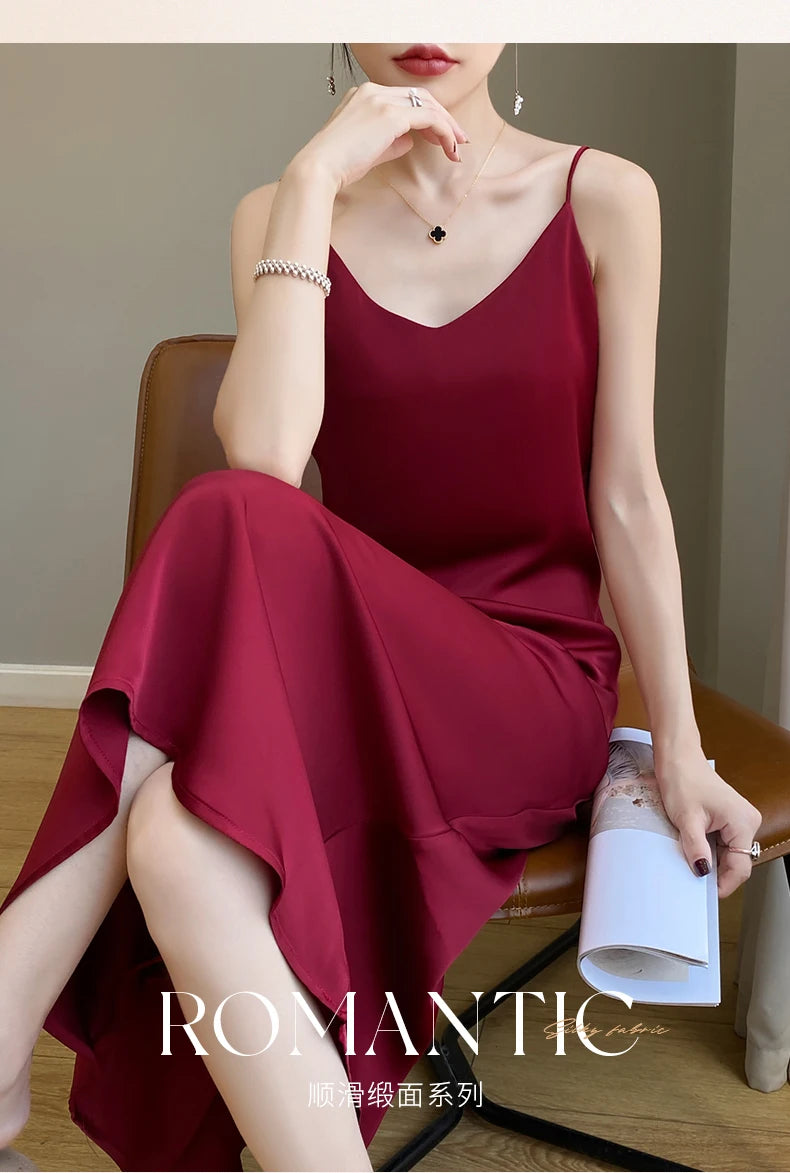 Summer Halter Dress Female Silk Silk Silk High Grade Satin Solid Color Long A-Line Skirt Waist Show Thin Cover Meat RW D13