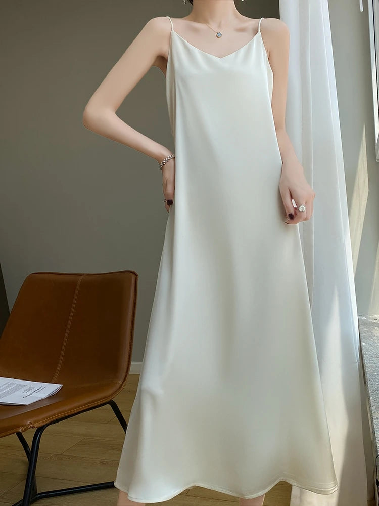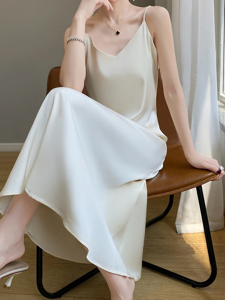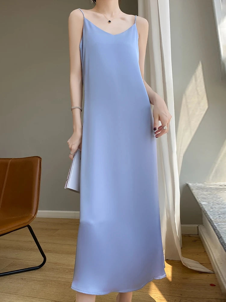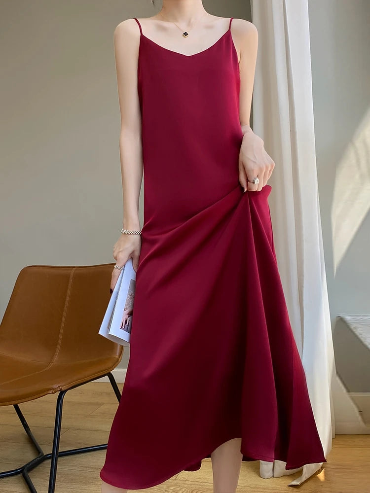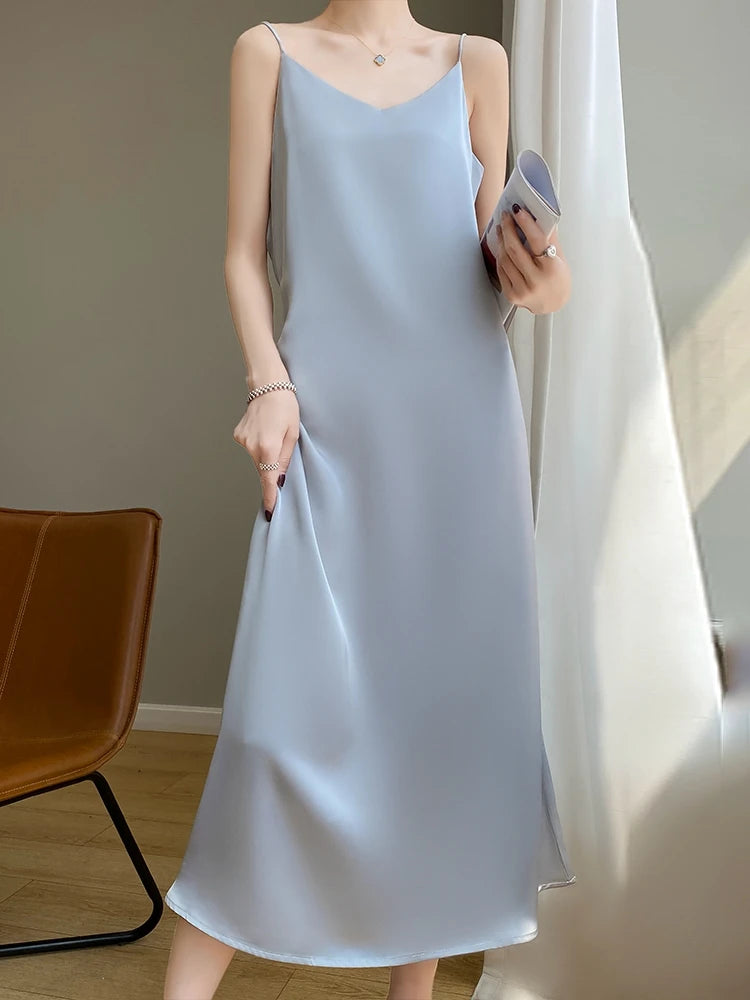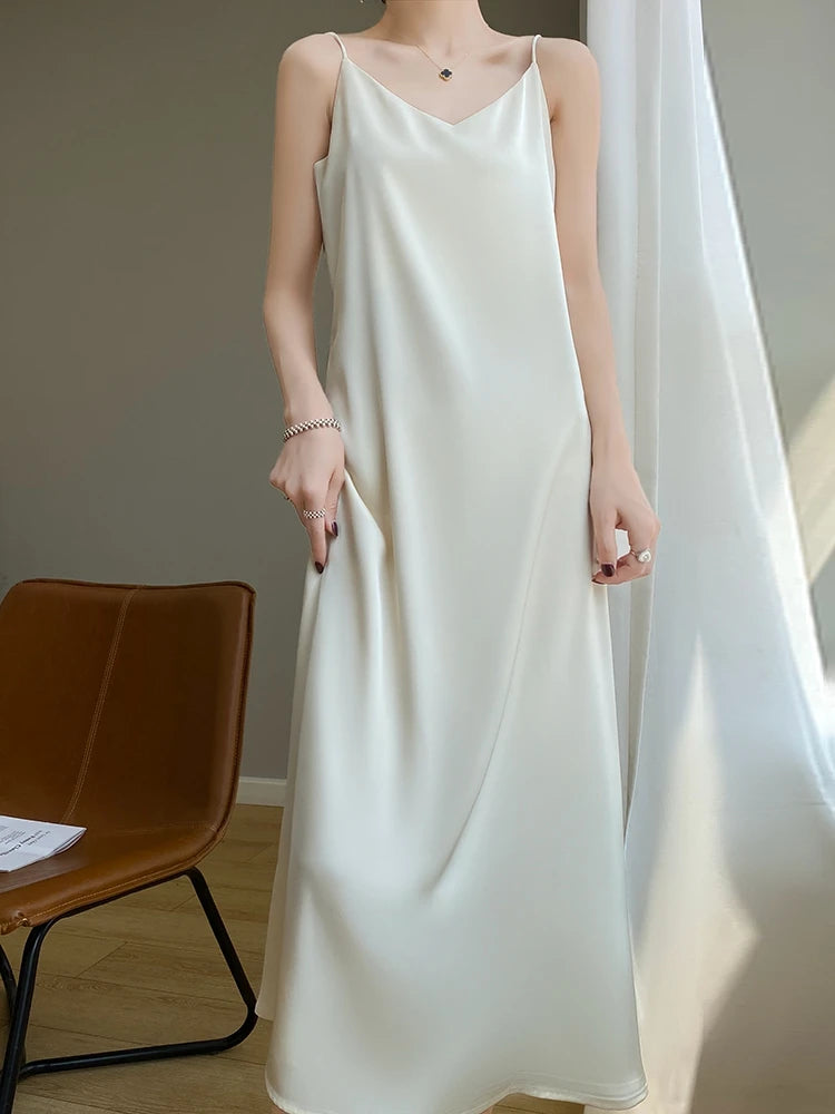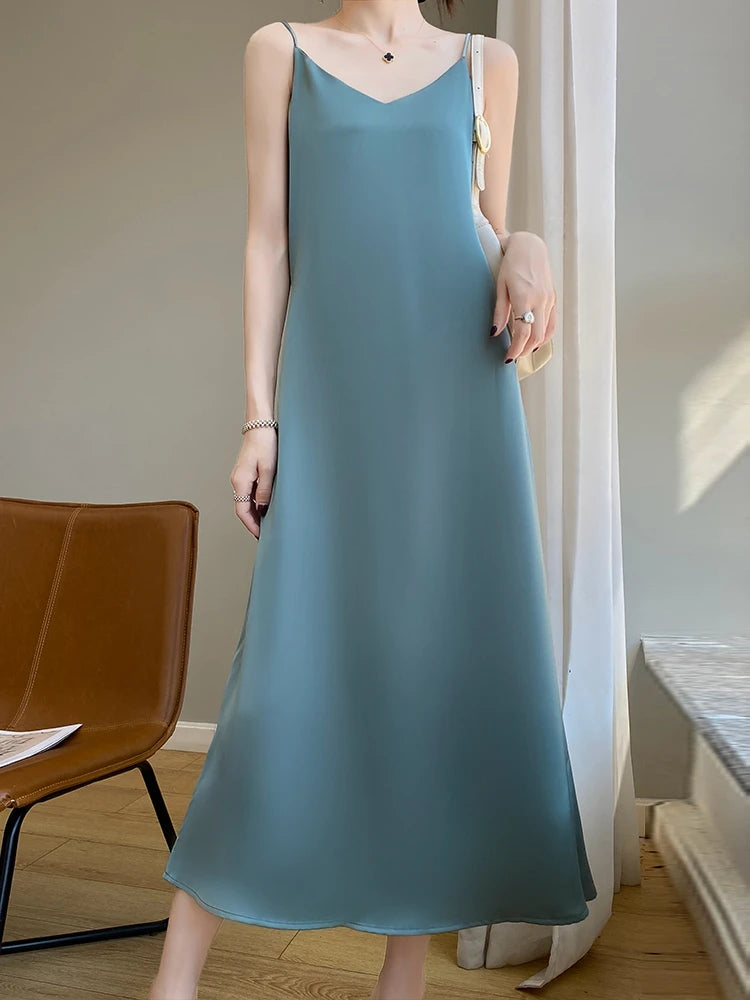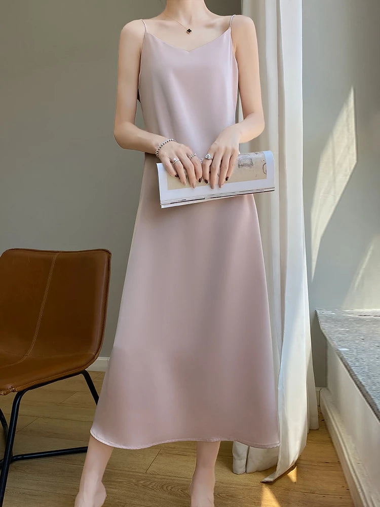 Summer Halter Dress Female Silk Silk Silk High Grade Satin Solid Color Long A-Line Skirt Waist Show Thin Cover Meat RW D13