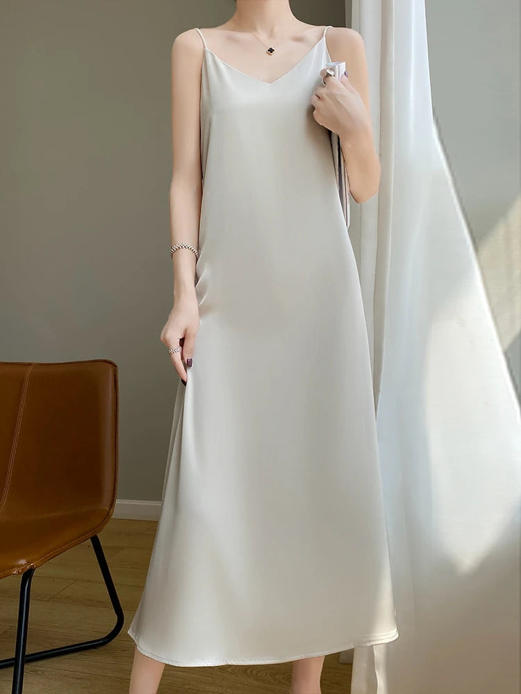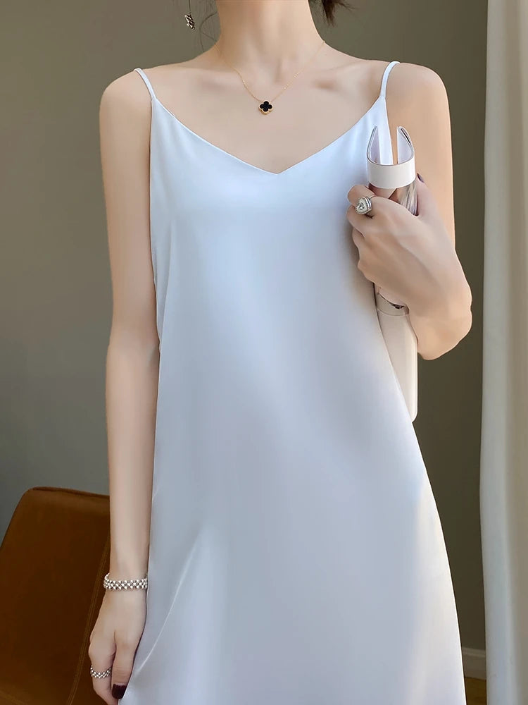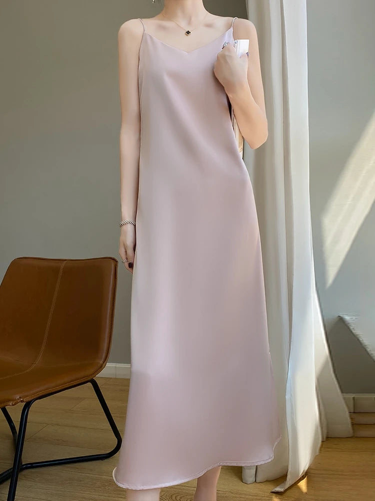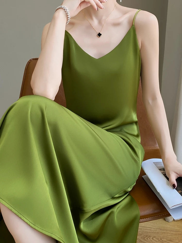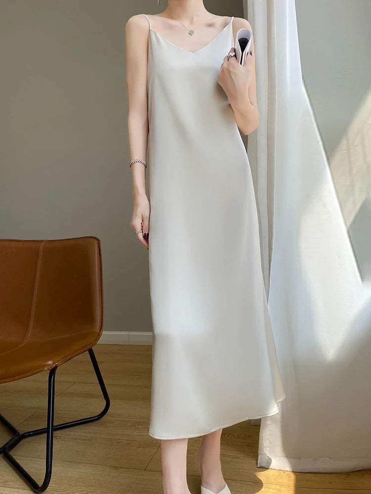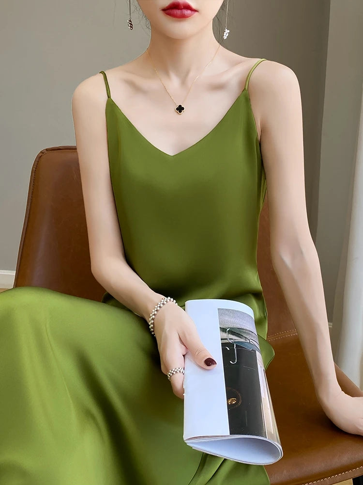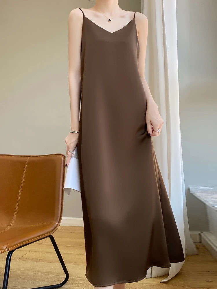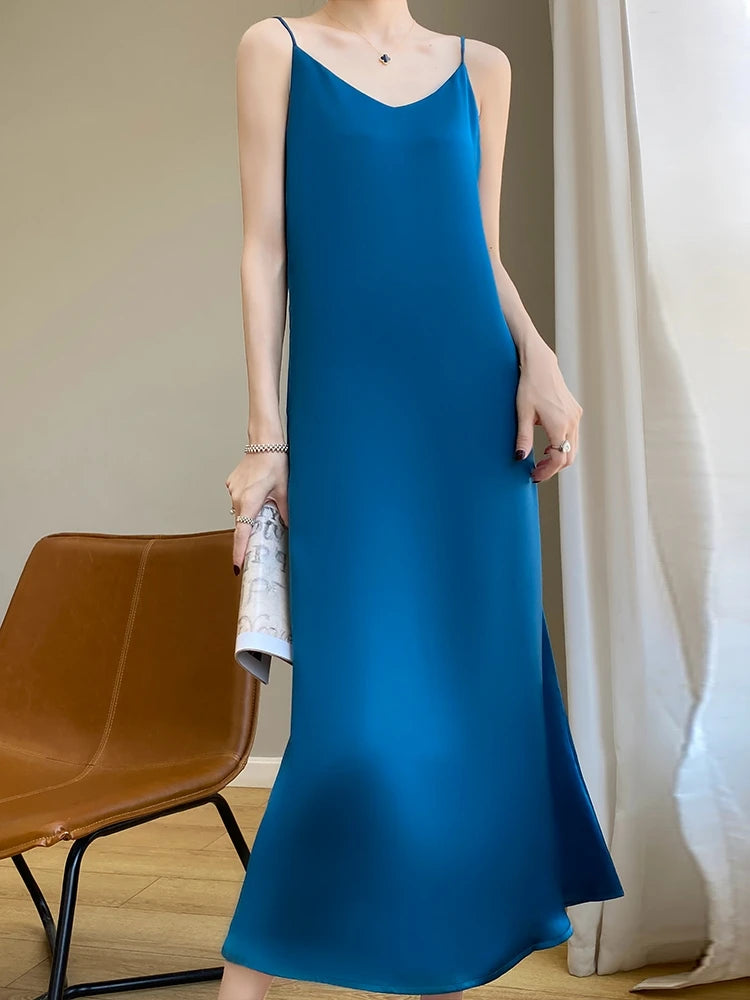 Summer Halter Dress Female Silk Silk Silk High Grade Satin Solid Color Long A-Line Skirt Waist Show Thin Cover Meat RW D13