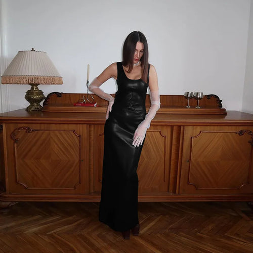 Vintage Elegant Dress Women Summer Leather Classic Sleeveless Slits Basic Simple Trend Stretch Party Long Bodycon