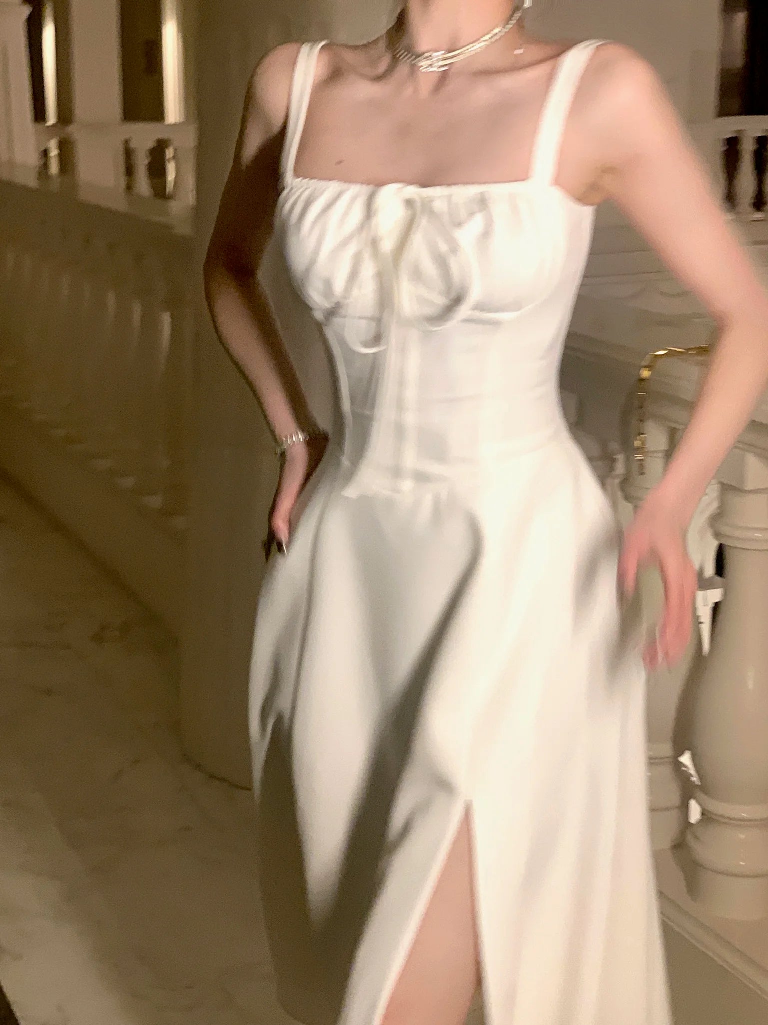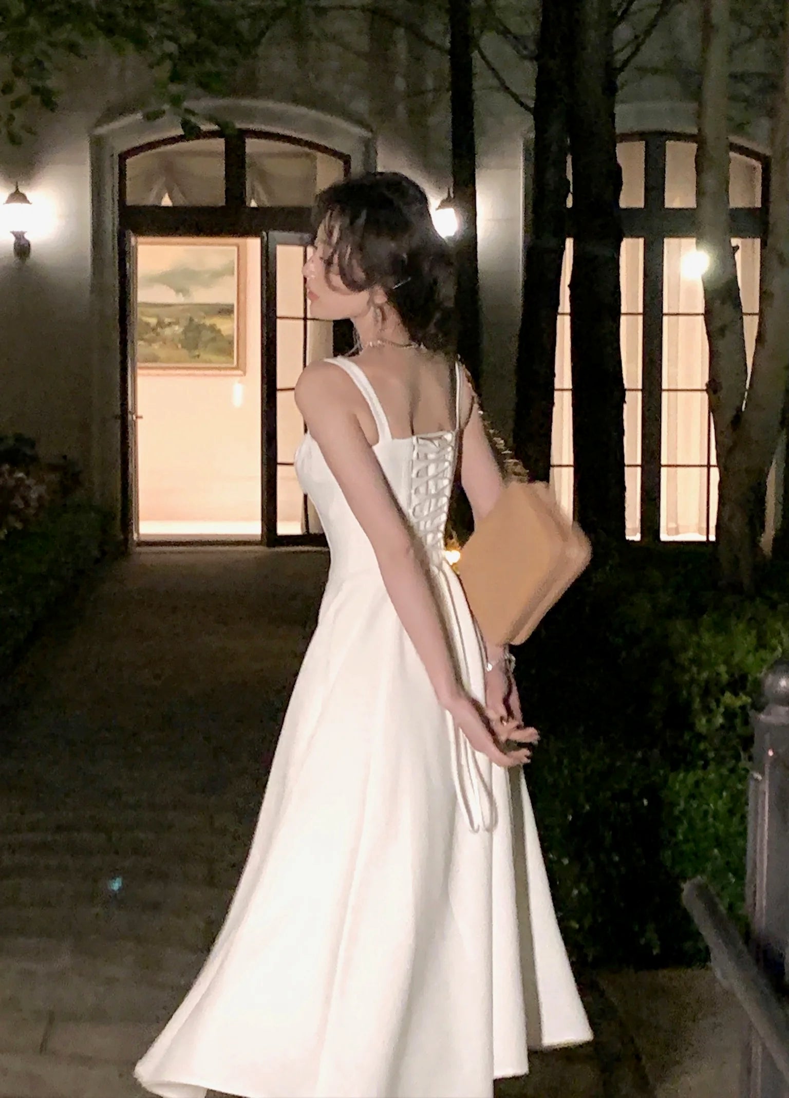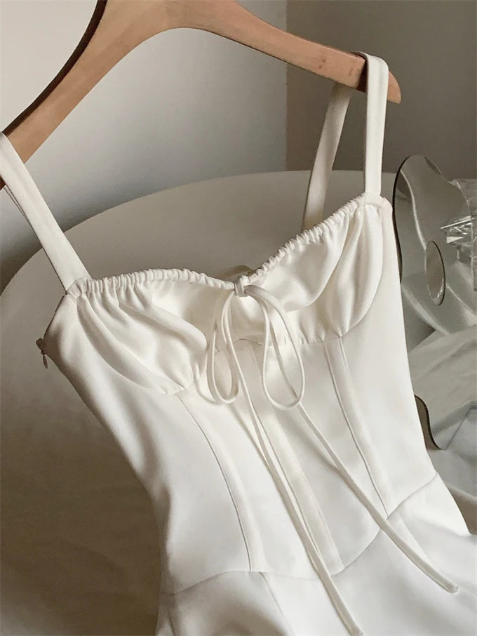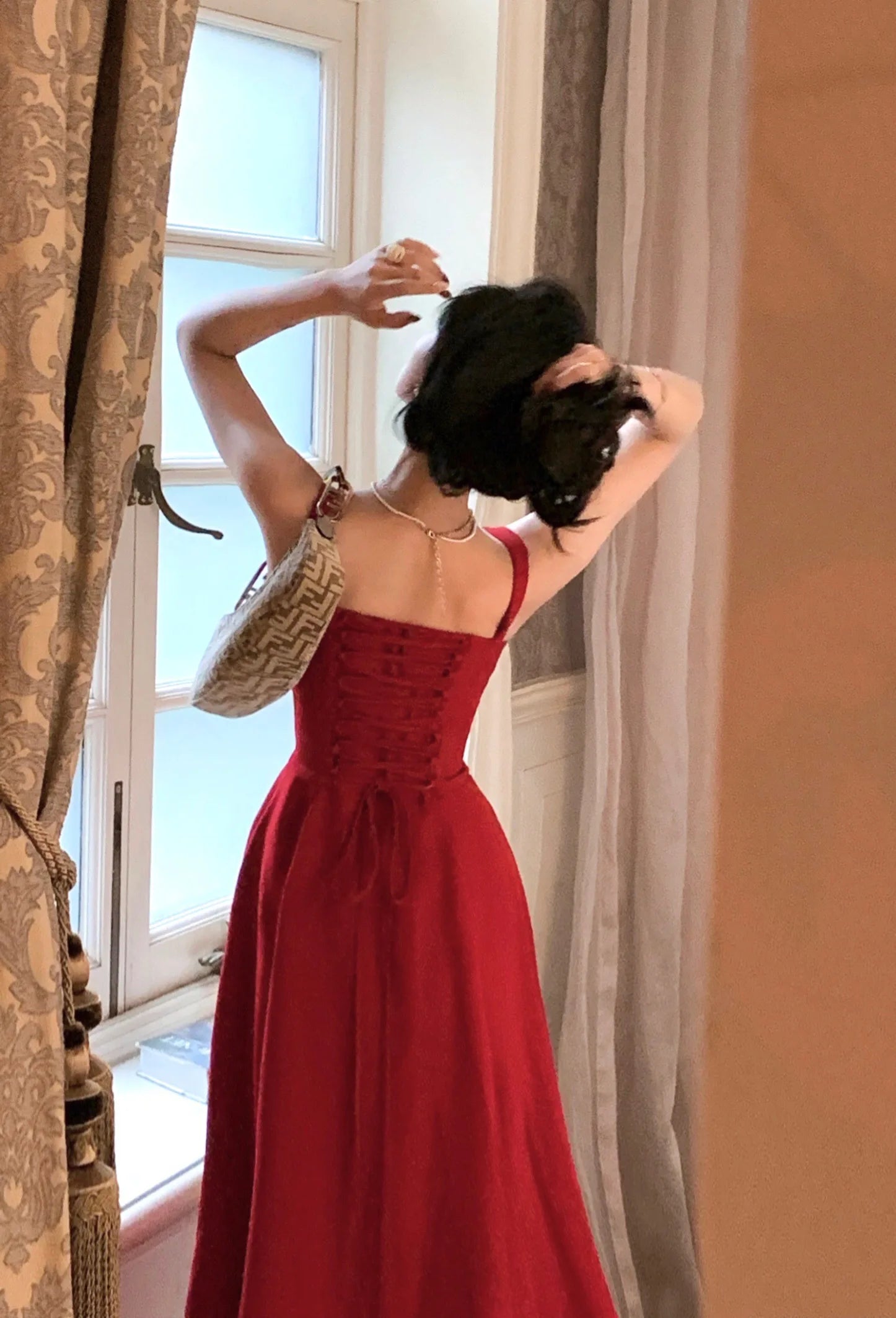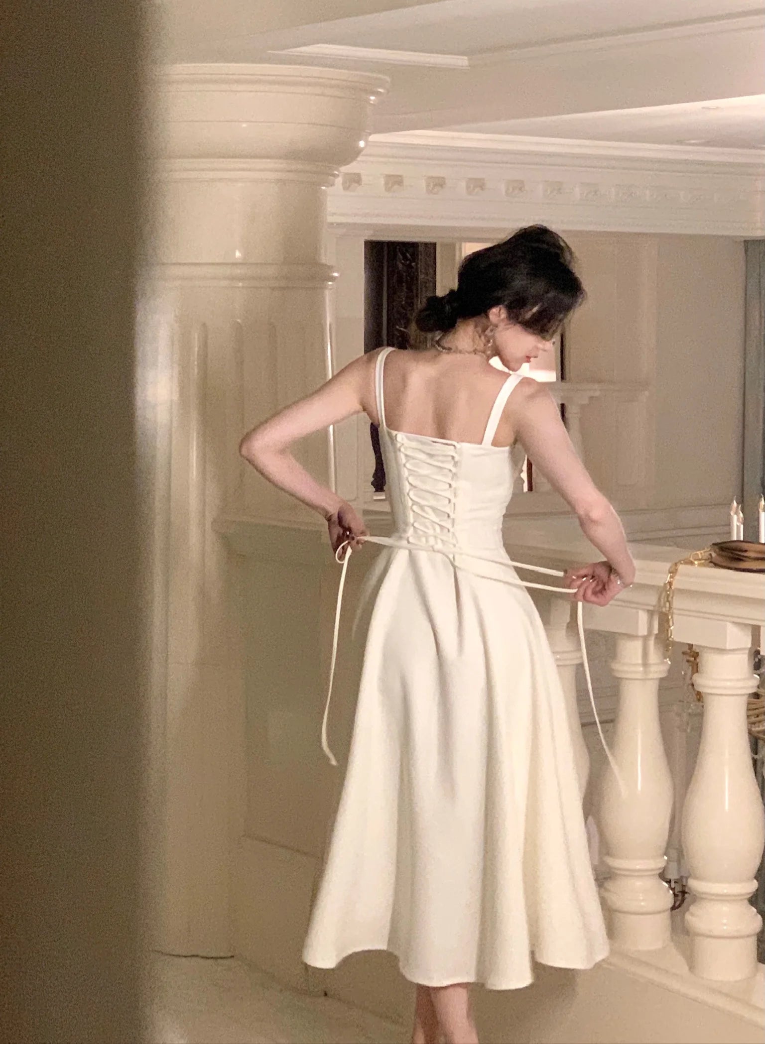 French Elegant White Strap Midi Dress 2023 Summer New Casual Evening Party Dress Women Beach Sleeveless Lace-up Red Dress Korean