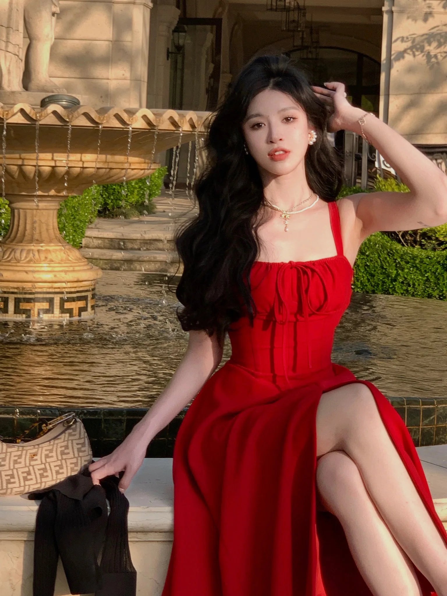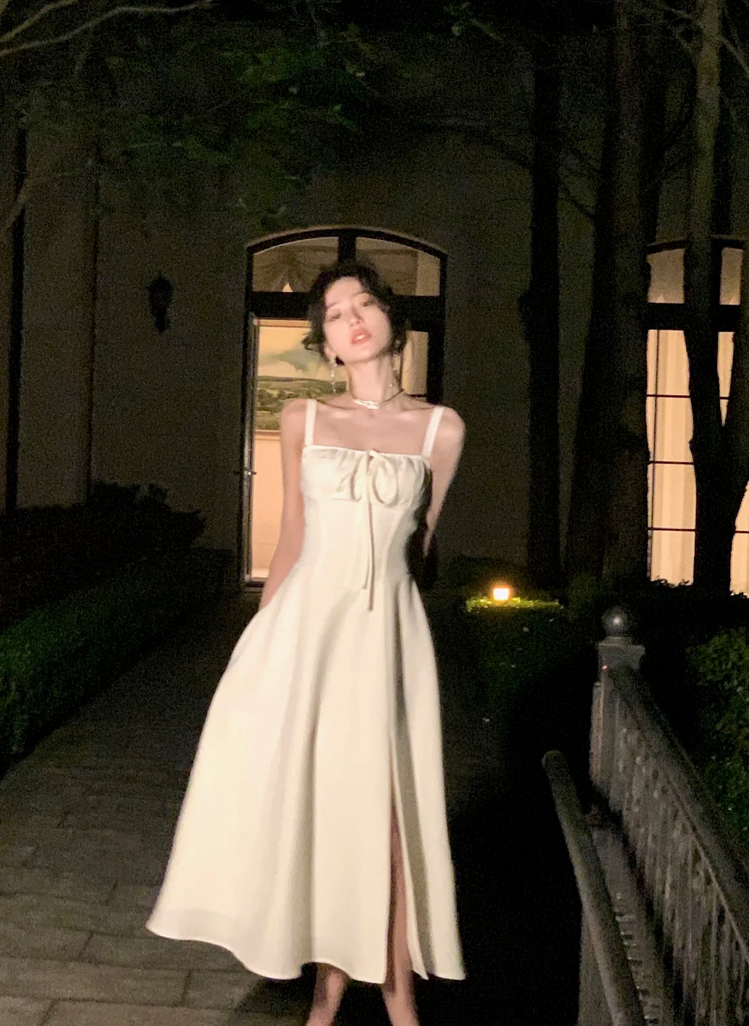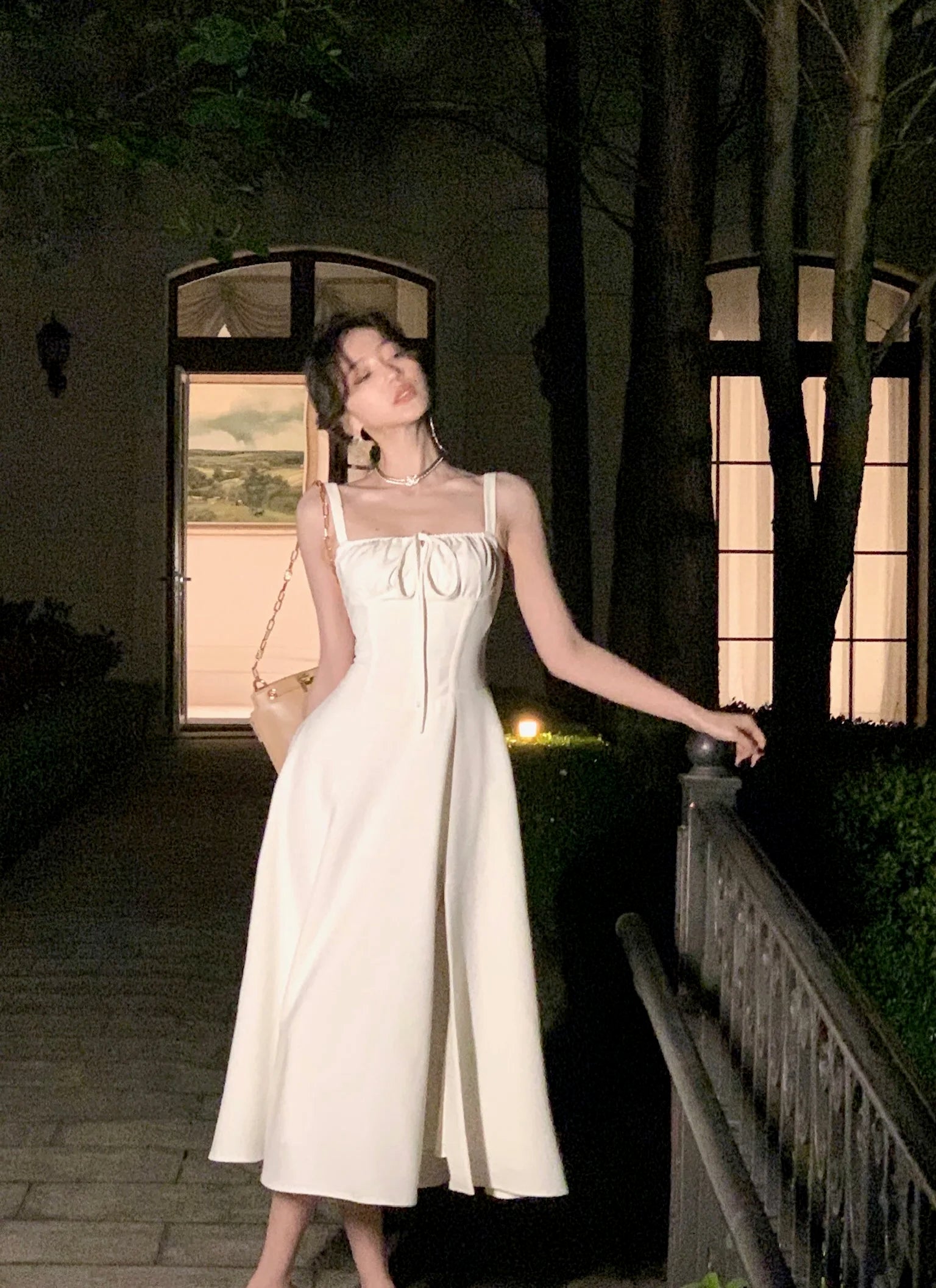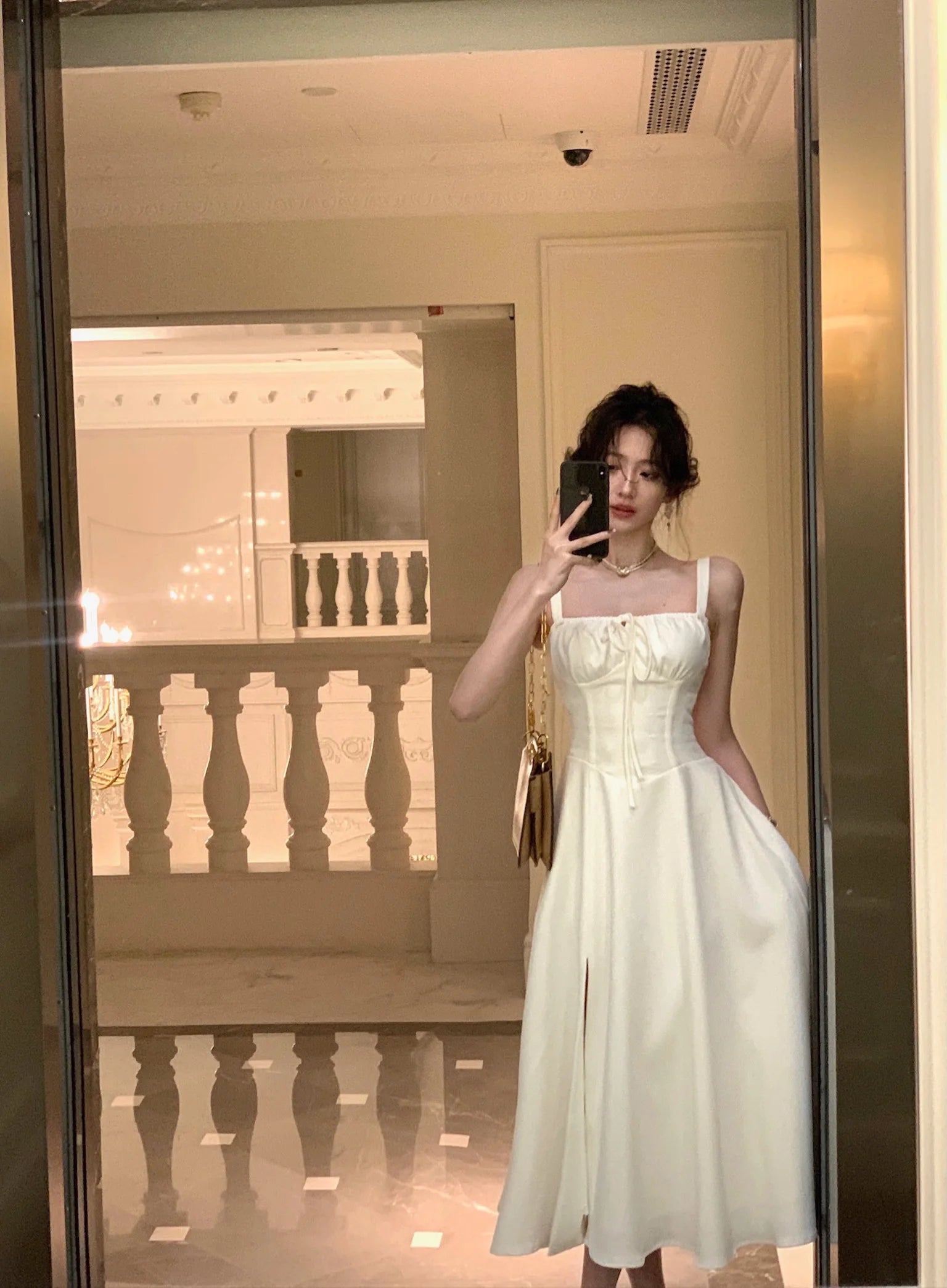 French Elegant White Strap Midi Dress 2023 Summer New Casual Evening Party Dress Women Beach Sleeveless Lace-up Red Dress Korean
