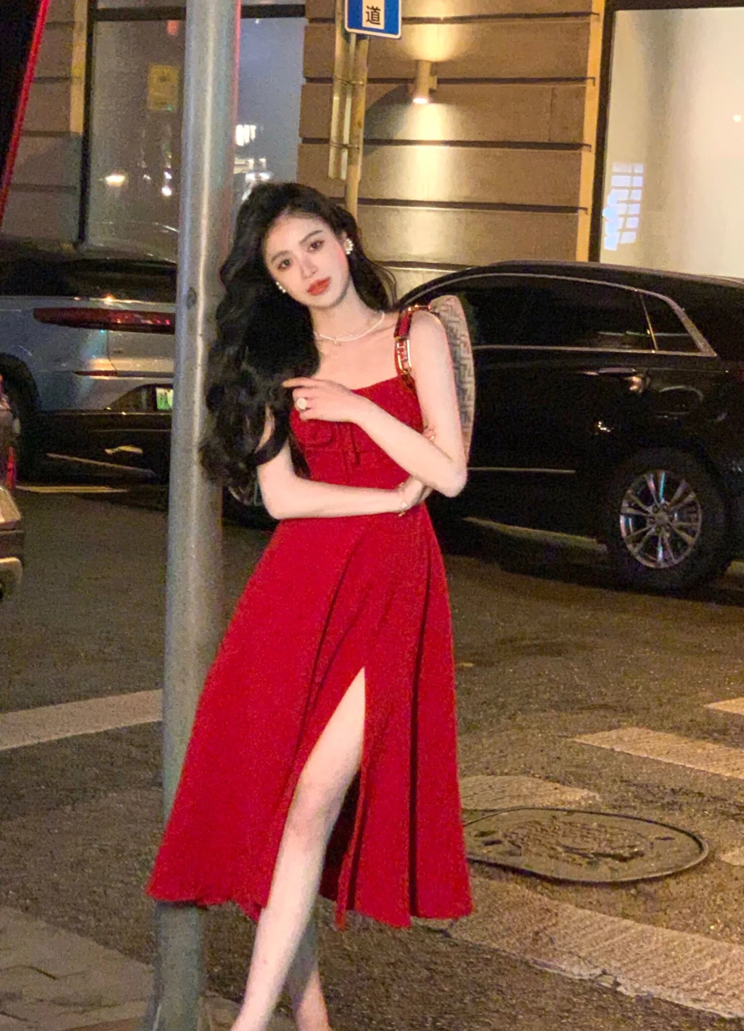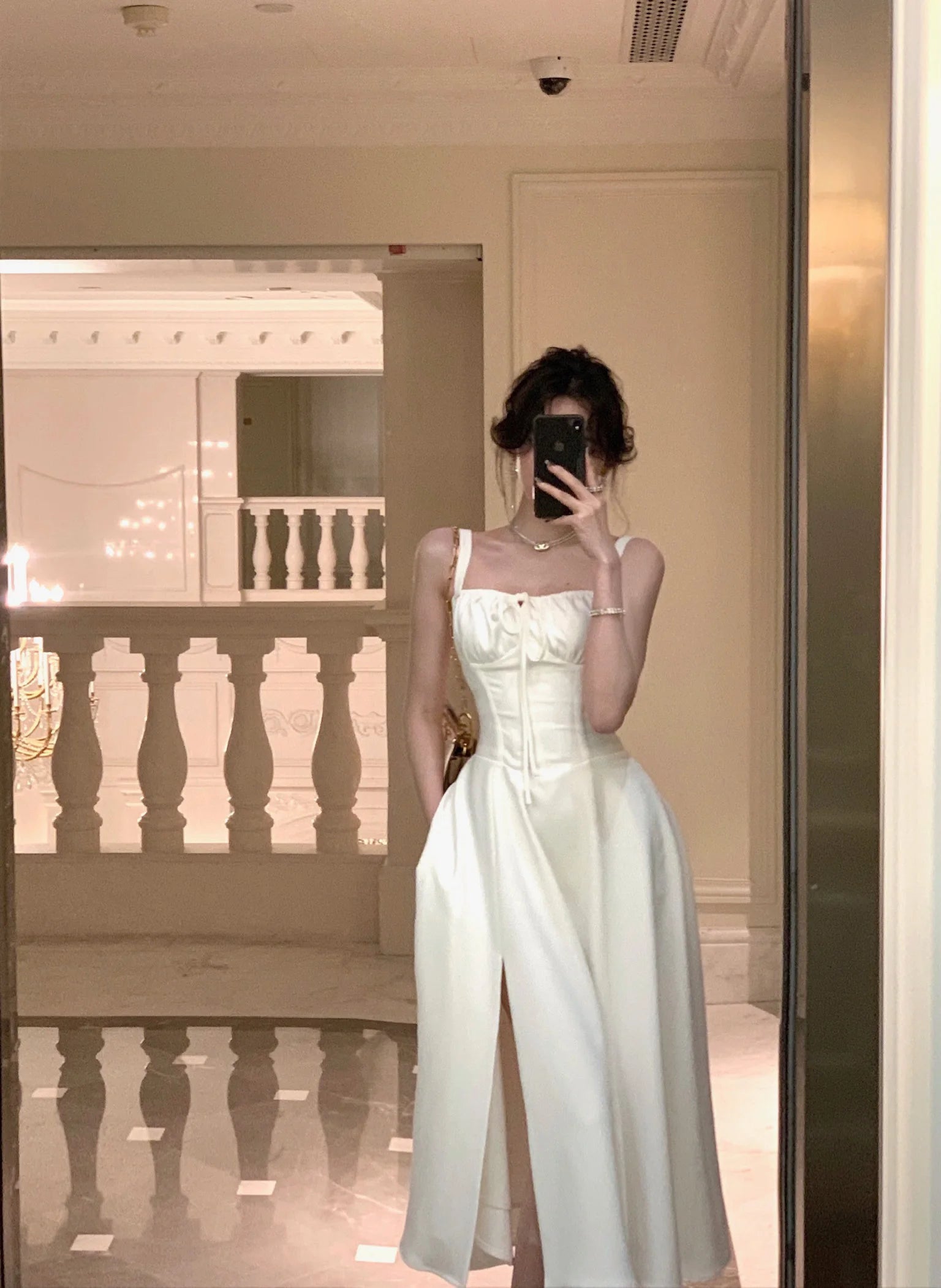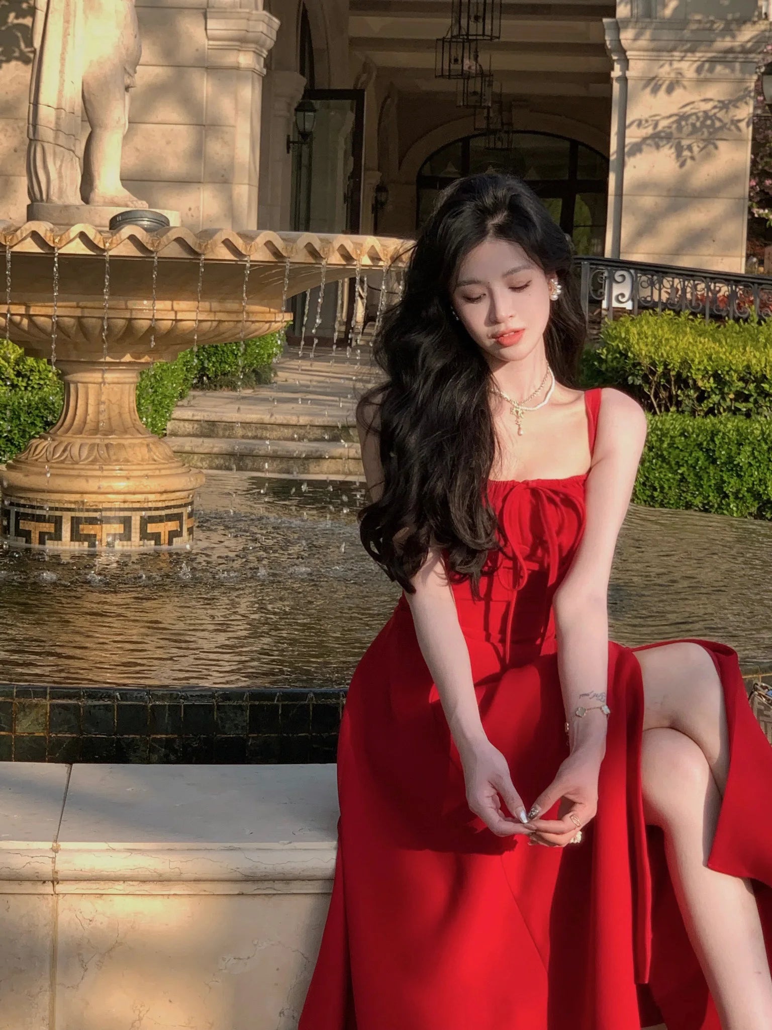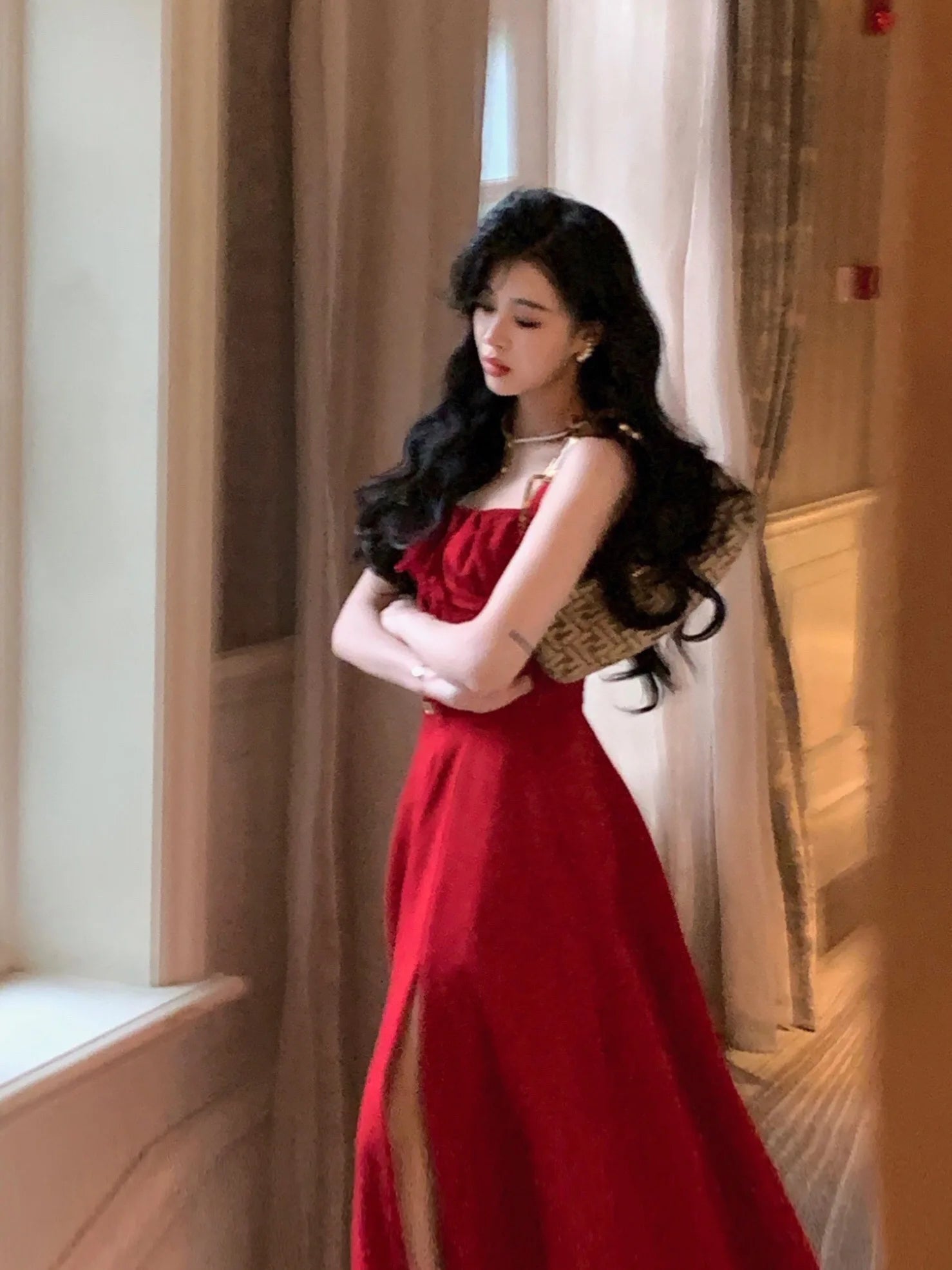 French Elegant White Strap Midi Dress 2023 Summer New Casual Evening Party Dress Women Beach Sleeveless Lace-up Red Dress Korean