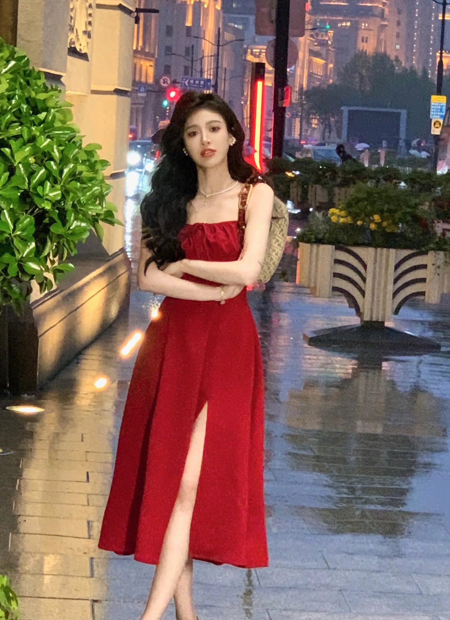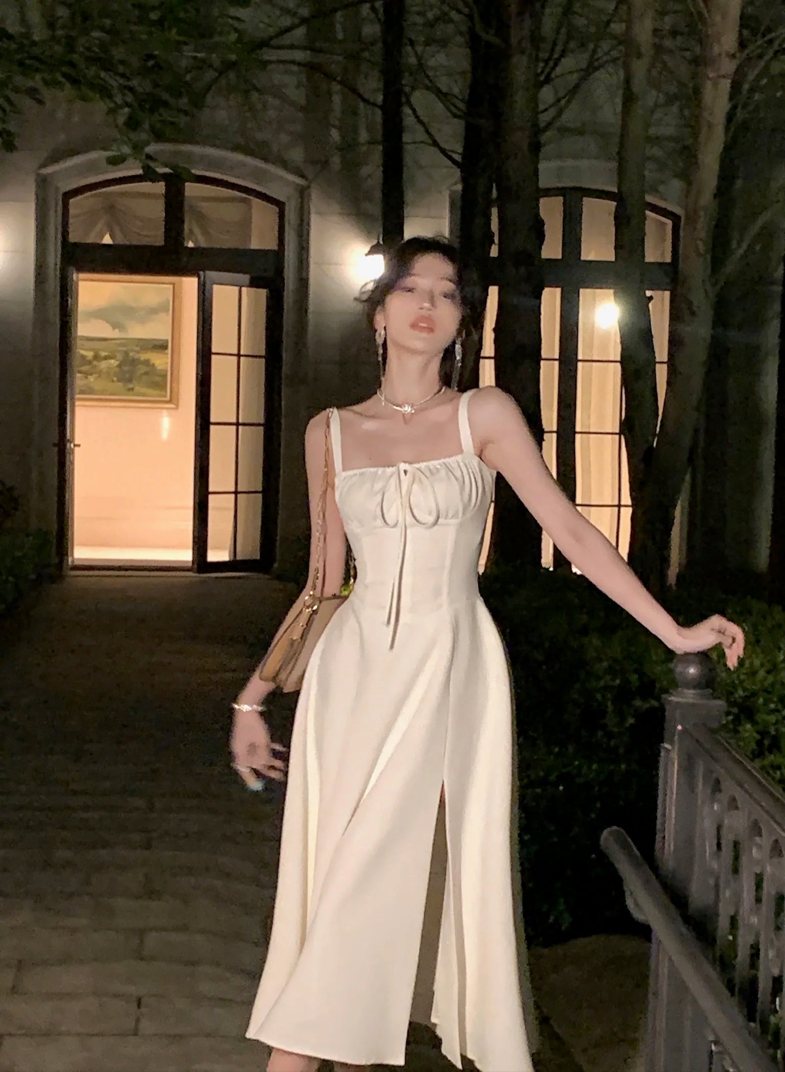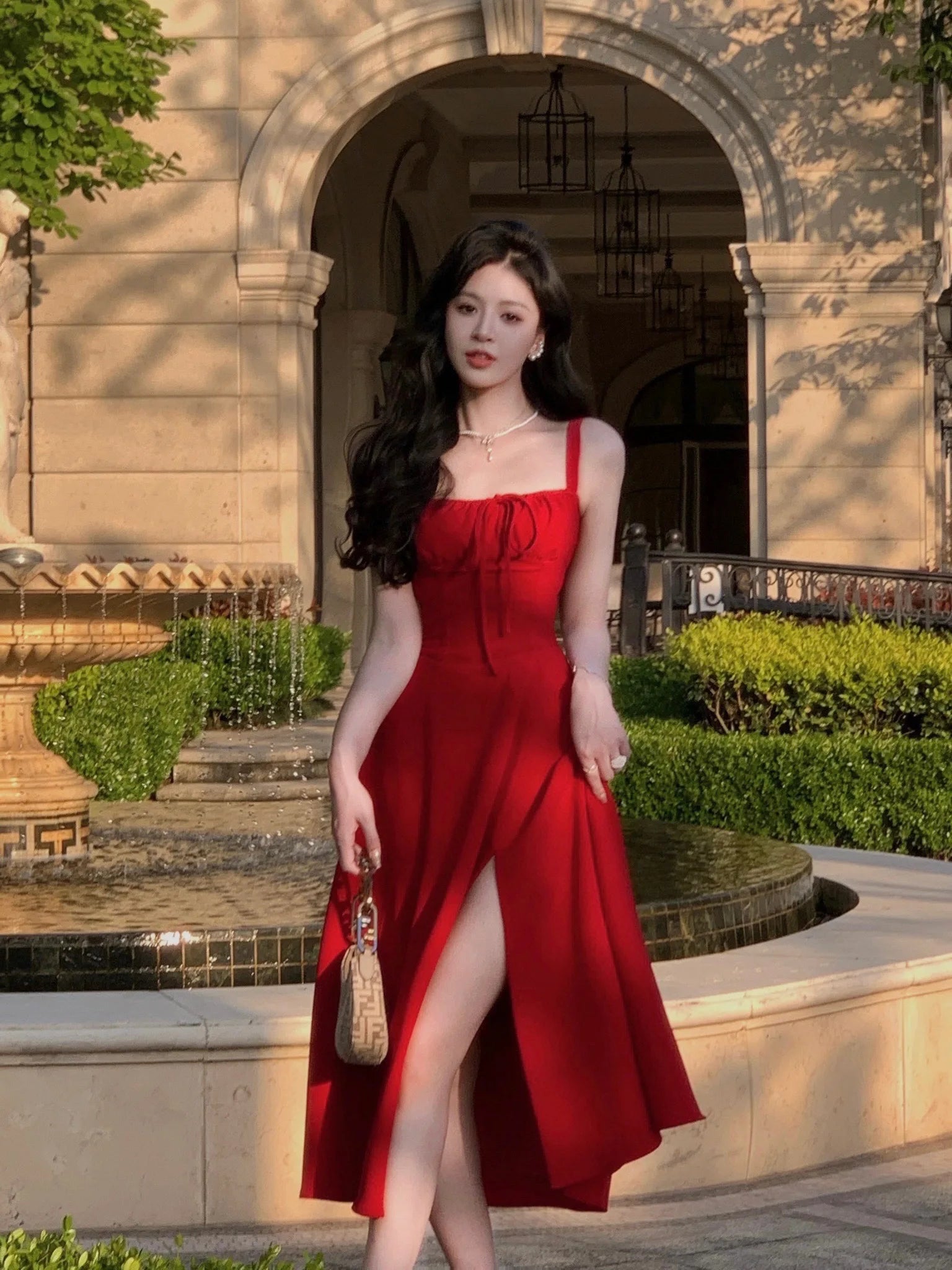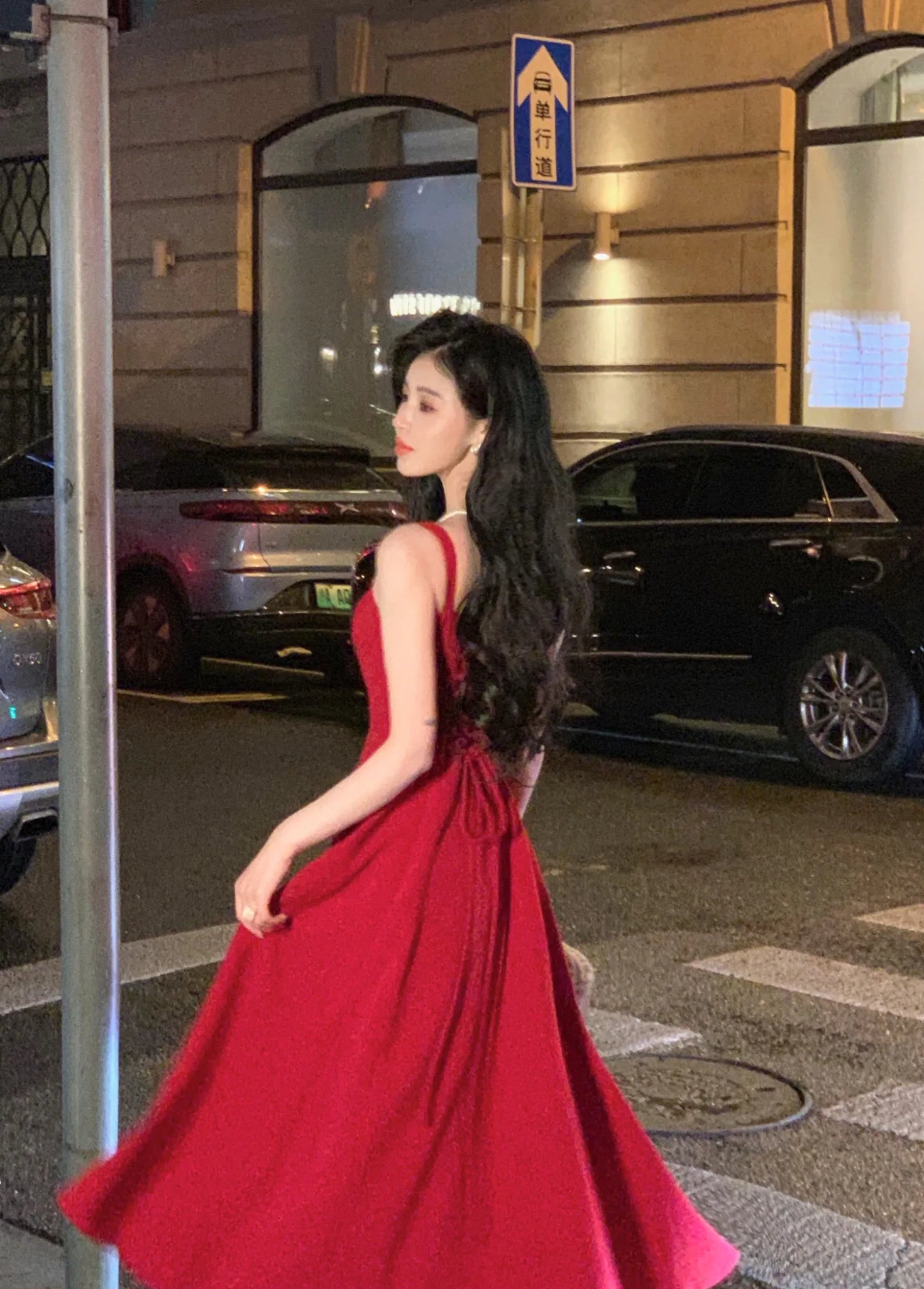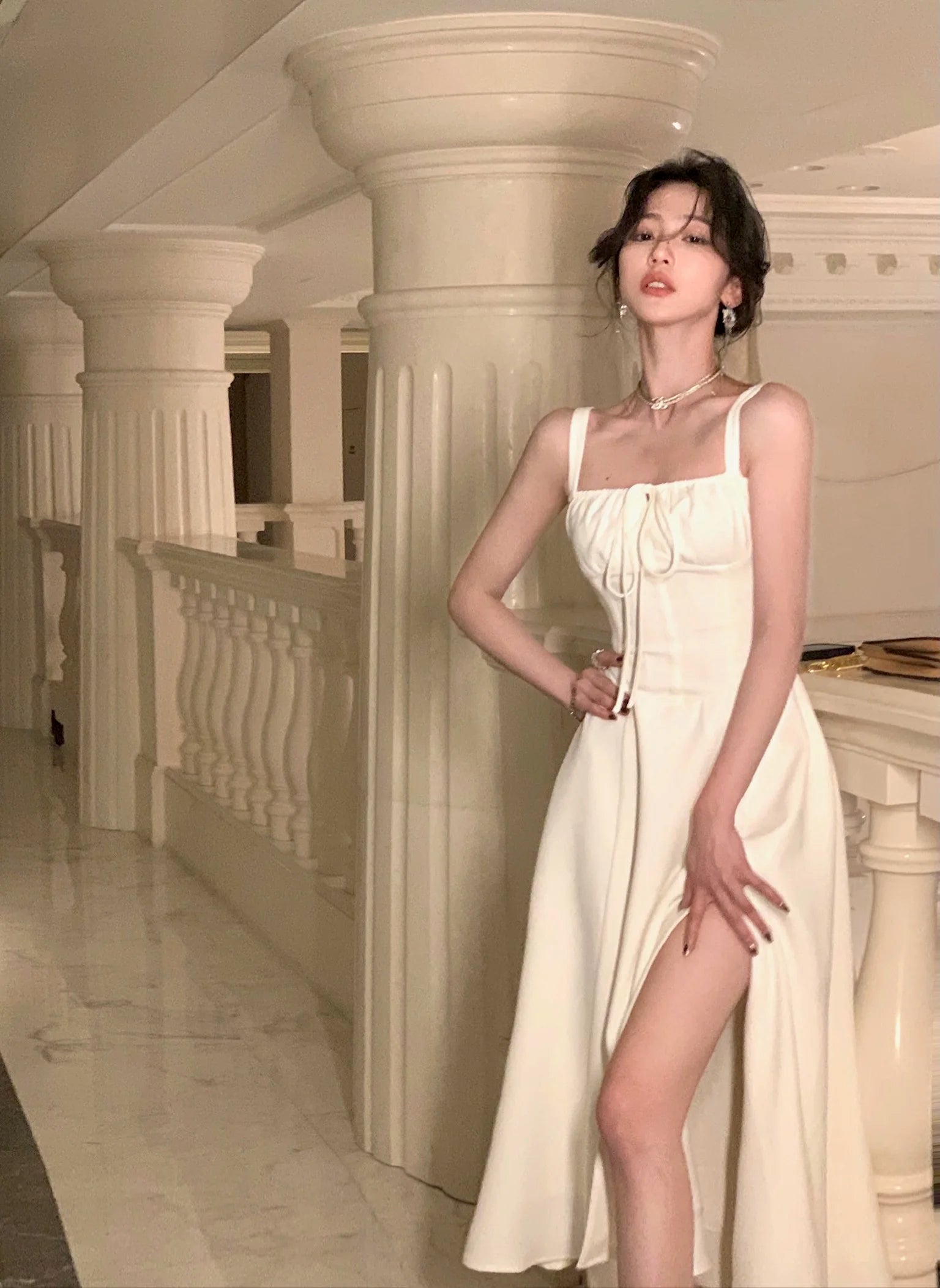French Elegant White Strap Midi Dress 2023 Summer New Casual Evening Party Dress Women Beach Sleeveless Lace-up Red Dress Korean