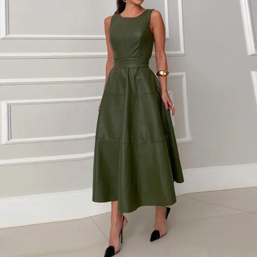Solid Patchwork Leather Simple Party Dress, Women Spring Summer Lace-Up O Neck Maxi Dress, 2024 Sleeveless Elegant Ladies Dress