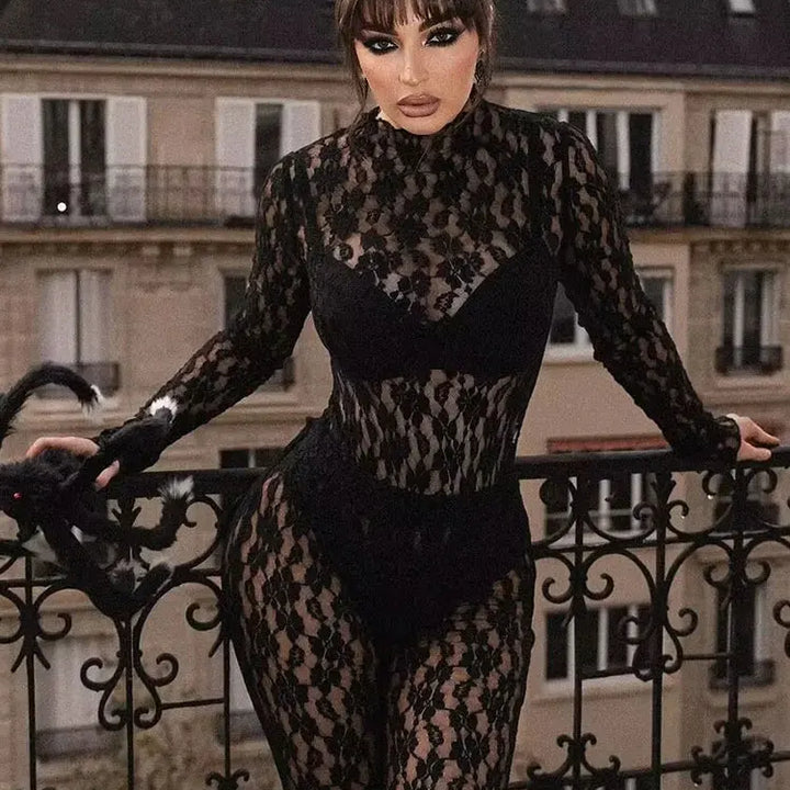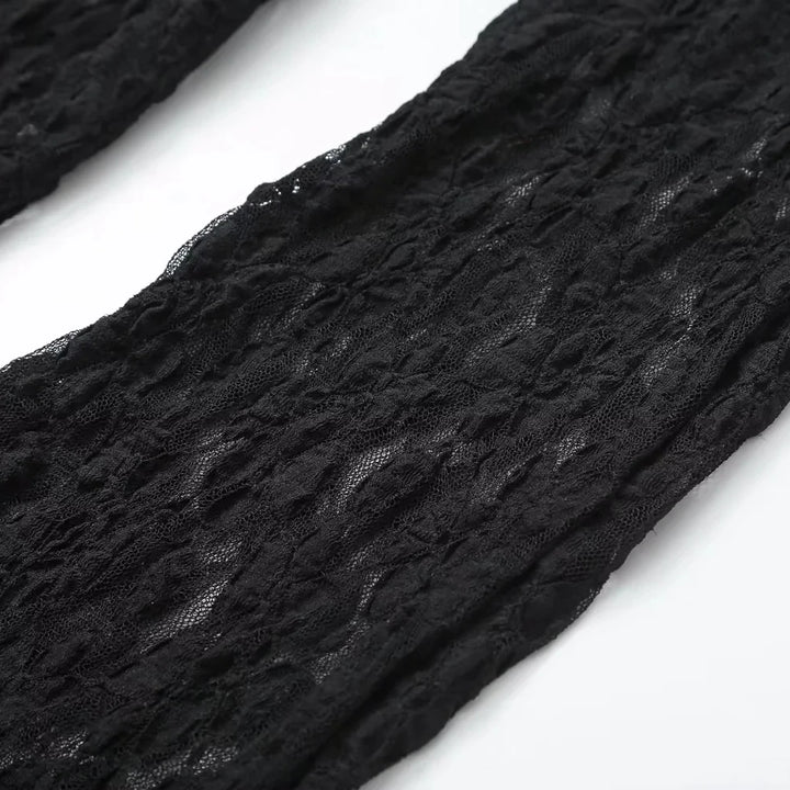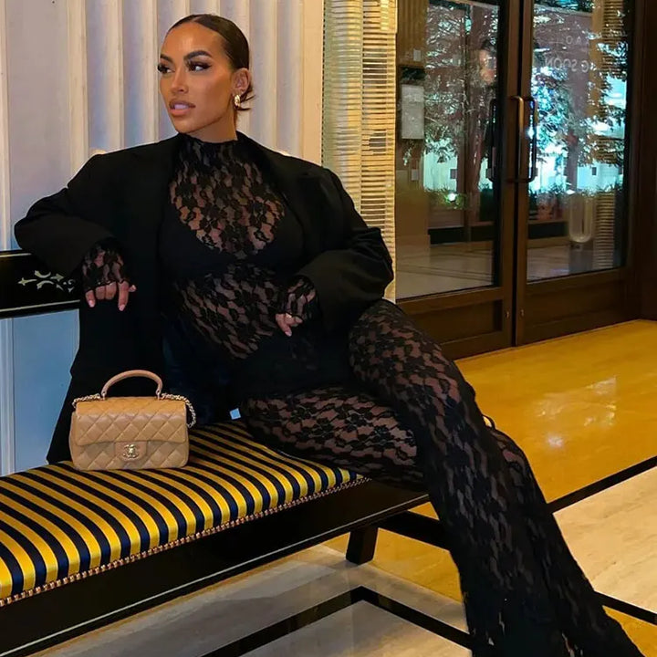 TRAFZA Womens Lace Pants Sets Slim Jumpsuits Top + High Waist Trousers Sexy Lady Floral Lace Translucent Y2k Bodysuit Suits