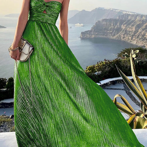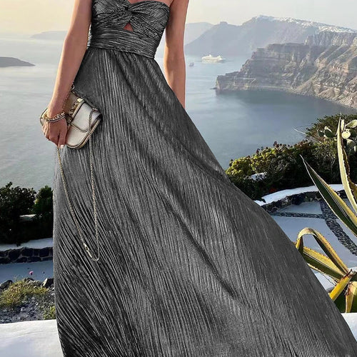 2022 Sexy Strapless Hollow Out Long Dress Women Boho Elegant Bronzing Evening Dress Fashion Sleeveless A-Line Party Dress