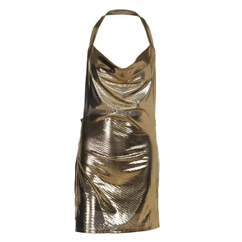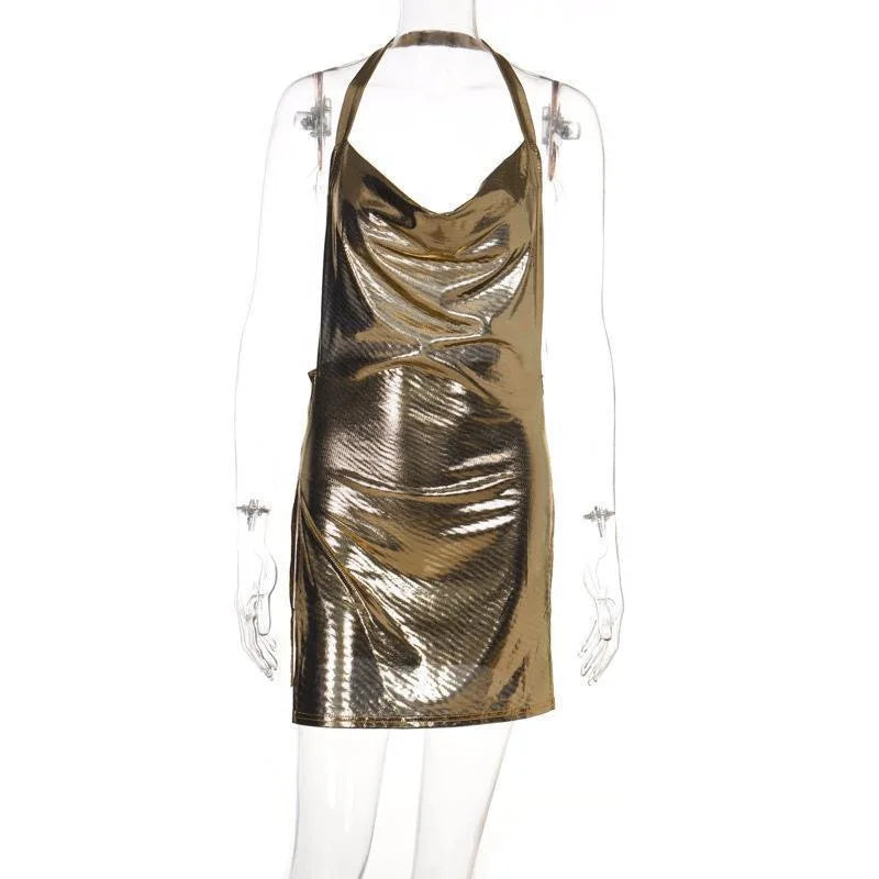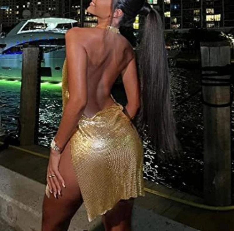 2024 Summer Clothes Bling Glitter Women Halter Mini Dress Side Slit Backless Bodycon Sexy Streetwear Party Club Festival Vestido