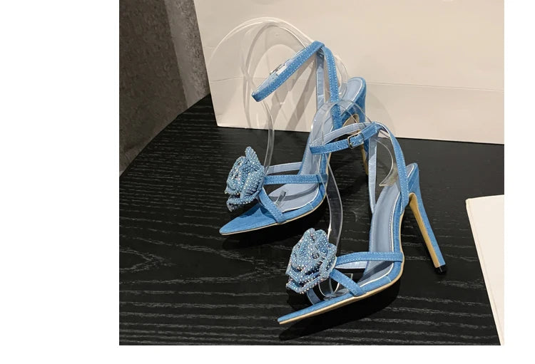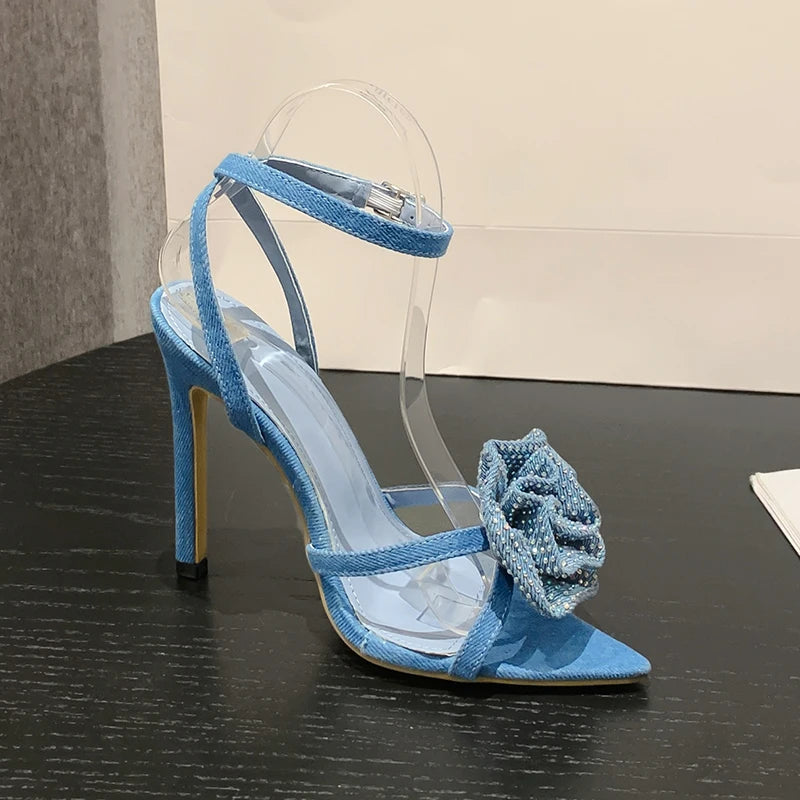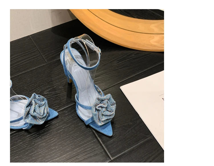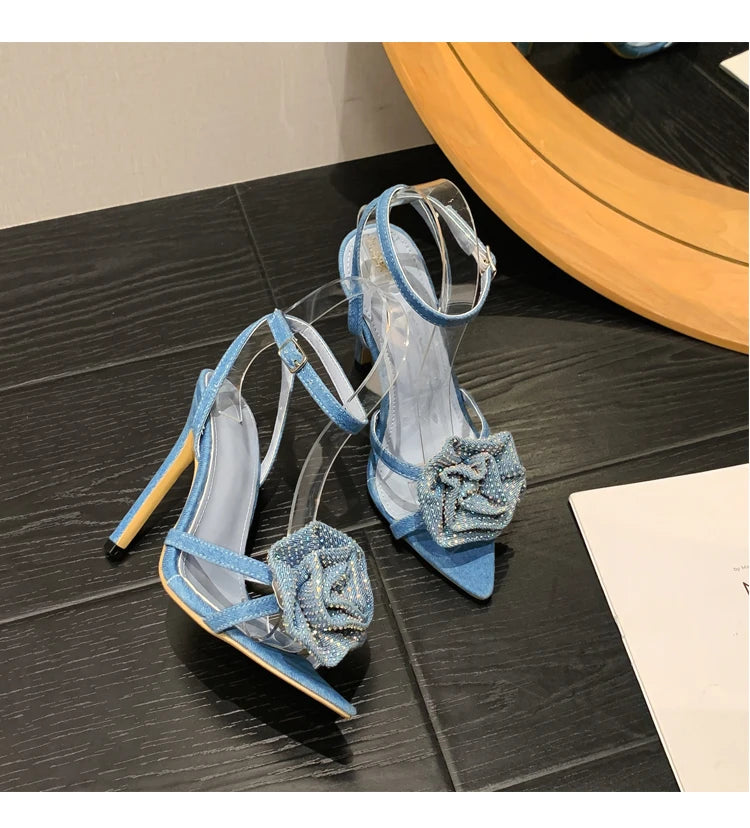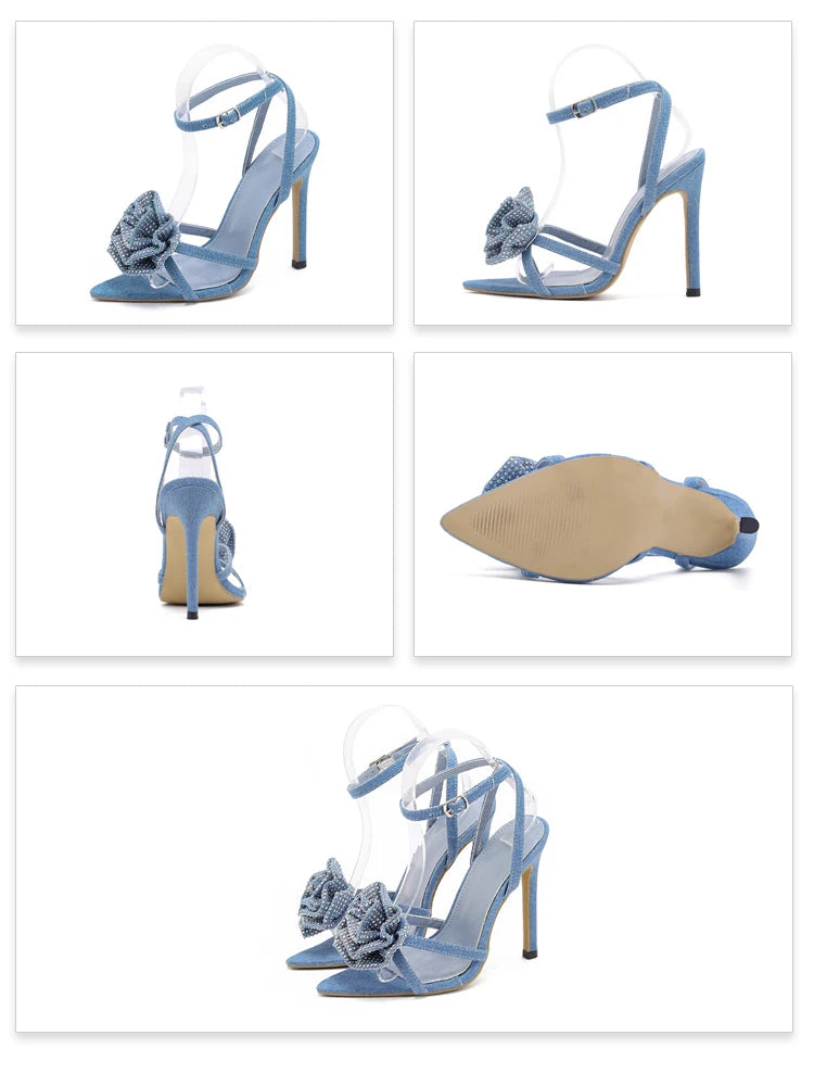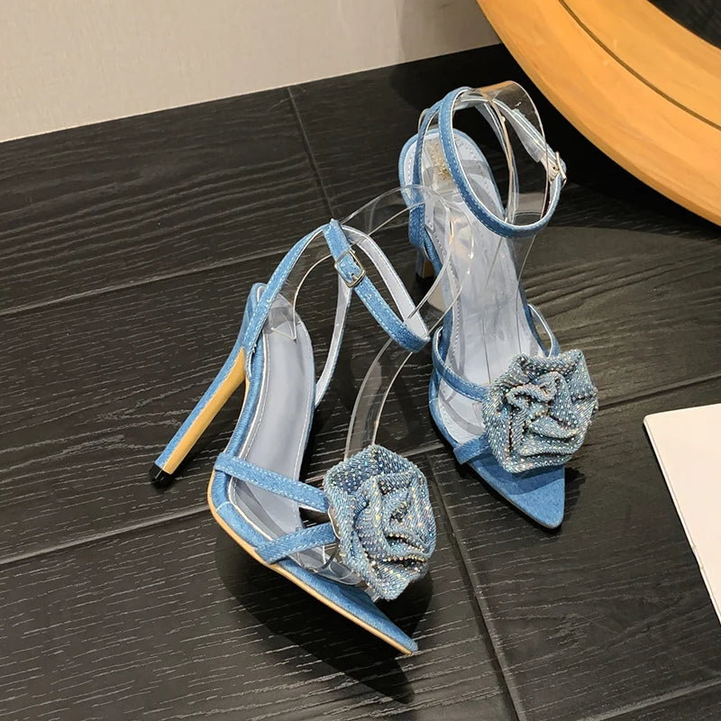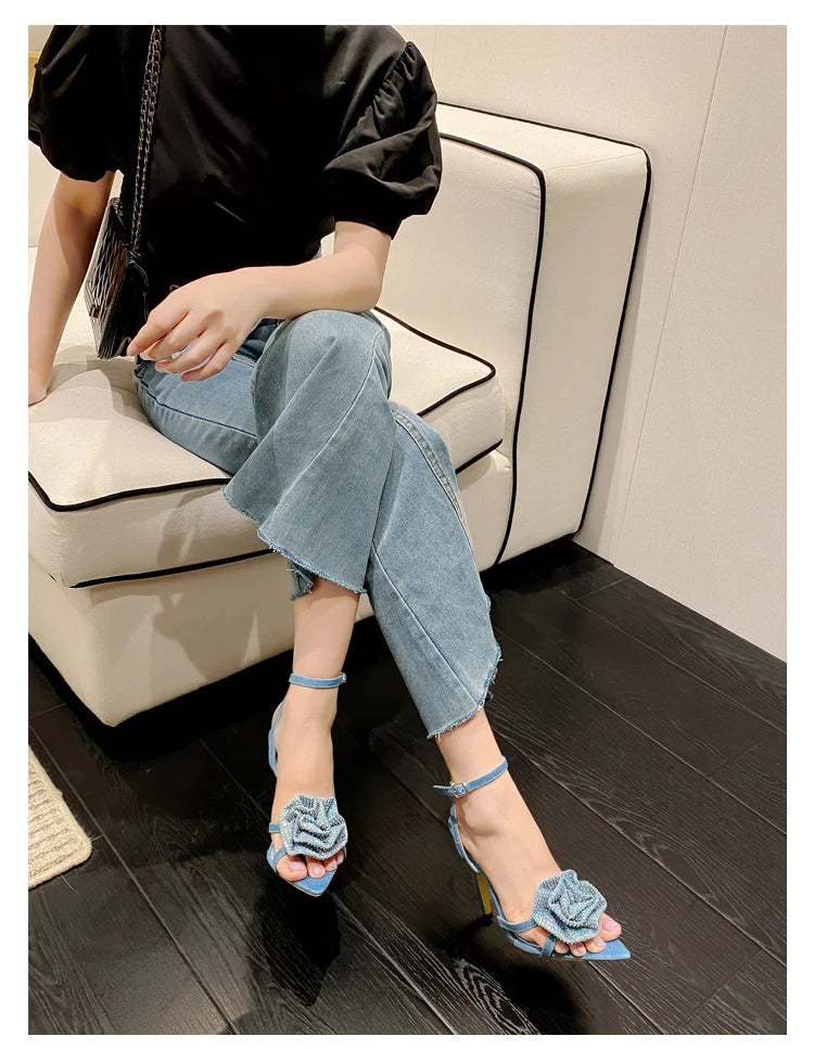 Aneikeh 2025 Fashion Denim Buckle Strap High Heels Women's Sexy Pointed Open Toe Crystal Flower Slim Heel Sandals Party Dress