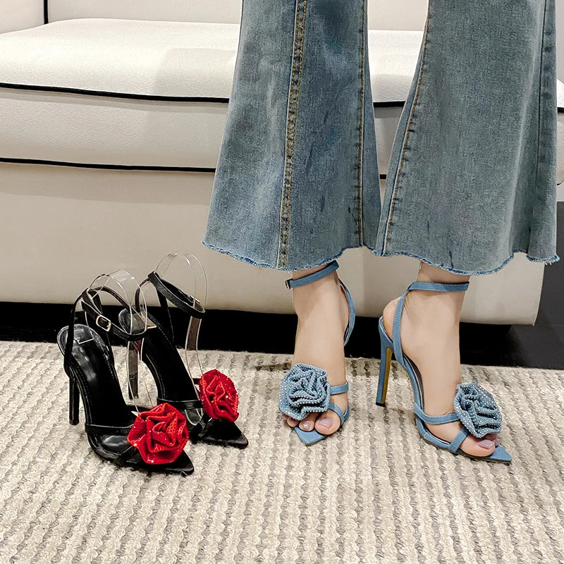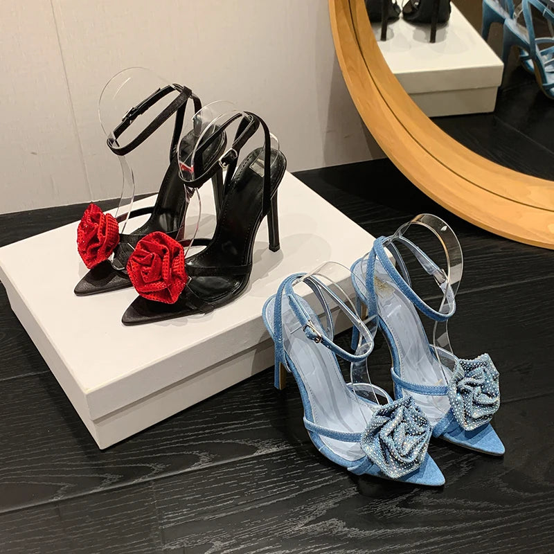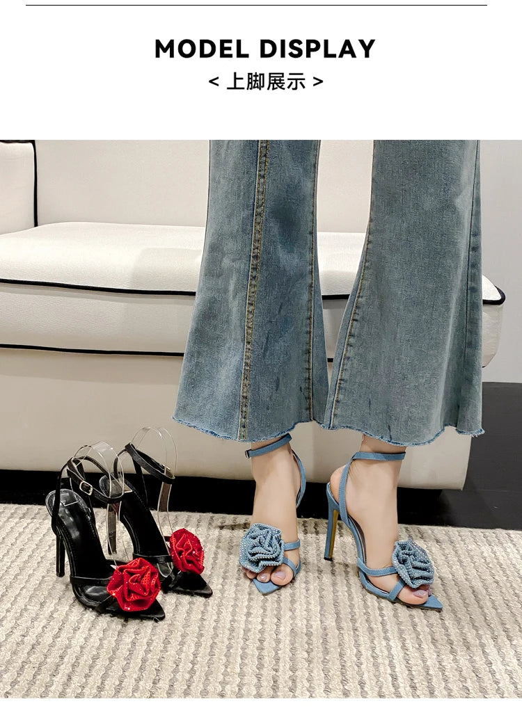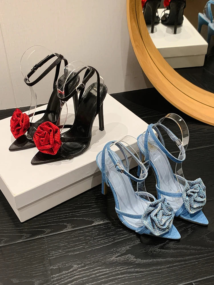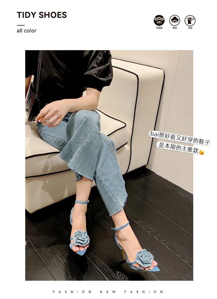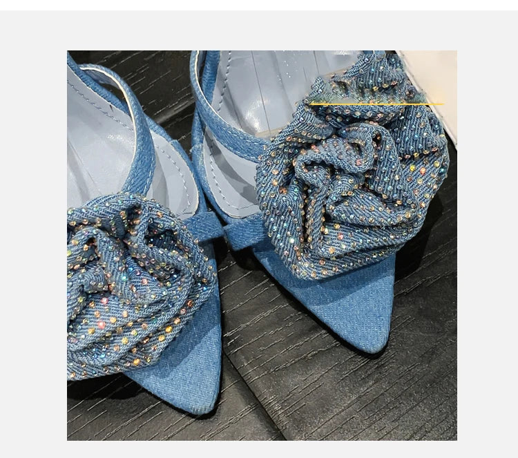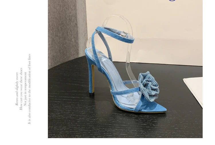 Aneikeh 2025 Fashion Denim Buckle Strap High Heels Women's Sexy Pointed Open Toe Crystal Flower Slim Heel Sandals Party Dress