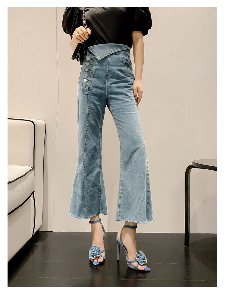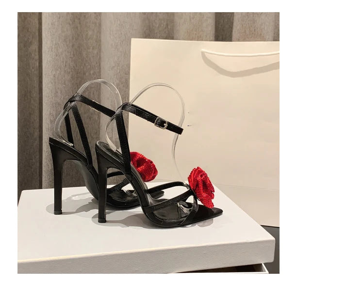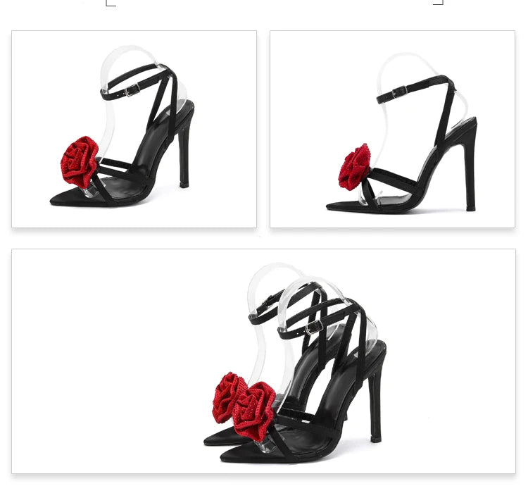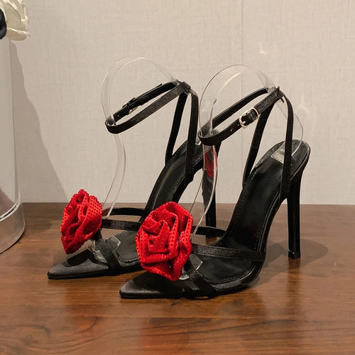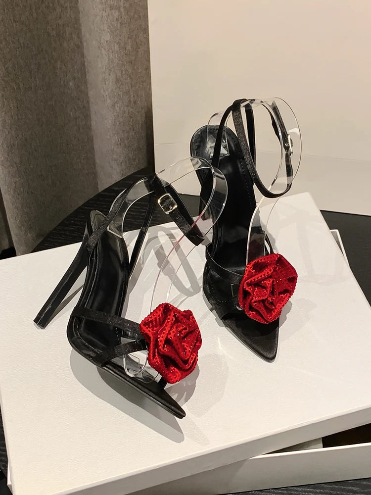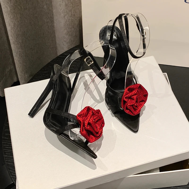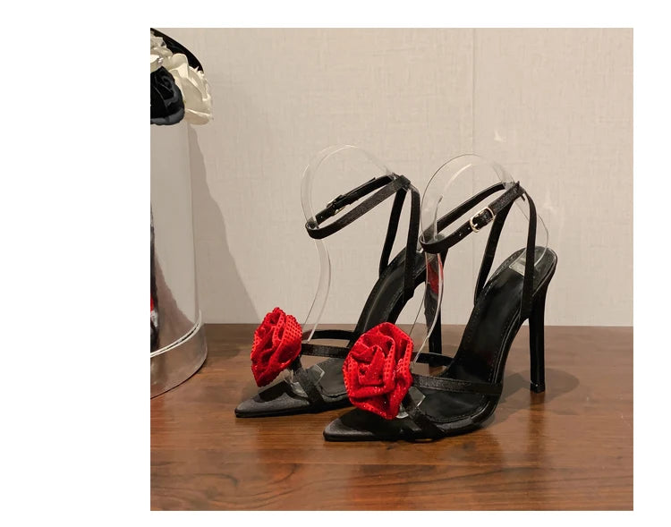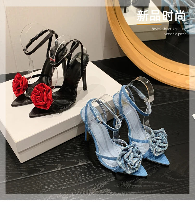 Aneikeh 2025 Fashion Denim Buckle Strap High Heels Women's Sexy Pointed Open Toe Crystal Flower Slim Heel Sandals Party Dress