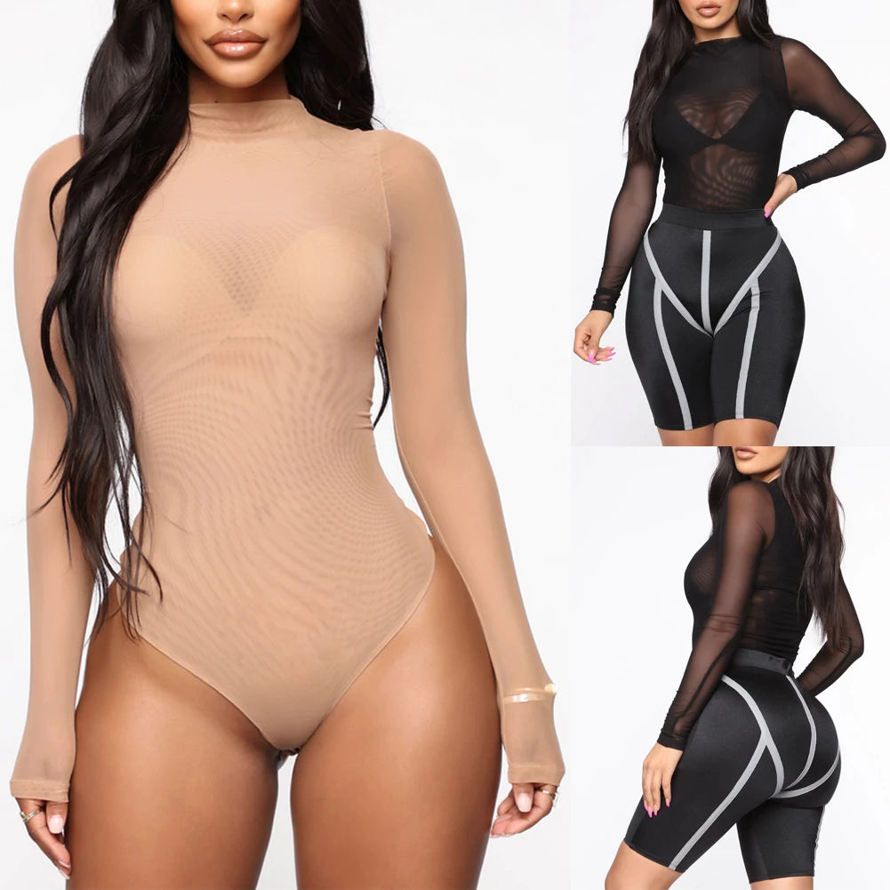 Bodysuits High Neck Bodycon Jumpsuit See Through Romper Black Beige NEW Sexy Mesh See Through Bodysuit Women Long Sleeve Sheer