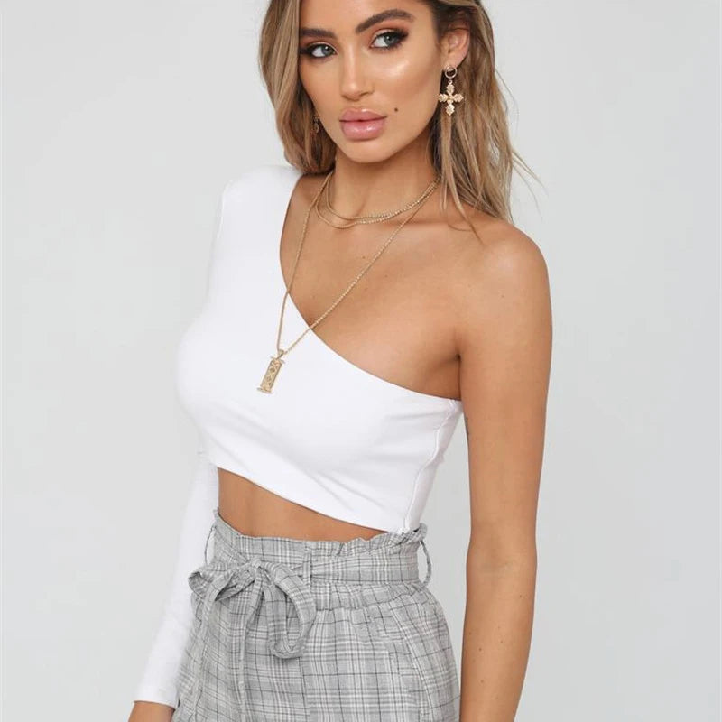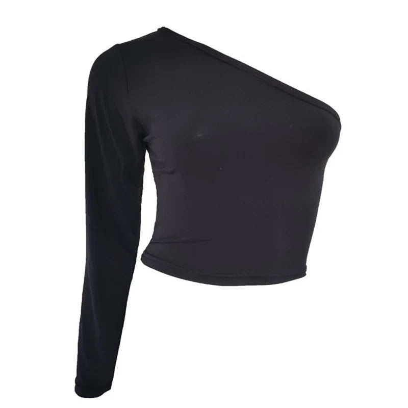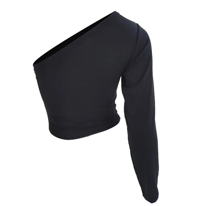 CDJLFH Sexy One Shoulder Crop Top T Shirt Women Diagonal Collar Long Sleeve Tshirt Casual Basic White Slim Fit Bodycon Tees Tops