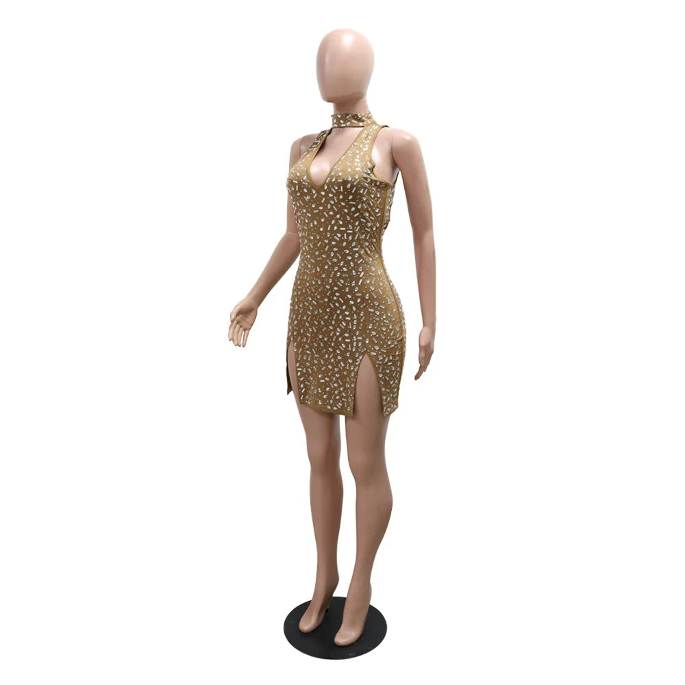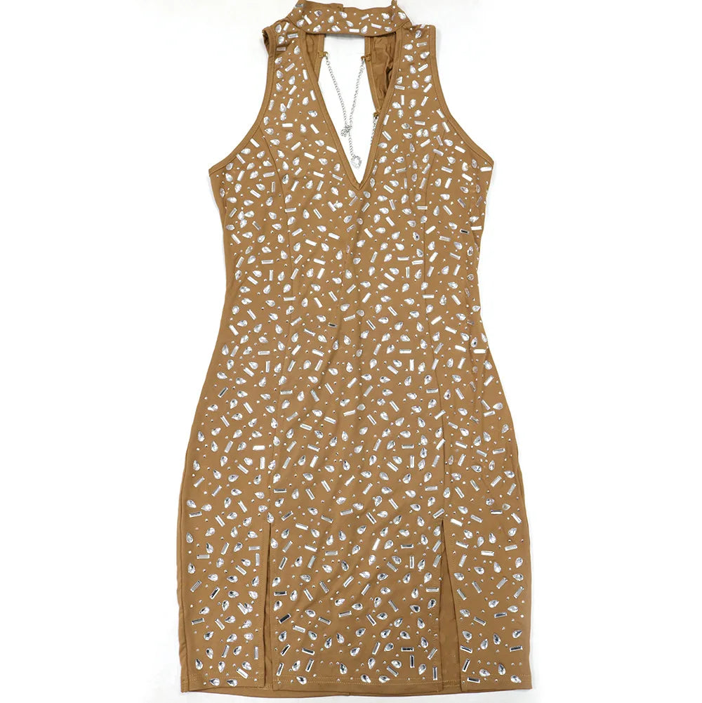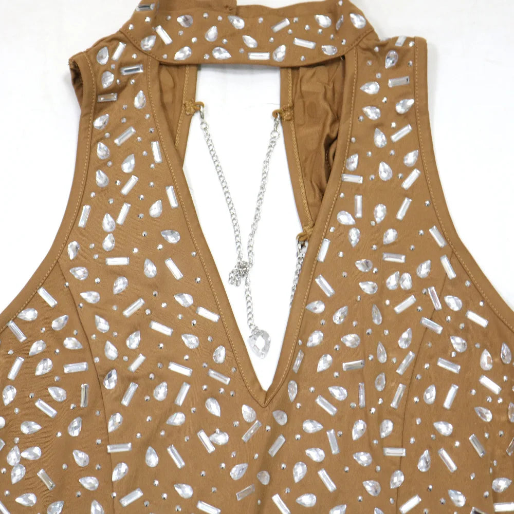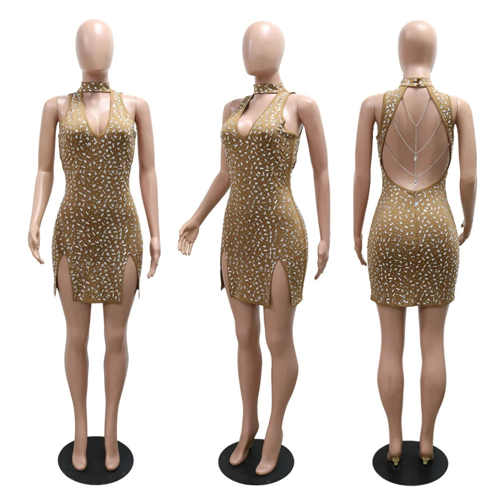 CM.YAYA Women V-neck Diamonds Rhinestones Chocker Sleeveless Mini Dress Bodycon Sexy Evening Night Party Club Vestidos Dresses