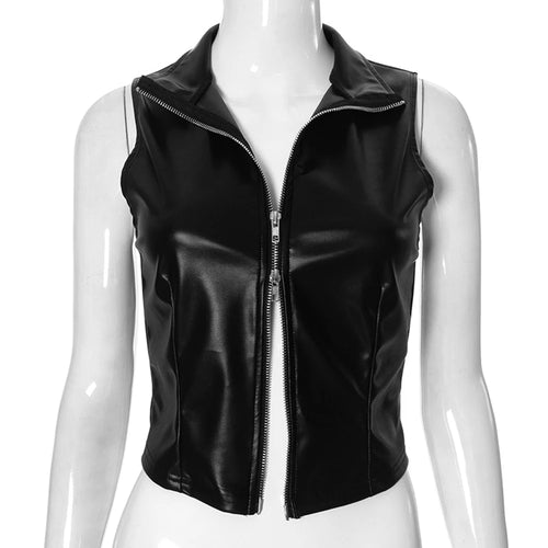 Fashionable Temperament Solid Color PU Leather Splicing Stand Up Collar Sexy Backless Zipper Exposed Navel Slim Fit Vest