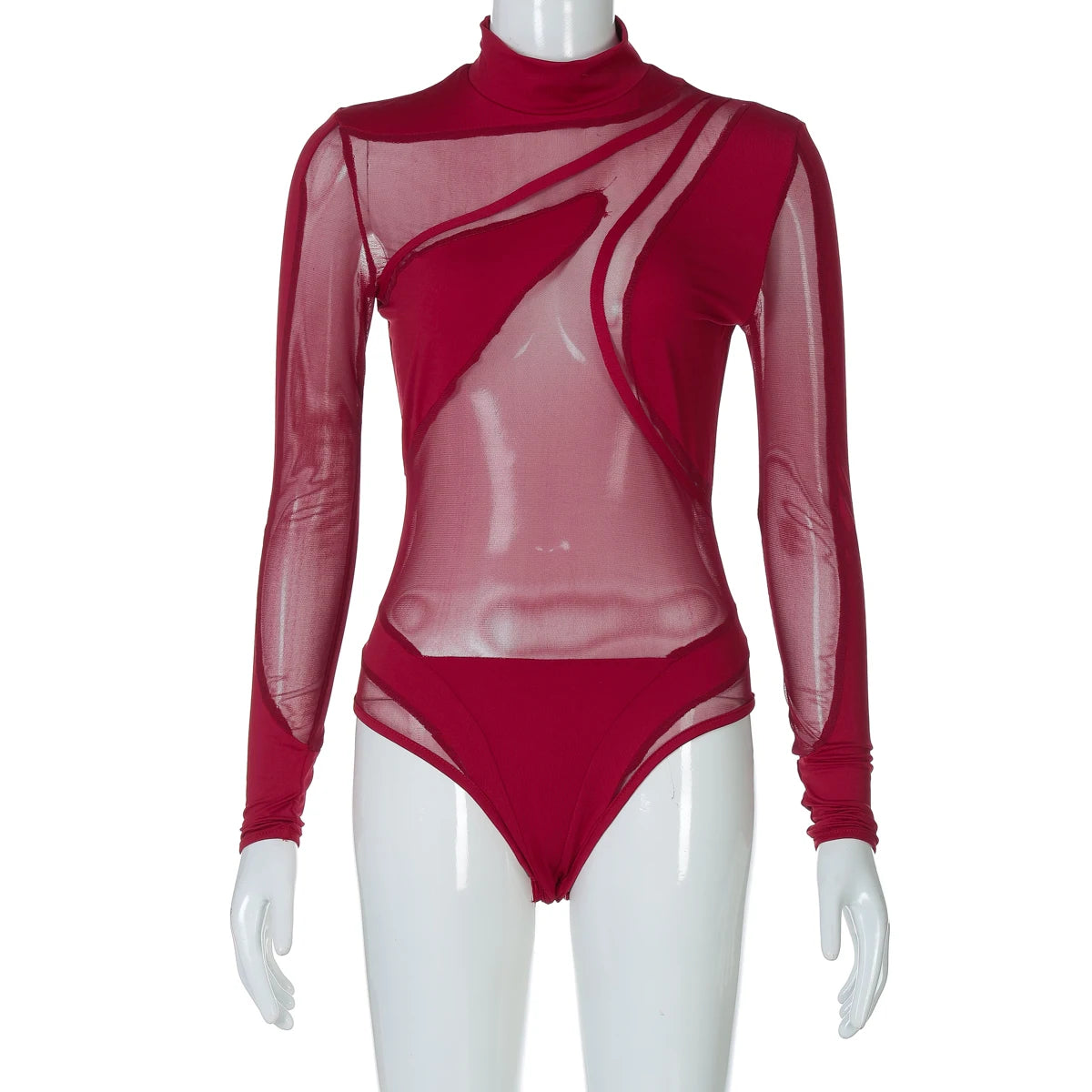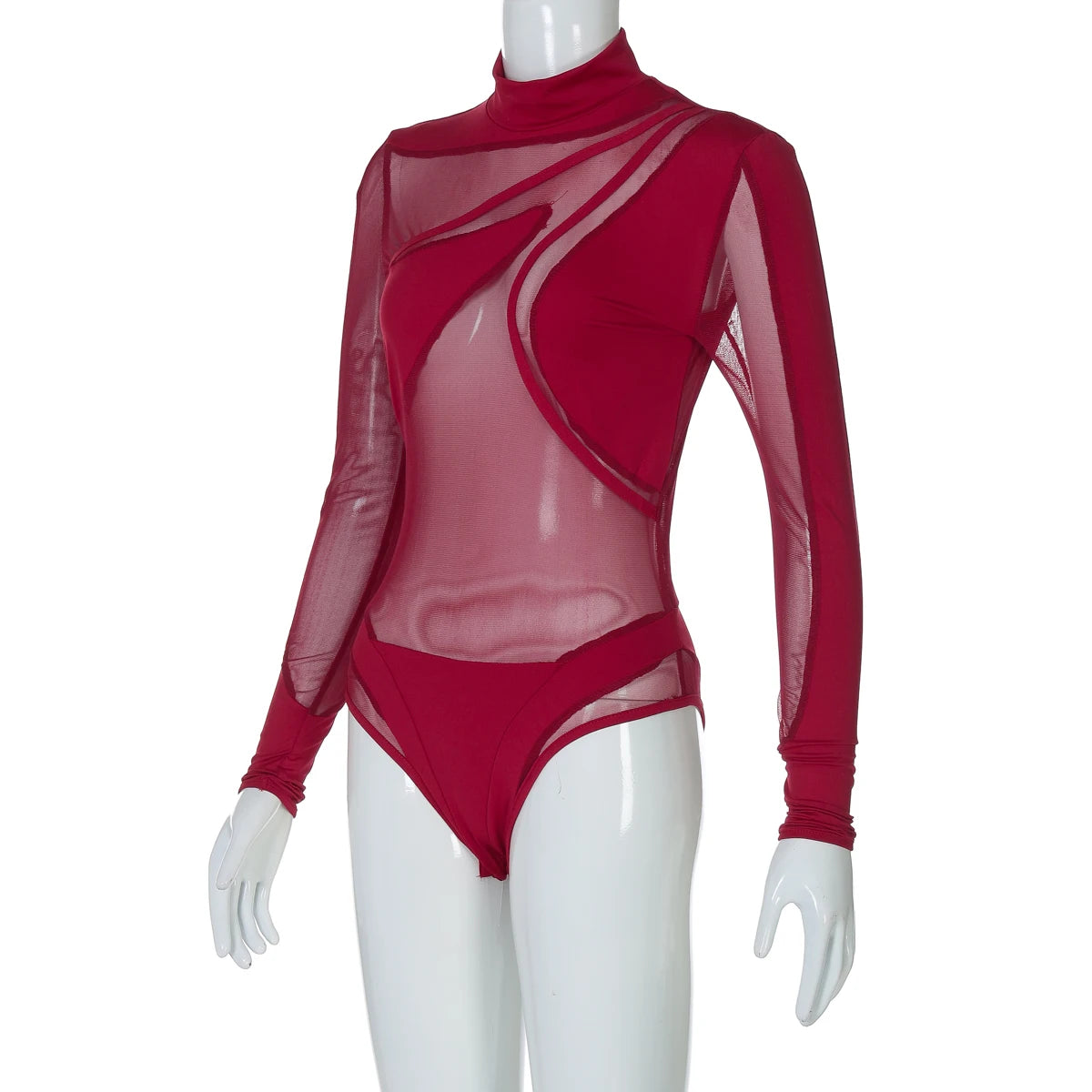 Hugcitar 2024 Turtleneck Long Sleeve Black See Through Sexy Bodycon Bodysuit Spring Summer Women New Outfit Festival Nightclub