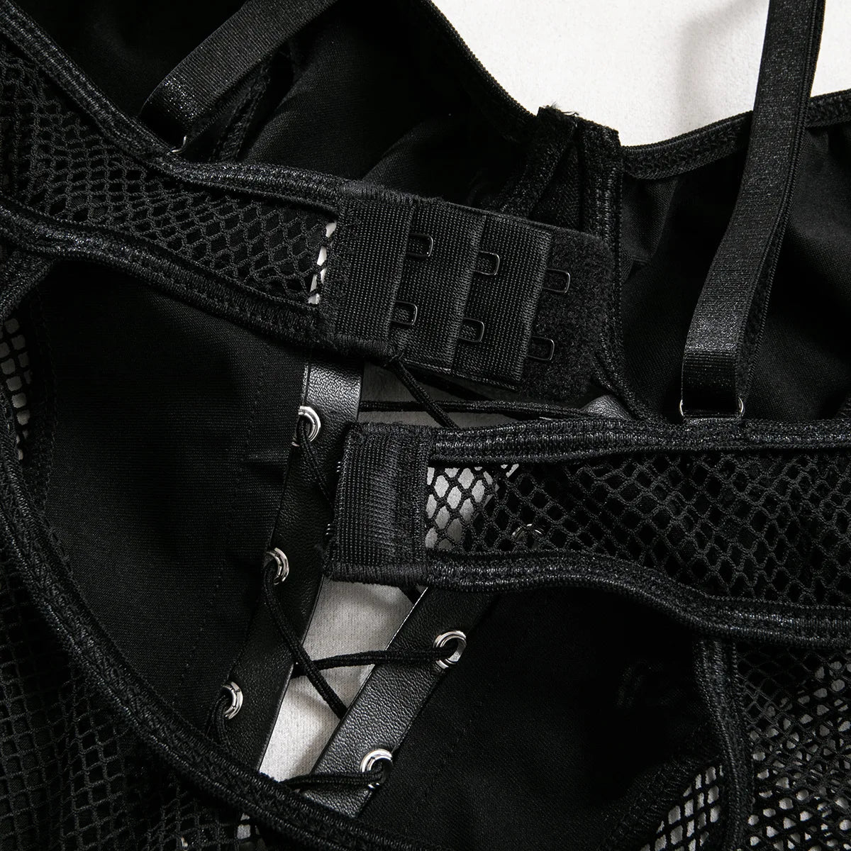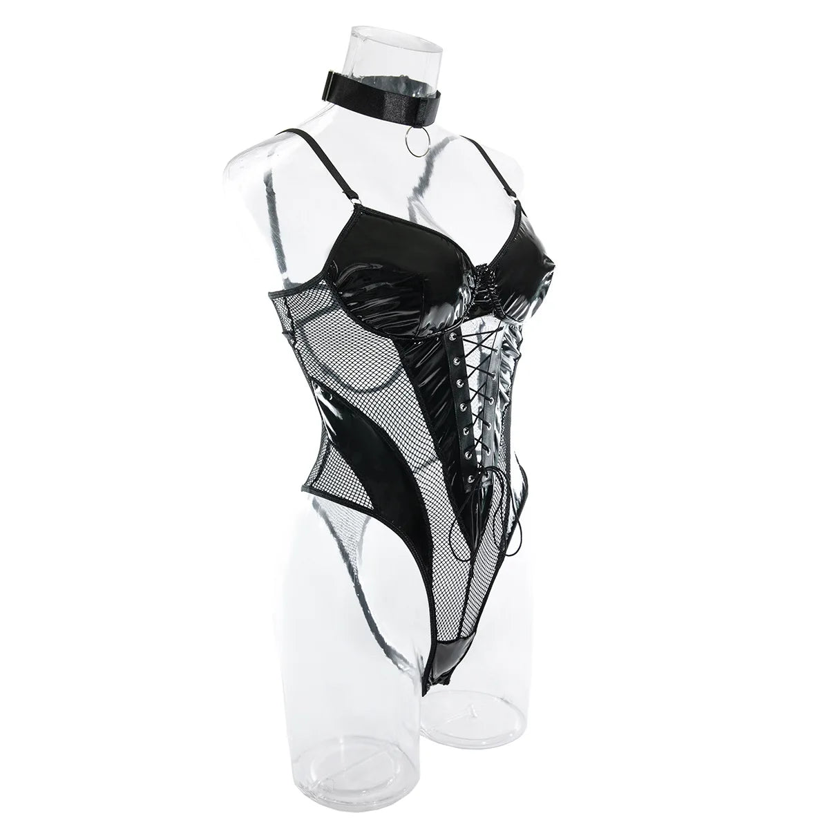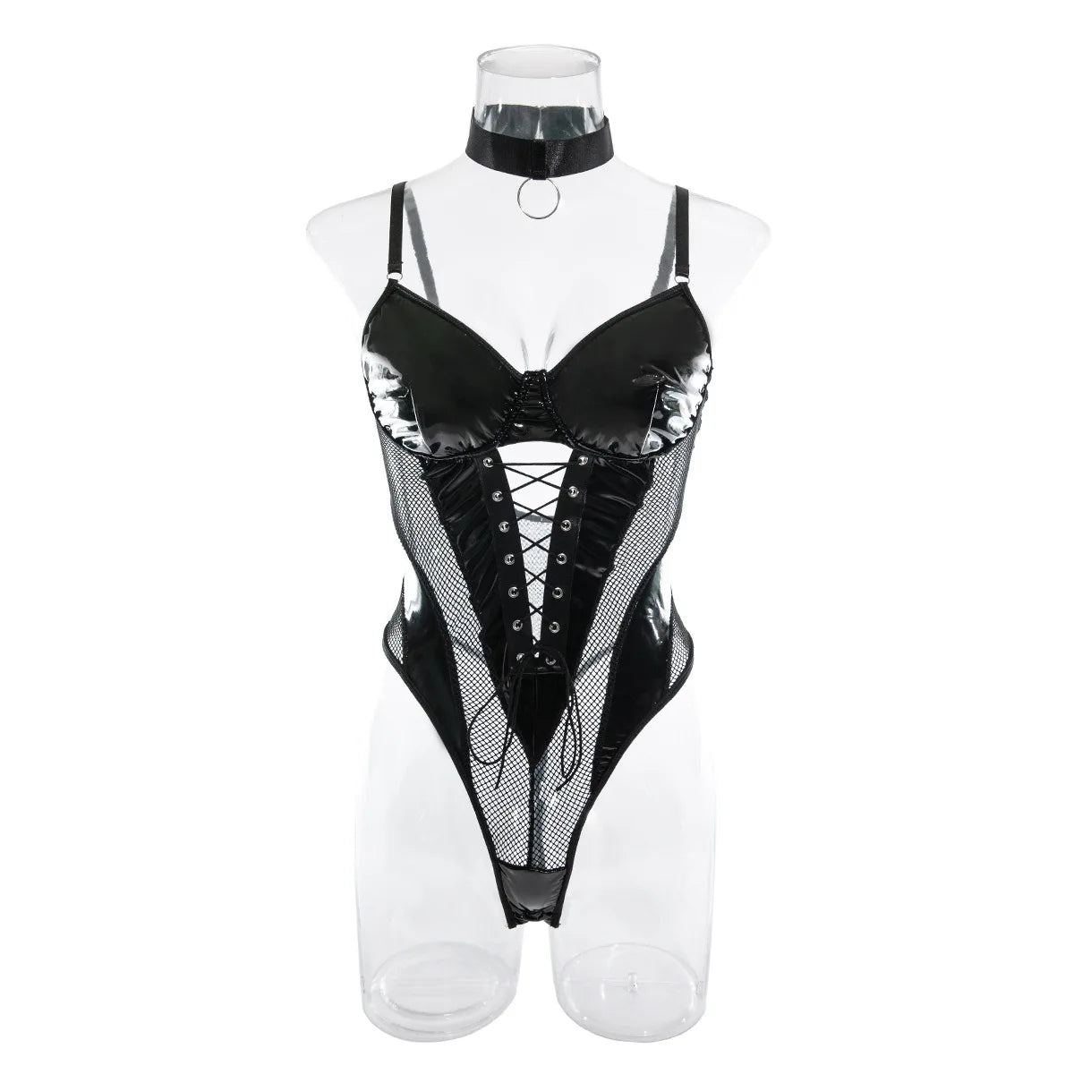 Koltailace Latex Bodysuit Sexy Lace Up Hollow Tops Black Patchwork Fetish PU Body Sissy Leather Crotchless Tight