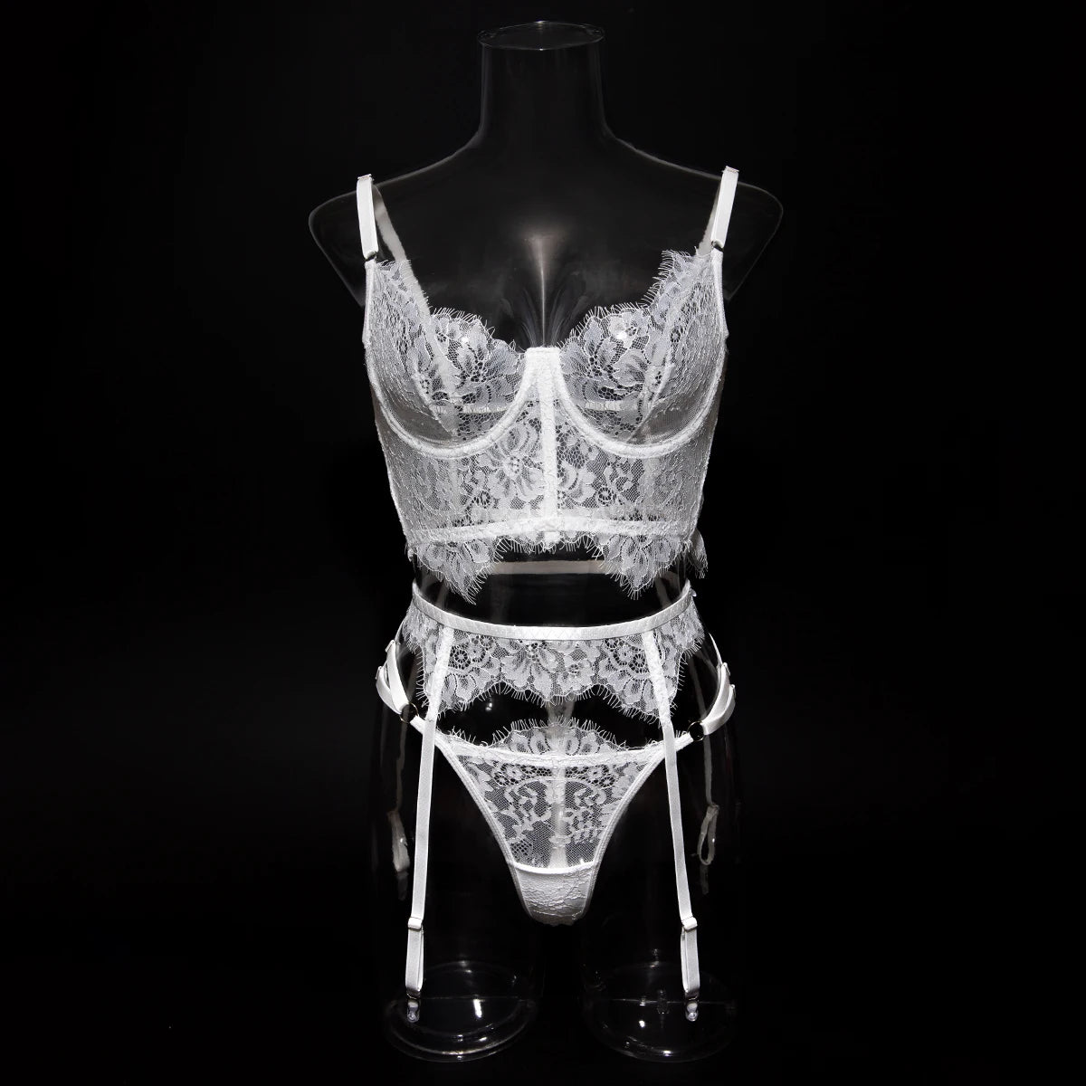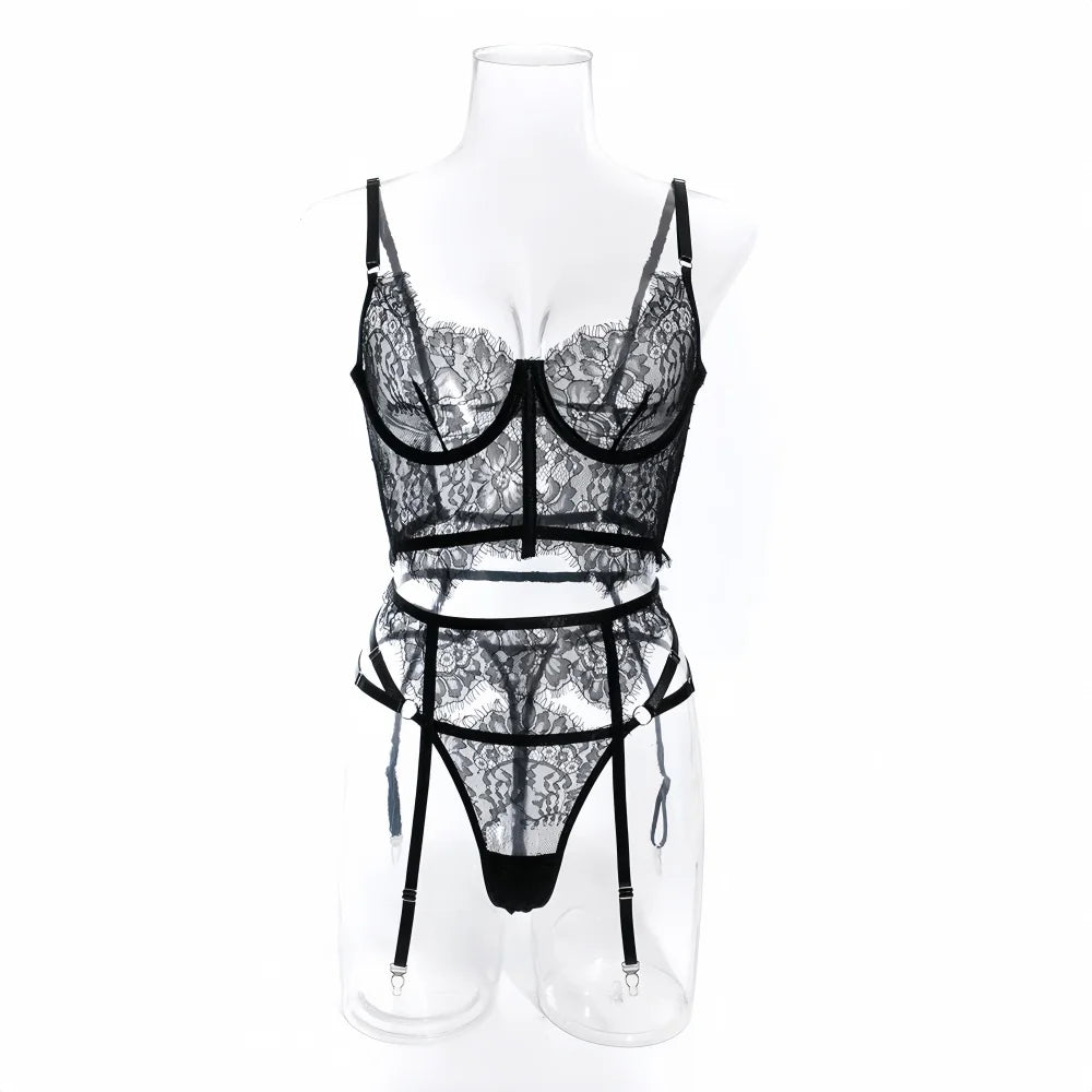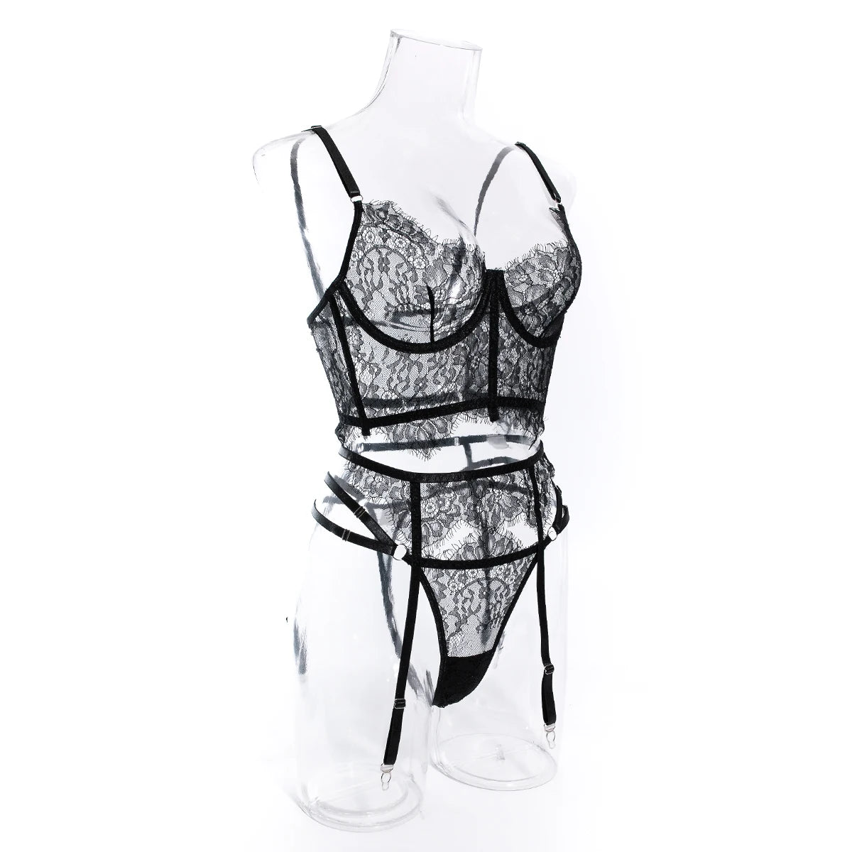 Krasapt Black Lace Hollow Out Sexy Lingerie 3Pcs Sets Mesh Embroidery Backless Bra And Panties Garter Outfits Sensual Erotic Set