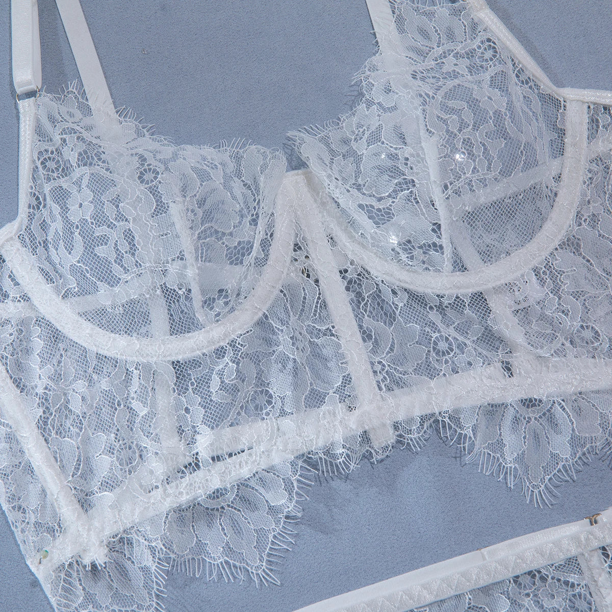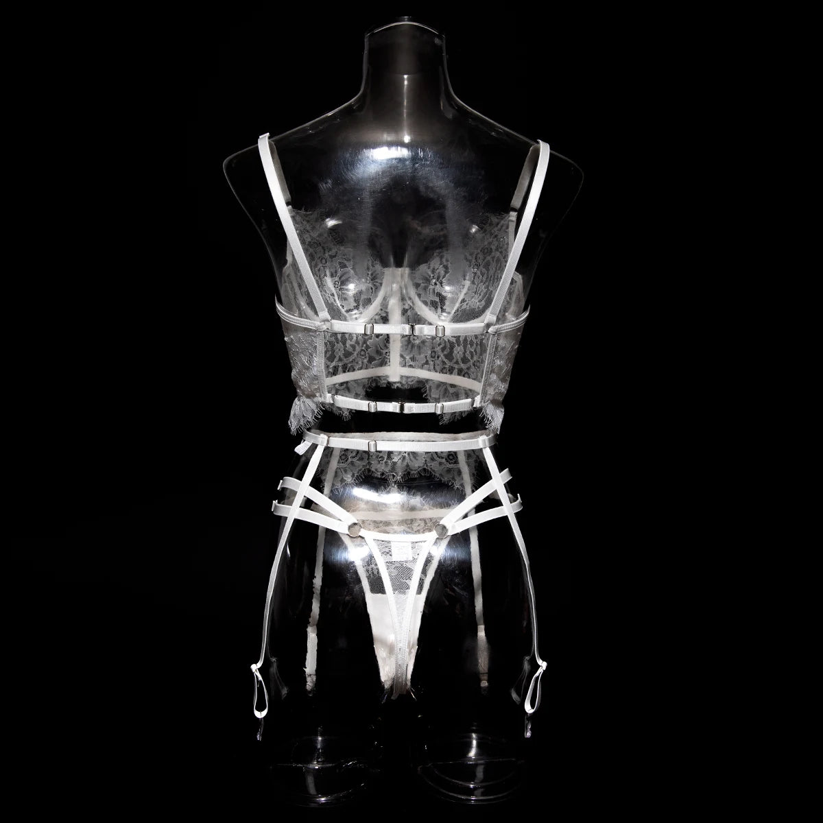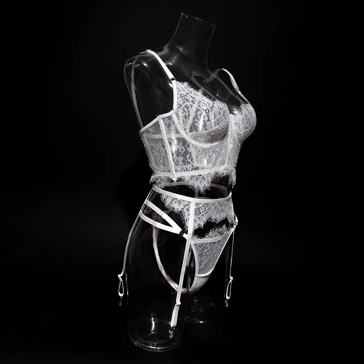 Krasapt Black Lace Hollow Out Sexy Lingerie 3Pcs Sets Mesh Embroidery Backless Bra And Panties Garter Outfits Sensual Erotic Set