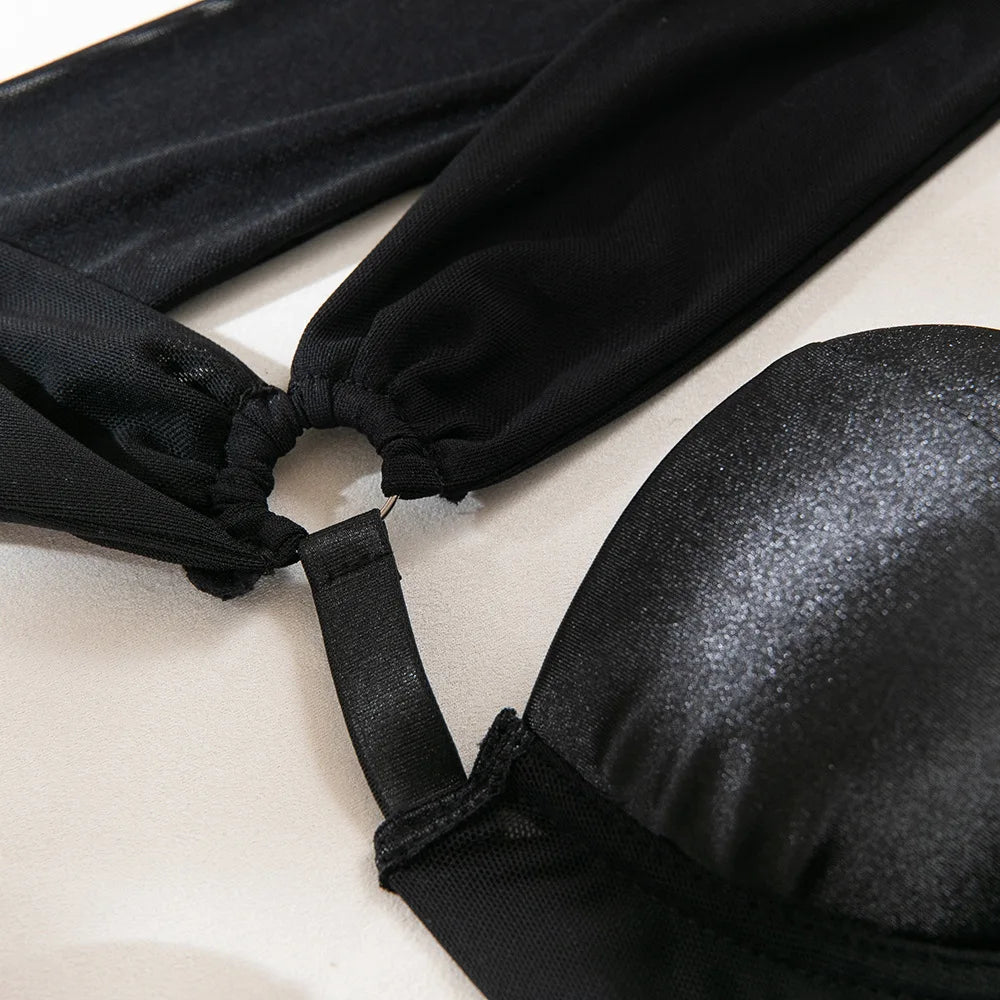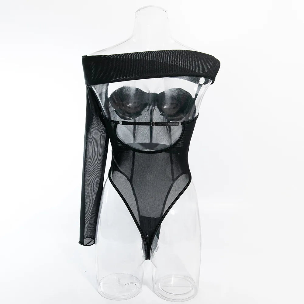 Lady Sexy Single Shoulder Sleeve Shapewear Chest Gathered Cotton Splicing Mesh Underwear Women's Black Hollow Backless Jumpsuit