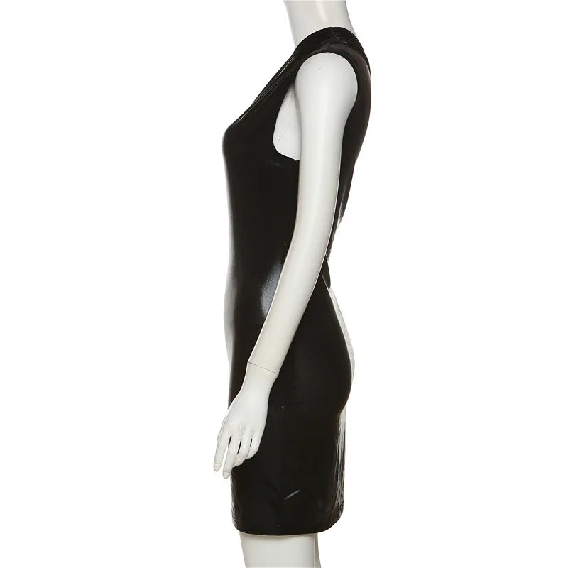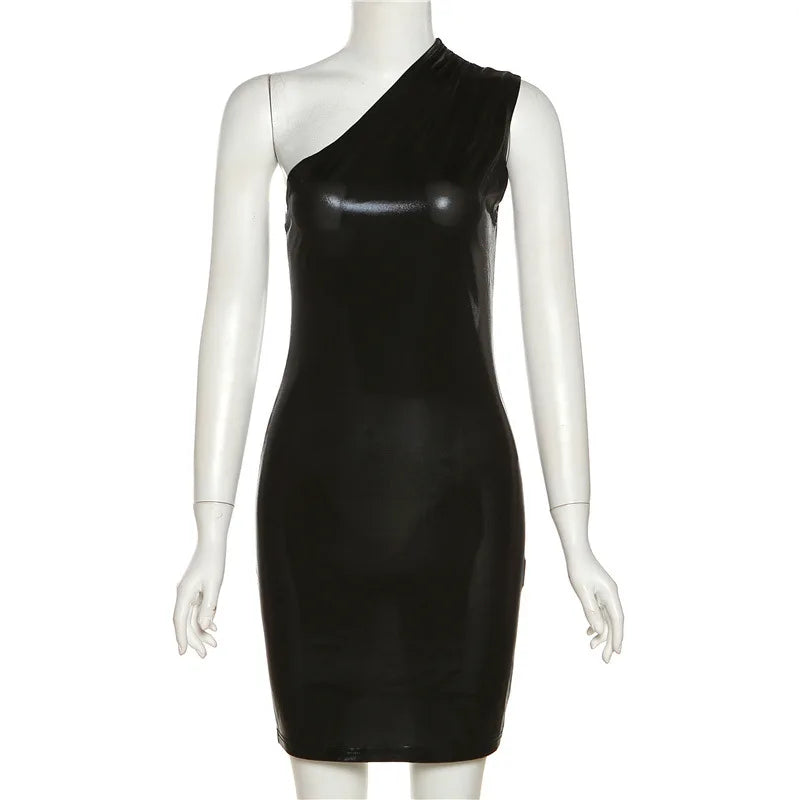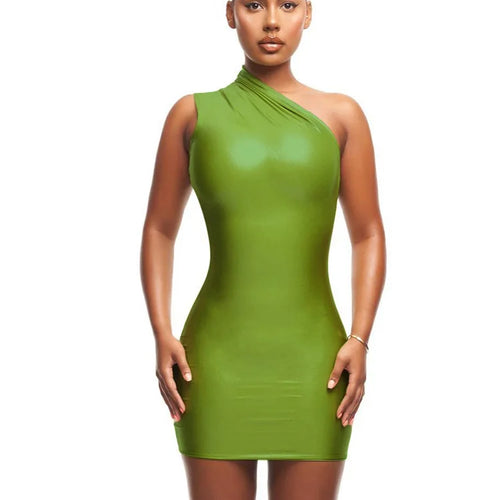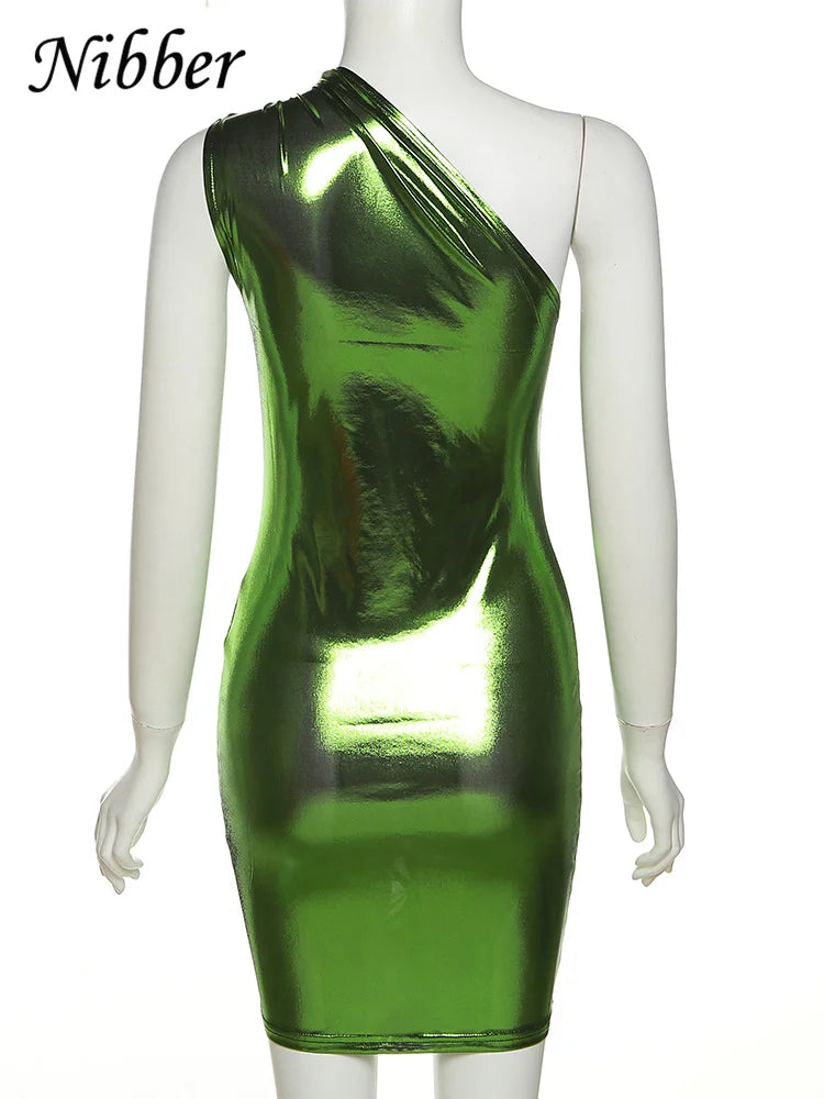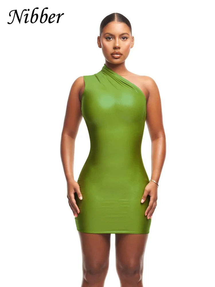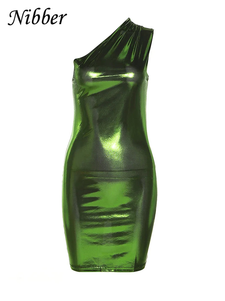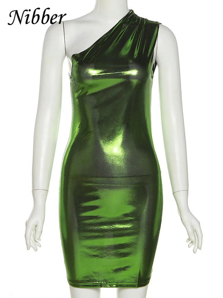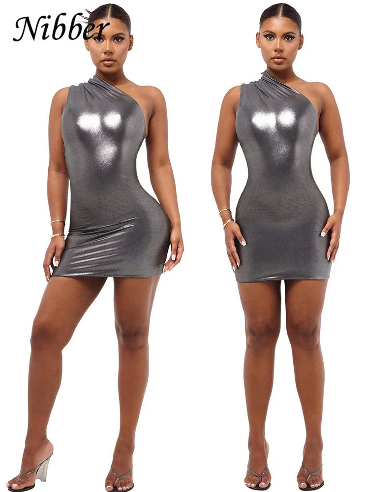 Nibber Shiny Solid Mini Dress Women Fashion Sexy Diagonal Collar Sleeveless Body-Shaping Pag Hip dresses Female Streetwear