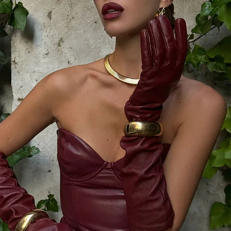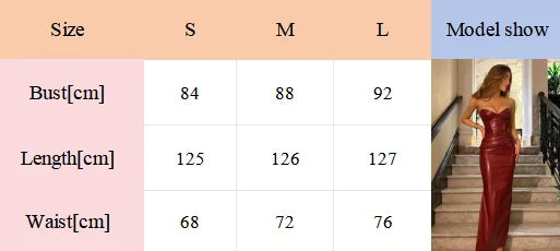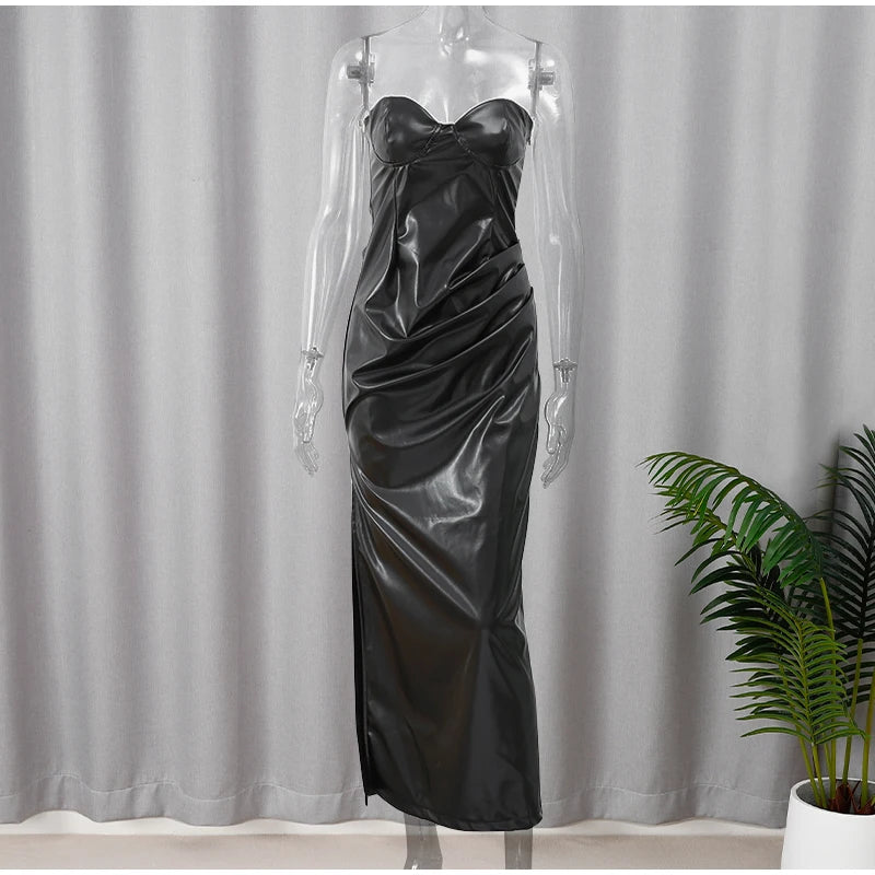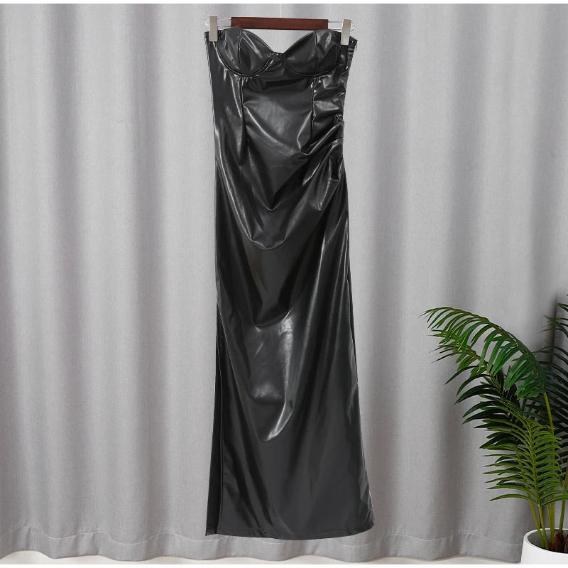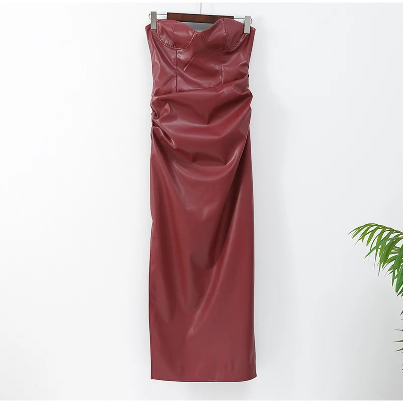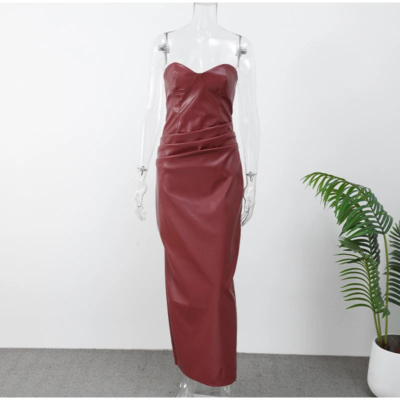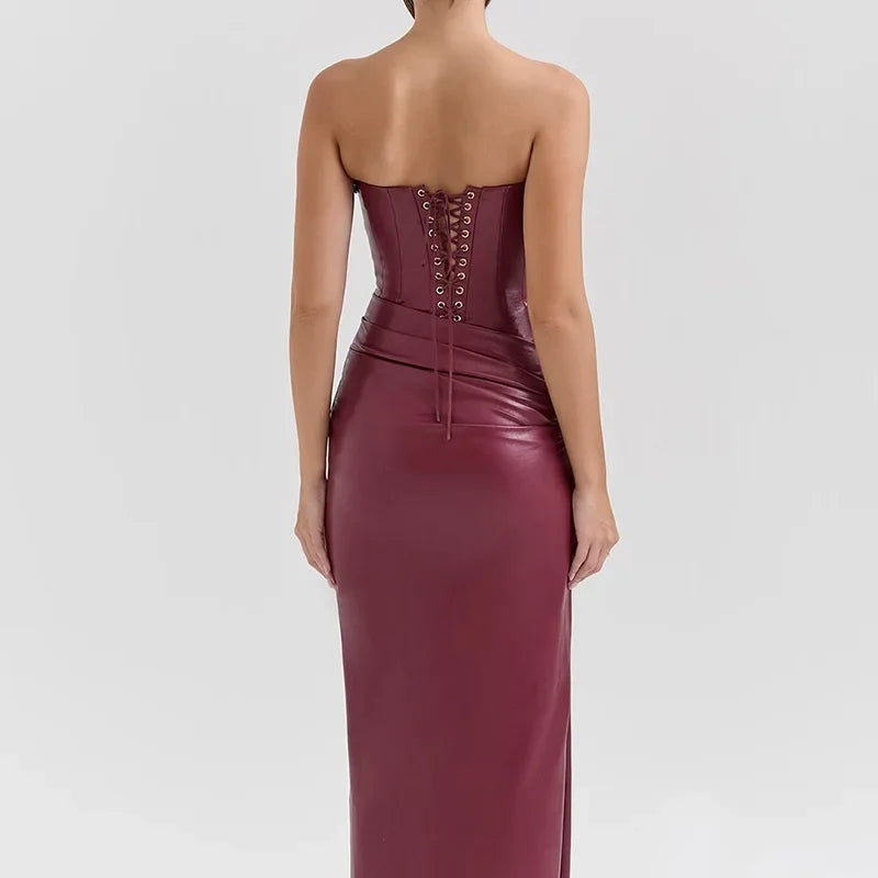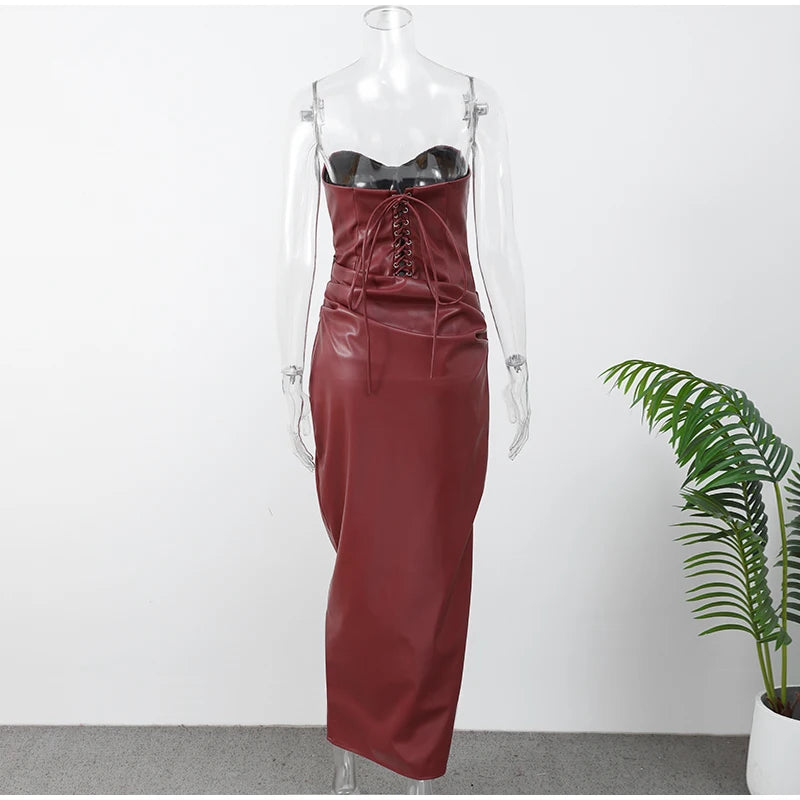 Sexy Woman Strapless Burgundy Slim Leather Long Dress Elegant Back Lace Up Side Slit Sleeveless Dresses 2025 Evening Party Robe