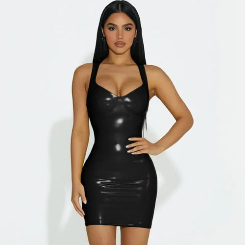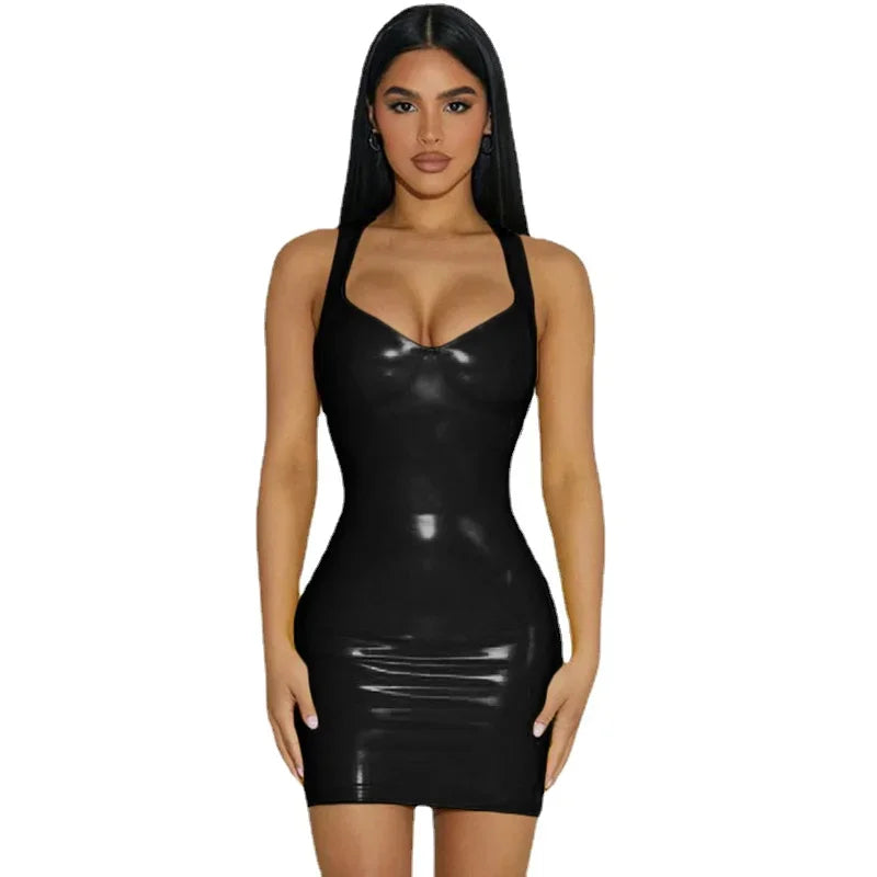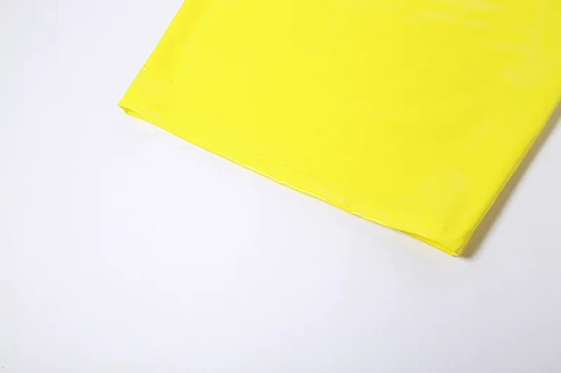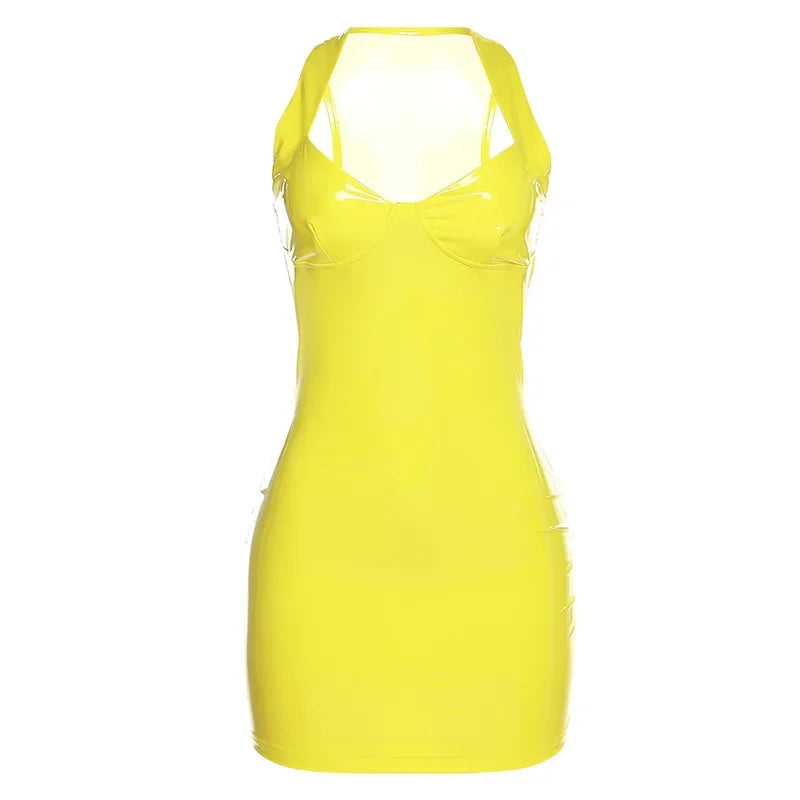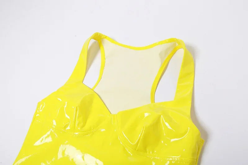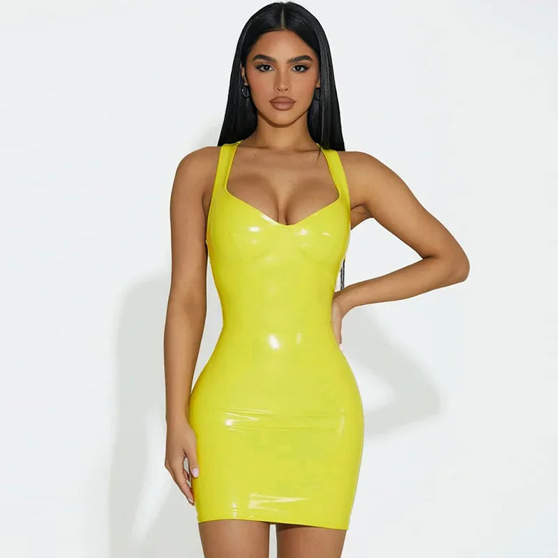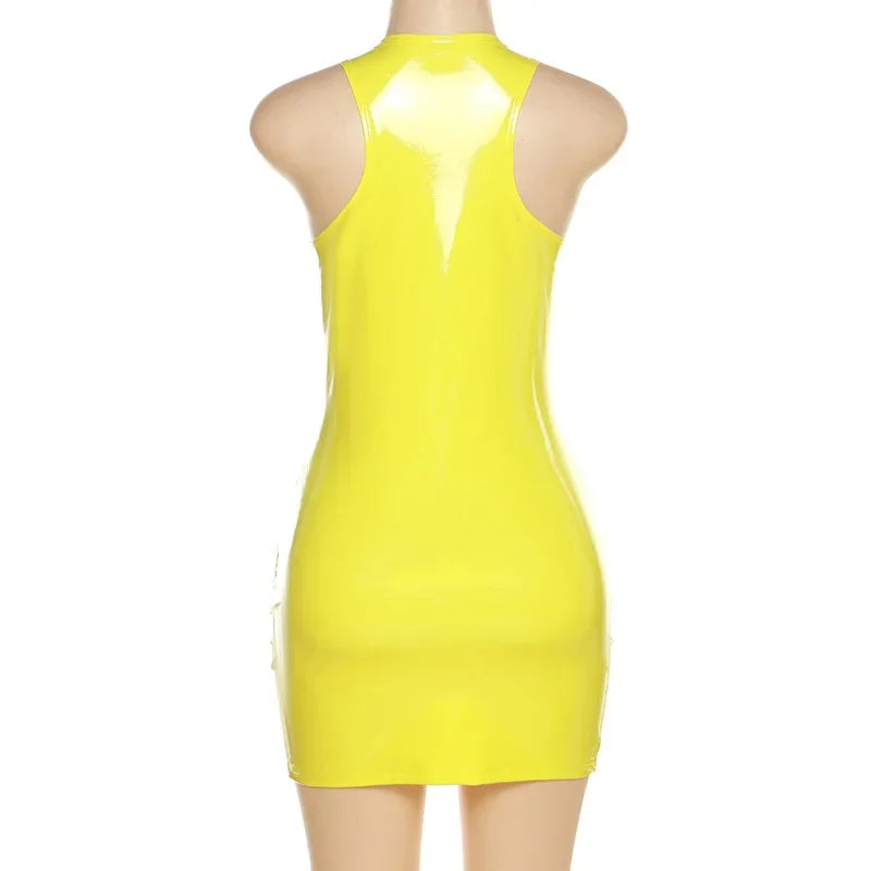 Sexy Womens Bodycon Yellow Mini Dresses Sleeveless Patent Leather Latex Tank Dresses Rave Party Night Club Costume
