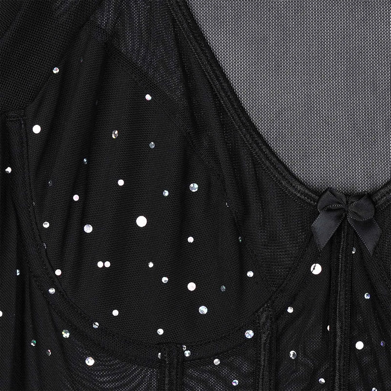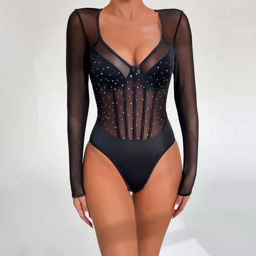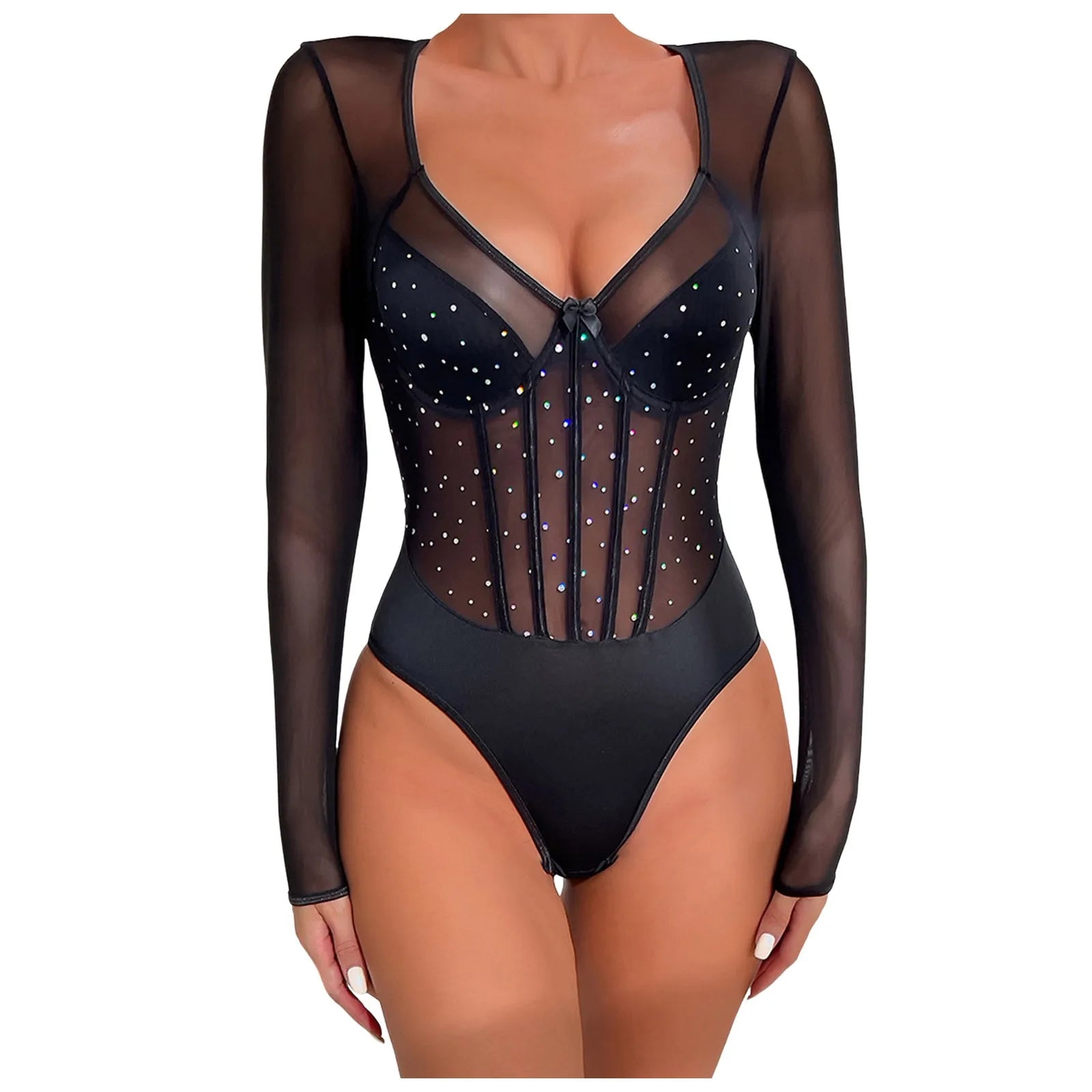 Women One-Piece Bodysuit Sexy Shiny Sequins Long Sleeve Bottoming Undershirts Deep V-Neck Mesh Jumpsuits Y2k Tops Mujer Clubwear